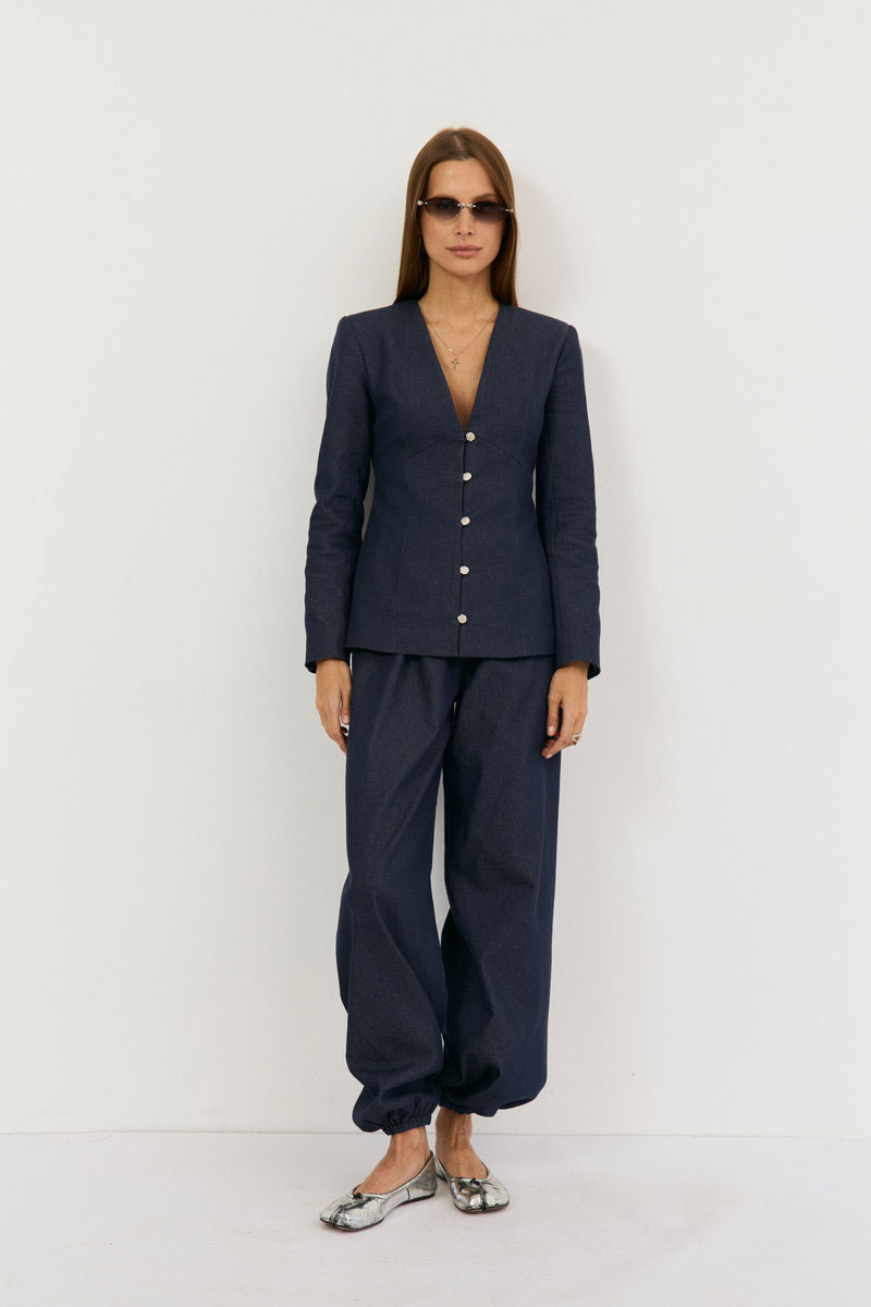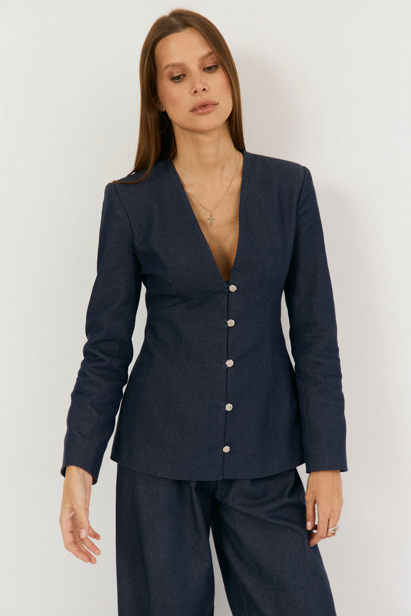 Жакет выполнен из легкой джинсовой ткани в глубоком синем цвете, жакет прилегающего силуэта с глубоким V-м вырезом, застежка центральная на навесные петли. Талия отрезная, Полочка и спинка верхней части с выточками, нижняя часть полочки с выточками и рельефами. Рукав втачной, двухшовный с плечевой накладкой. Жакет на подкладке из хлопка. Такой жакет максимально подчеркнет линию талии, сделает образ притягательным и женственным. Жакет можно ность самостоятельно с любым низом, например с атласной юбкой, белыми брюками или ддинсами, черным низом, а также с джинсами в тон основной ткани из нашей коллекции.