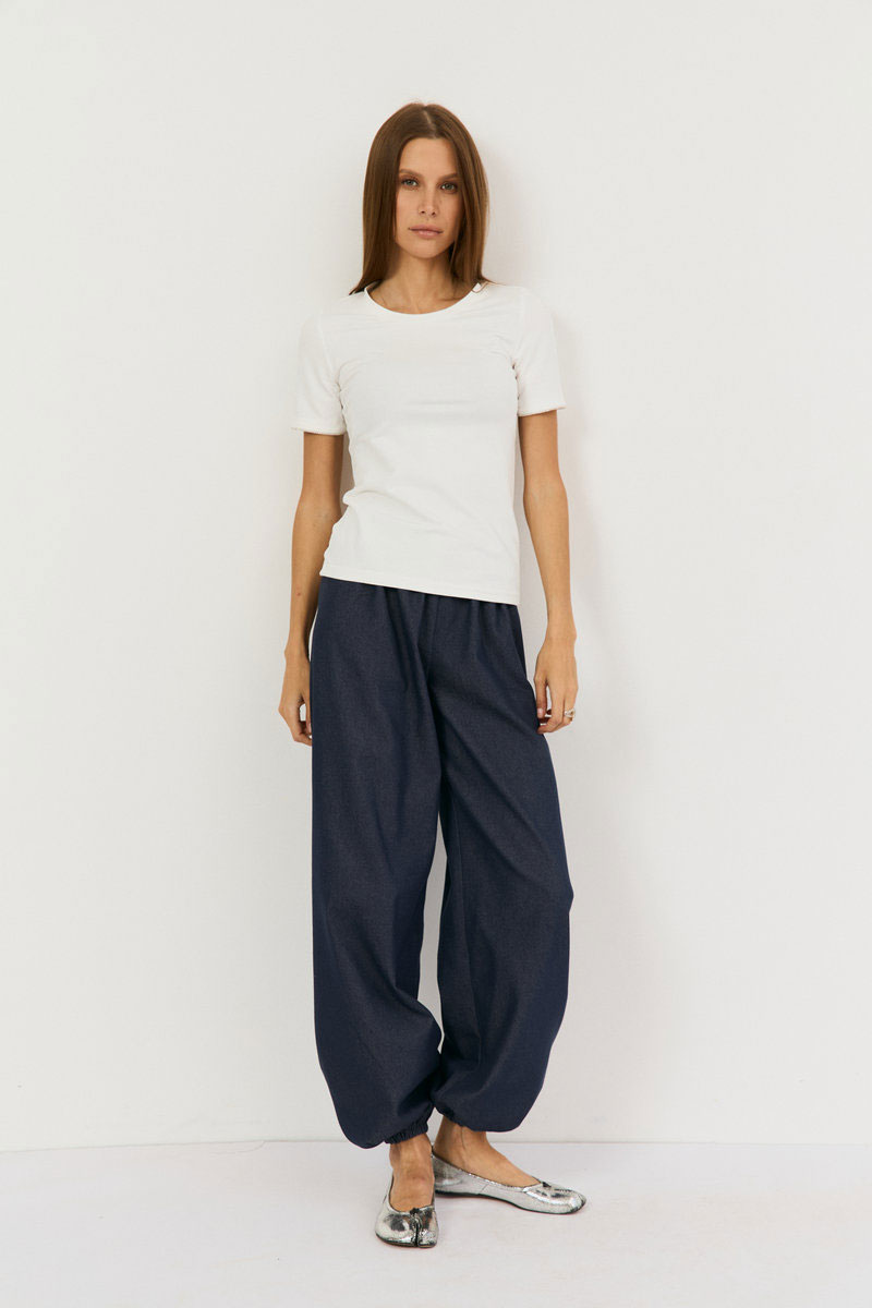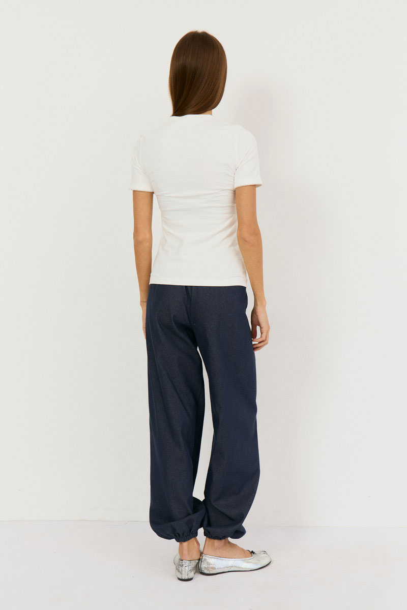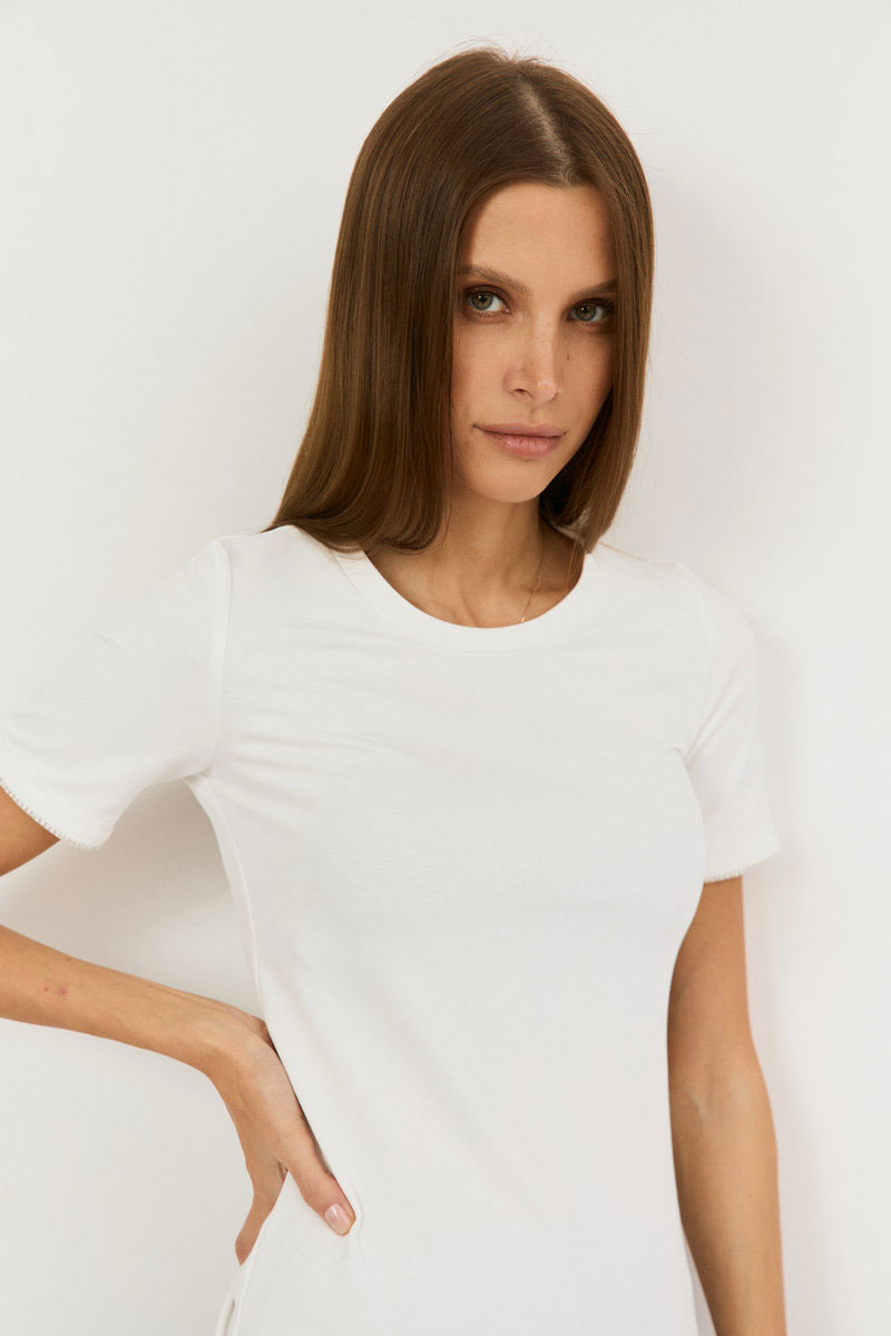 Базовая футболка, выполнена из хлопковой ткани (кулирка) , прилегающего силуэта с декоративной тесьмой со стразами по линии рукава .Рукава втачные. Вырез горловины круглый, обработан бейкой.