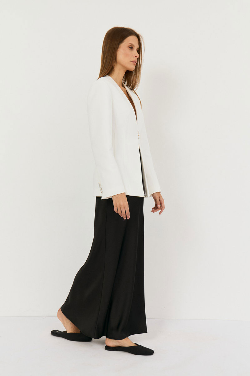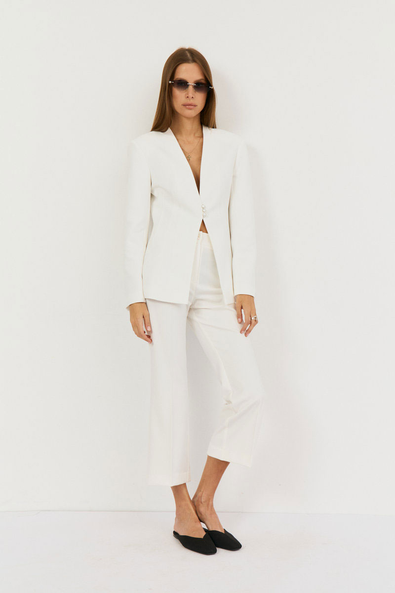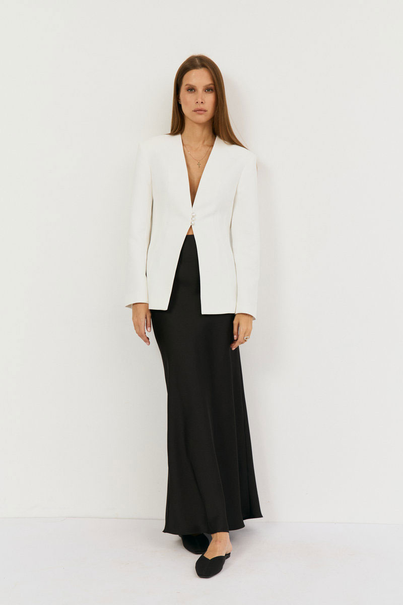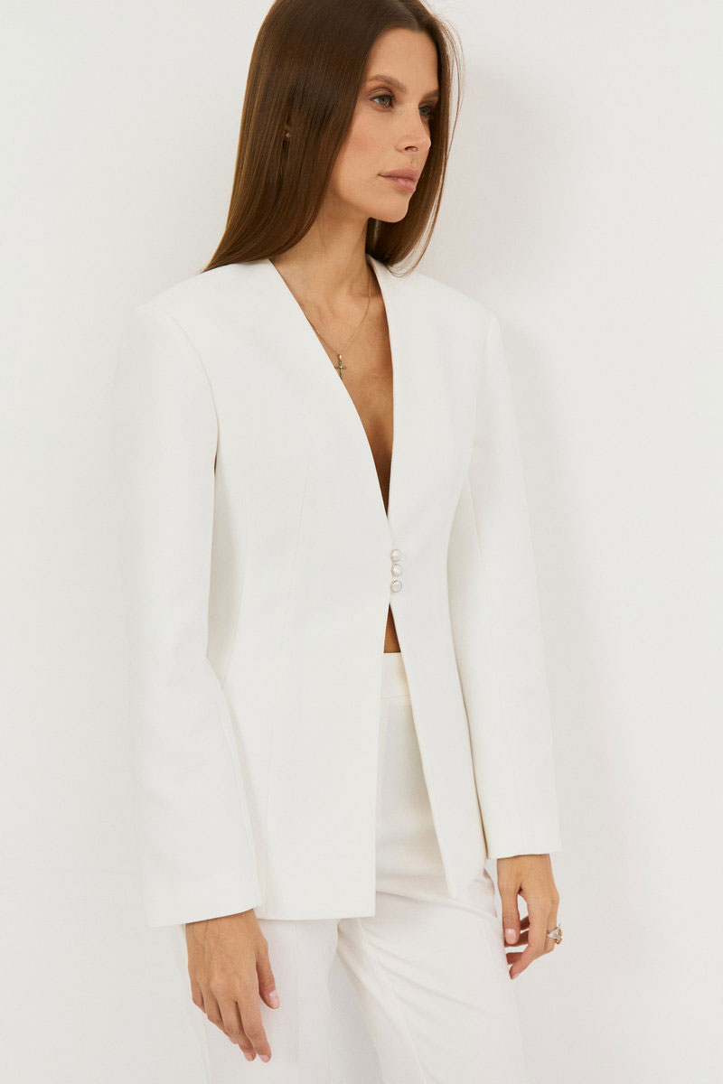 Жакет однобортный с тремя навесными петлями-пуговицами, на подкладке, полуприлегающего силуэта. Воротник втачной-стойка, рукав двухшовный, спинка жакета разрезная по центру с двумя талиевыми выточками, по передву - две талиевые выточки. Жакет выполнен из костюмной ткани.
