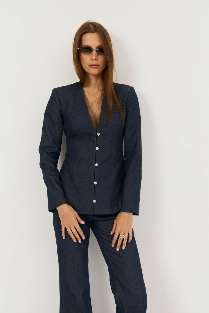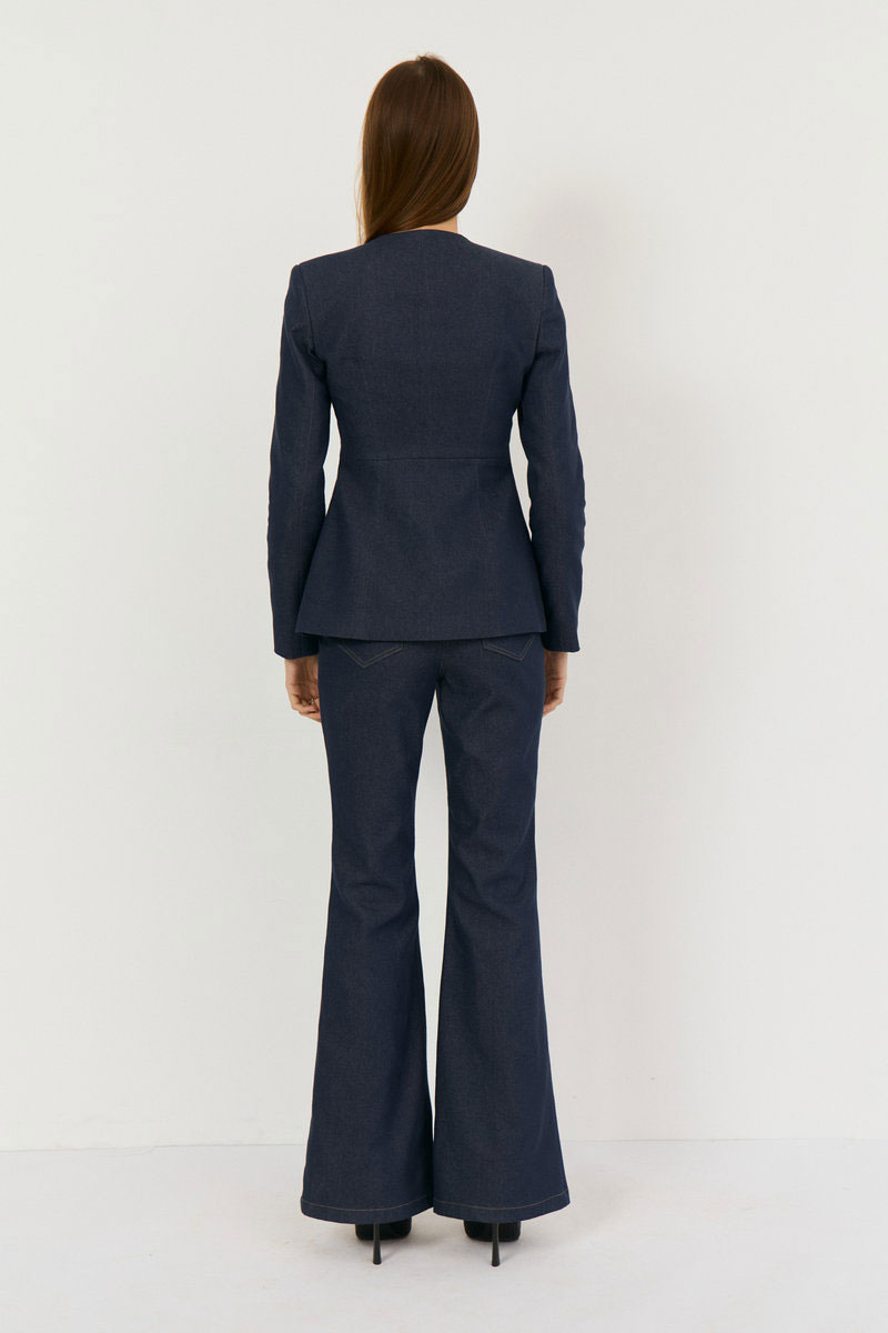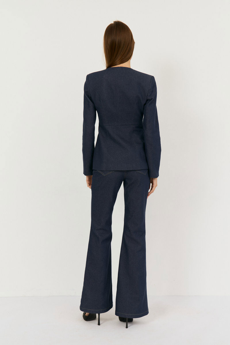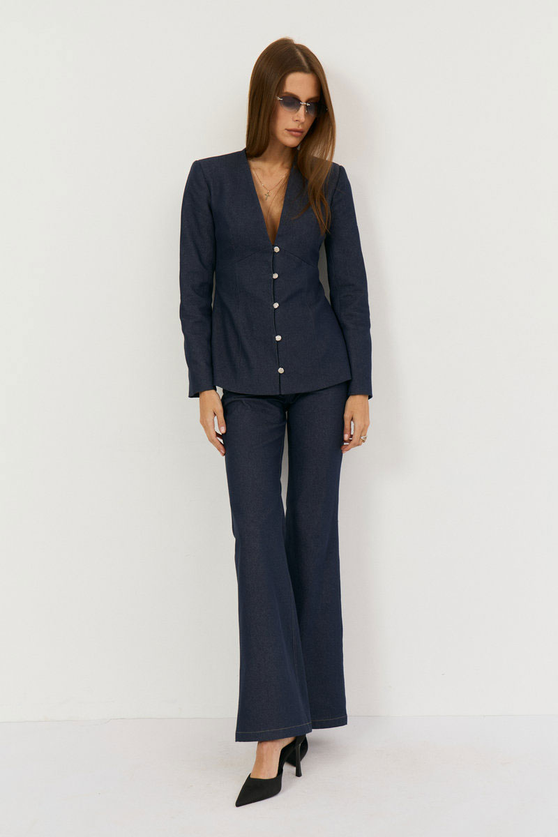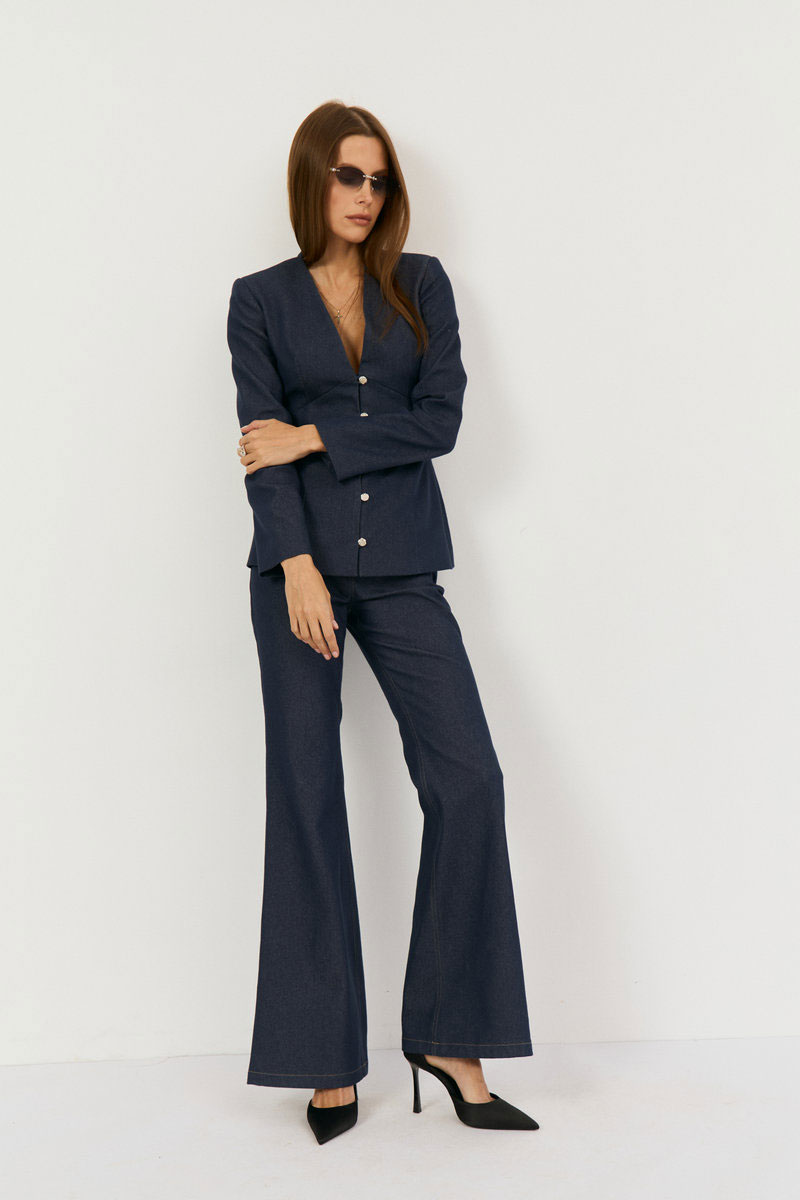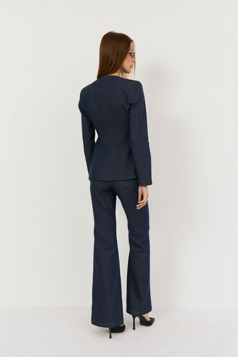 Комплект двухпредметный из жакета и брюк. Жакет выполнен из легкой джинсовой ткани в глубоком синем цвете, жакет прилегающего силуэта с глубоким V-м вырезом, застежка центральная на навесные петли. Талия отрезная, Полочка и спинка верхней части с выточками, нижняя часть полочки с выточками и рельефами. Рукав втачной, двухшовный с плечевой накладкой. Жакет на подкладке из хлопка. Классические расклешенные джинсы выполнены из легкой джинсовой ткани в темно-синем цвете, брюки прилегающего силуэта с высокой посадкой, пояс притачной со шлевками, застежка на молнию и кнопку. По переду расположены карманы. На задней половинке брюк отрезная кокетка и накладные карманы.