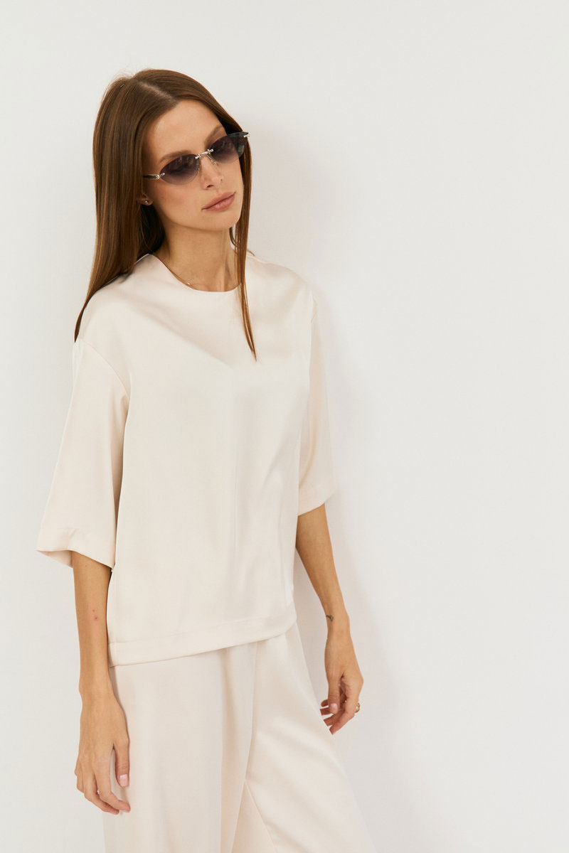 Топ свободного кроя, выполнен из плотной атласной ткани, горловина округлая, на обтачке, сзади застежка на одну петлю-пуговицу. Рукав втачной, линия плеча спущена.