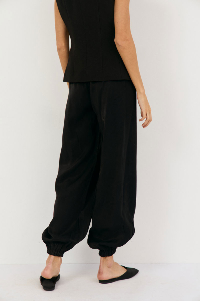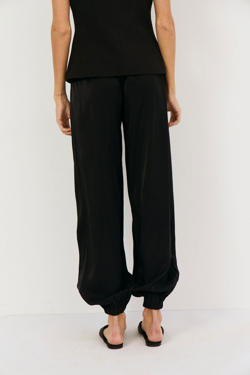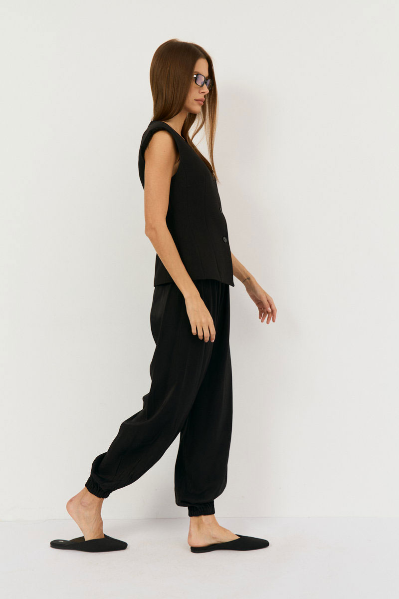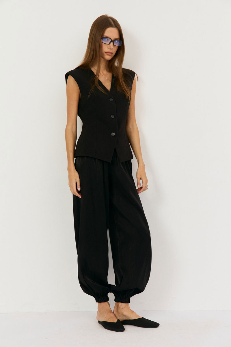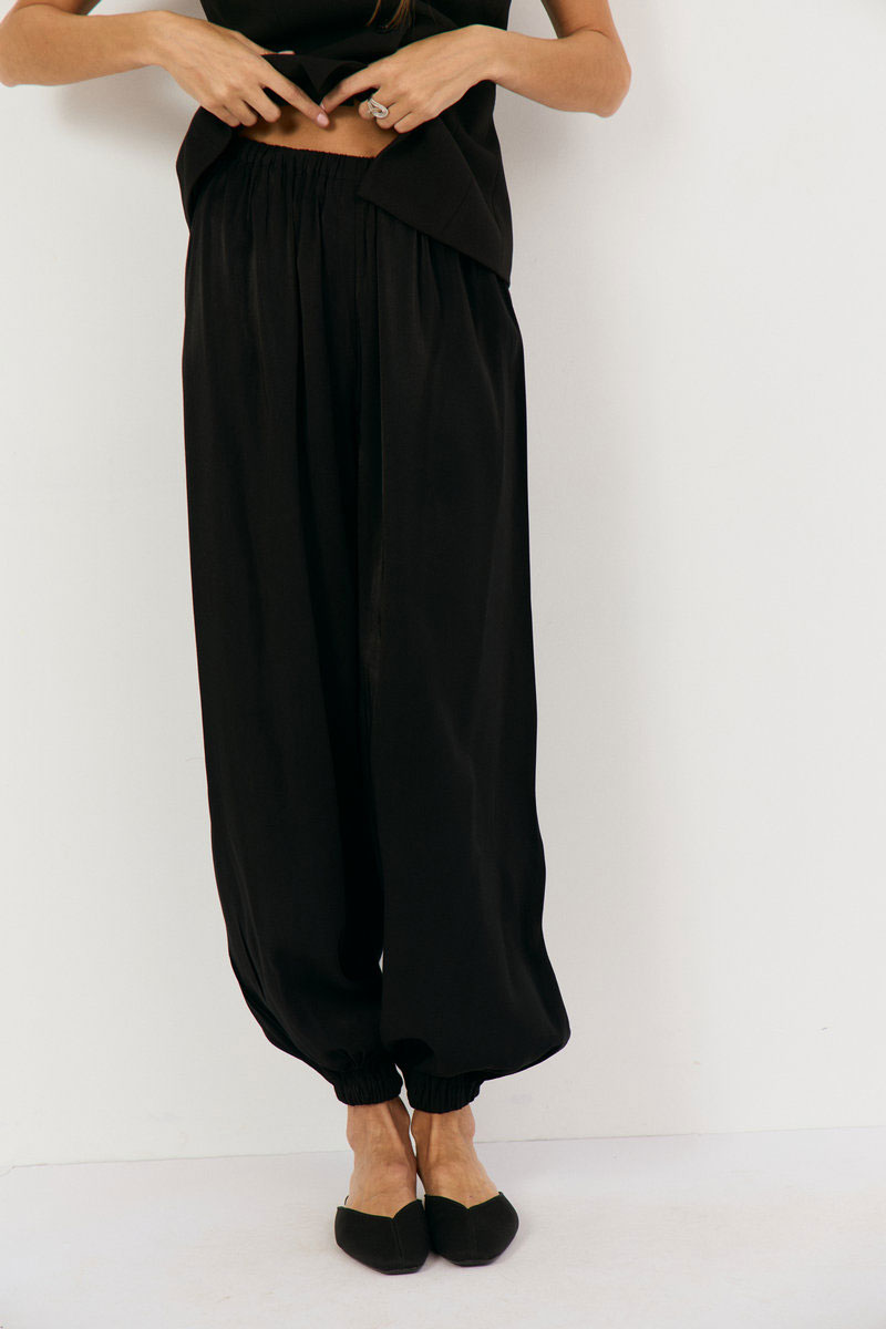 Брюки-алладины свободного кроя выполнены из черной вискозы с блеском , талия на резинке, по низу на резинке, что позволяет регулировать высоту брючины. Подойдет на праздник, на повседневный вариант, брюки можно носить с топом, рубашками, блузами. Обувь может быть абсолютно любая: спортивная, вьетнамки, классические туфли, босоножки.
