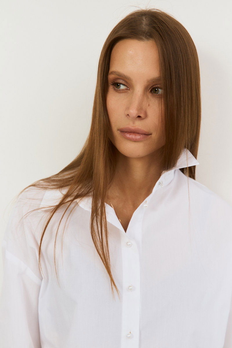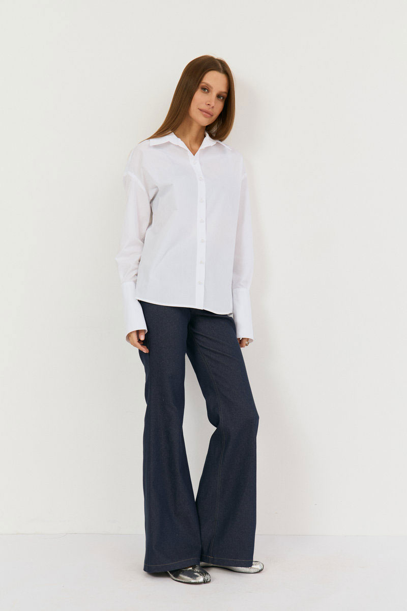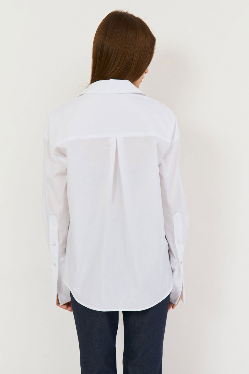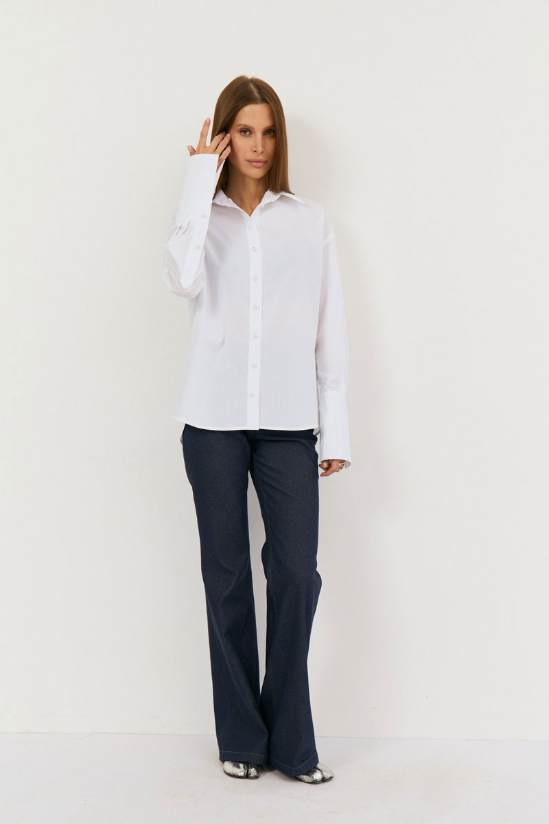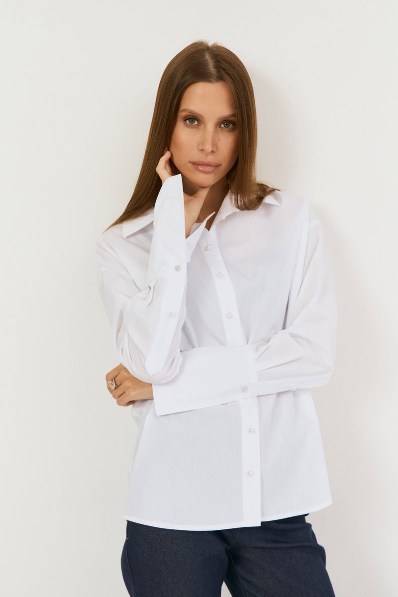 Рубашка свободного кроя. Рукав рубашечный, линия плеча спущена, рукав с притачной, с отложной манжетой. Застёжка центральная на петли - пуговицы. Низ блузки фигурной формы. Воротник стояче-отложной с отрезной стойкой. Застежка центральная - на петли пуговицы . Рубашка - база в гардеробе, сочетать можно с атласными брюками, юбками из кожи, трикотажными изделиями. Акцент - жемчужные пуговицы, на горловине и рукавах - пуговицы из камня.