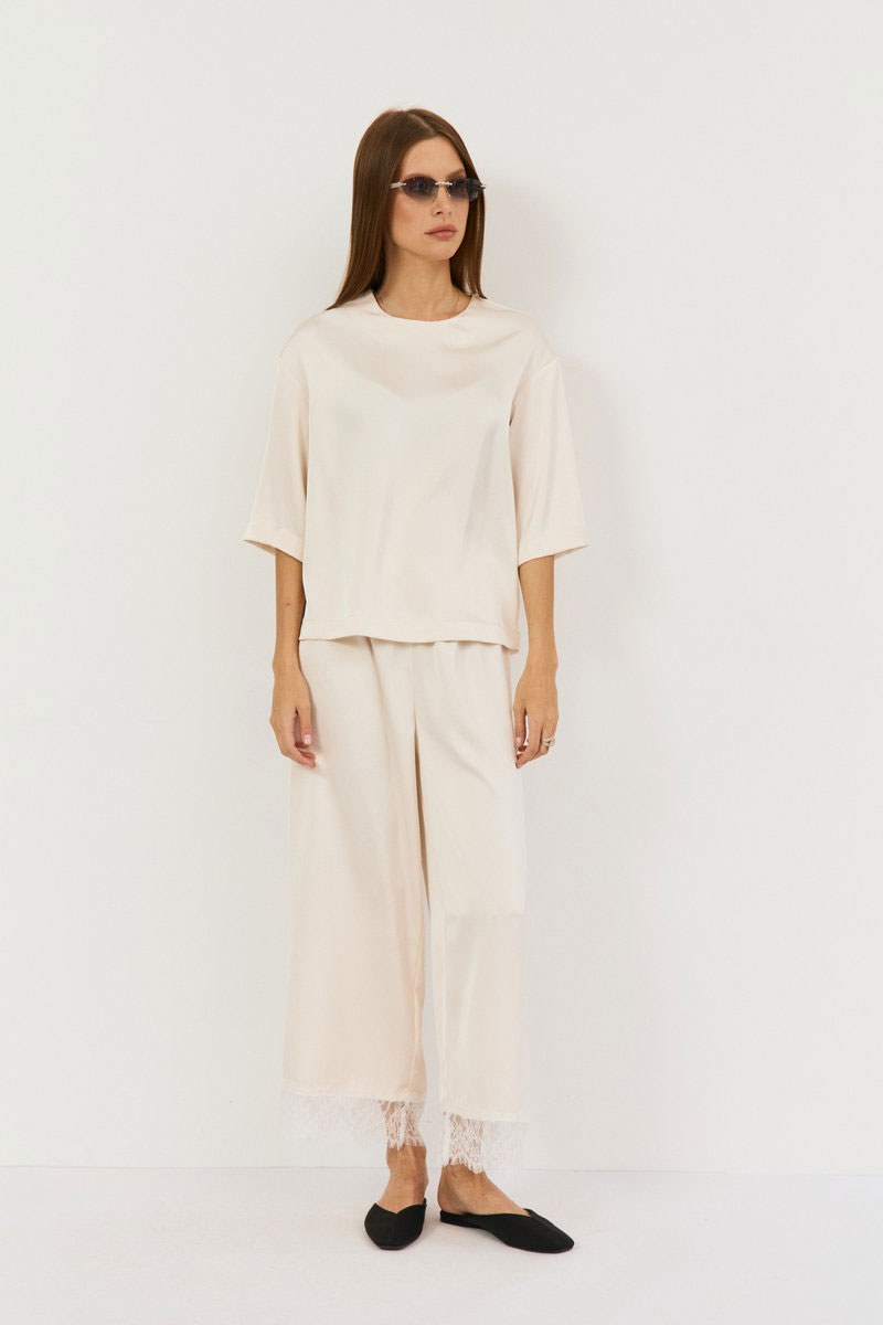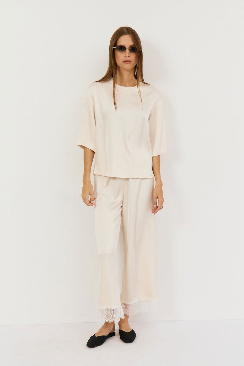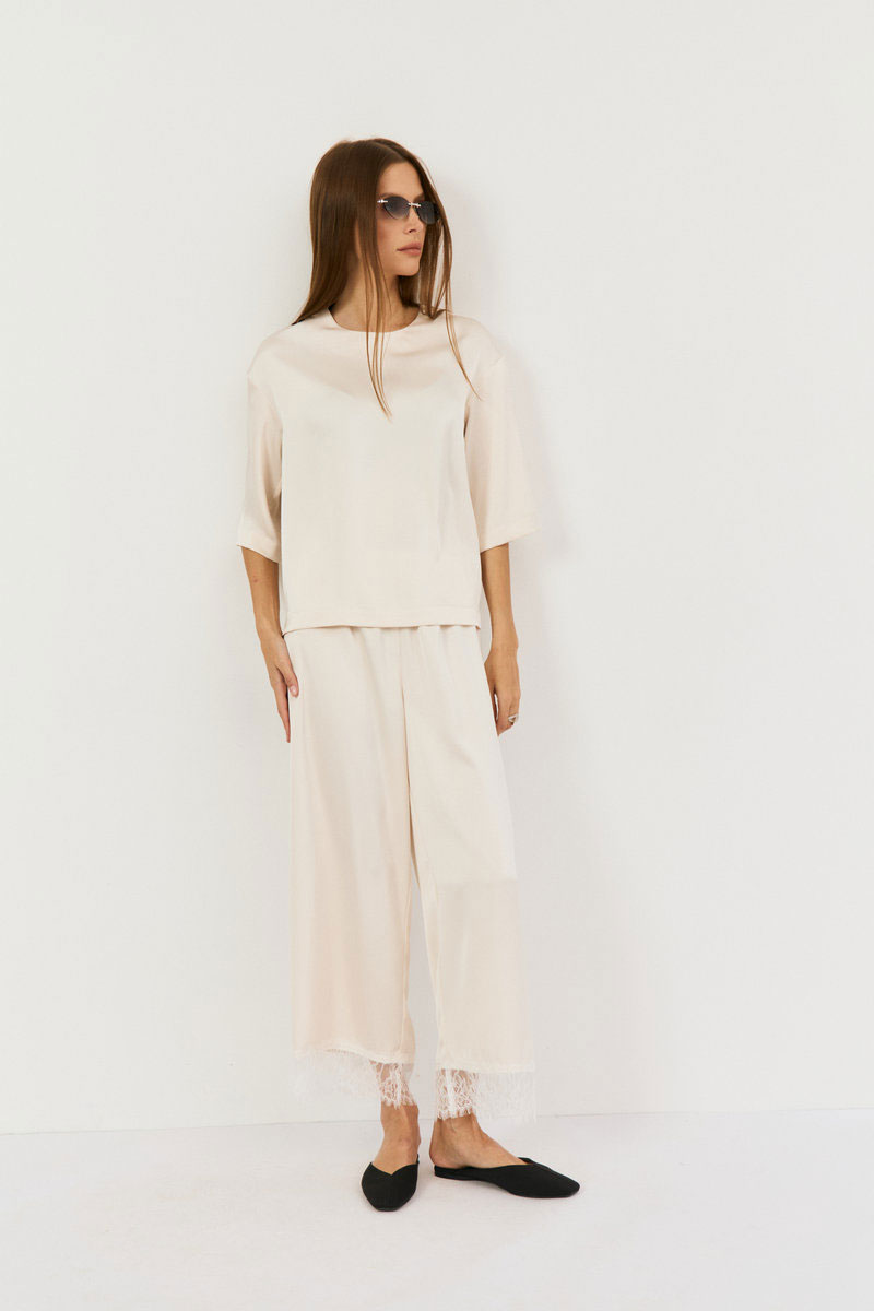 Комплект двухпредметный, состоит из топа и брюк. Прямые, укороченные брюки свободного кроя из атласной плотной ткани, талия на резинке , по низу отстроченные французским кружевом. Топ свободного кроя, выполнен из плотной атласной ткани, горловина округлая, на обтачке, сзади застежка на одну петлю-пуговицу. Рукав втачной, линия плеча спущена.