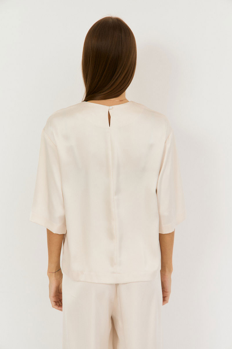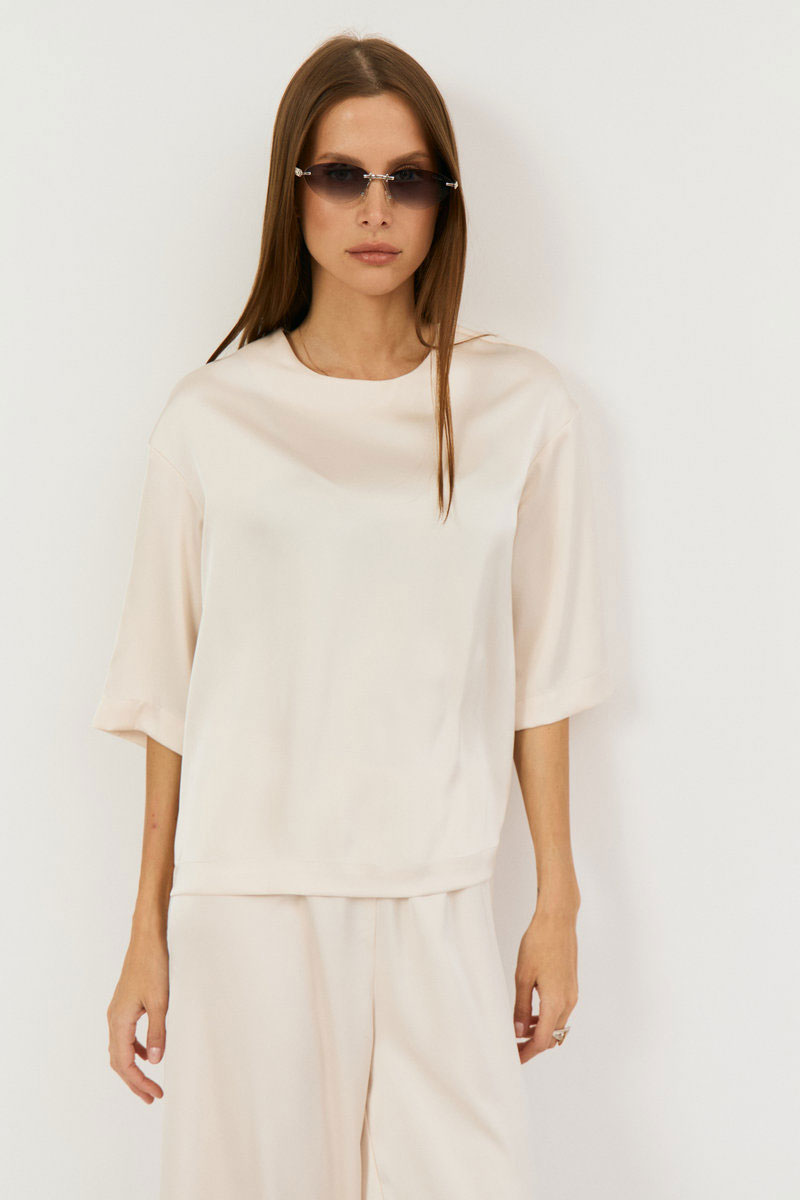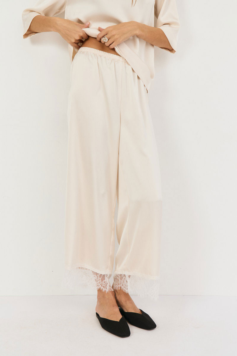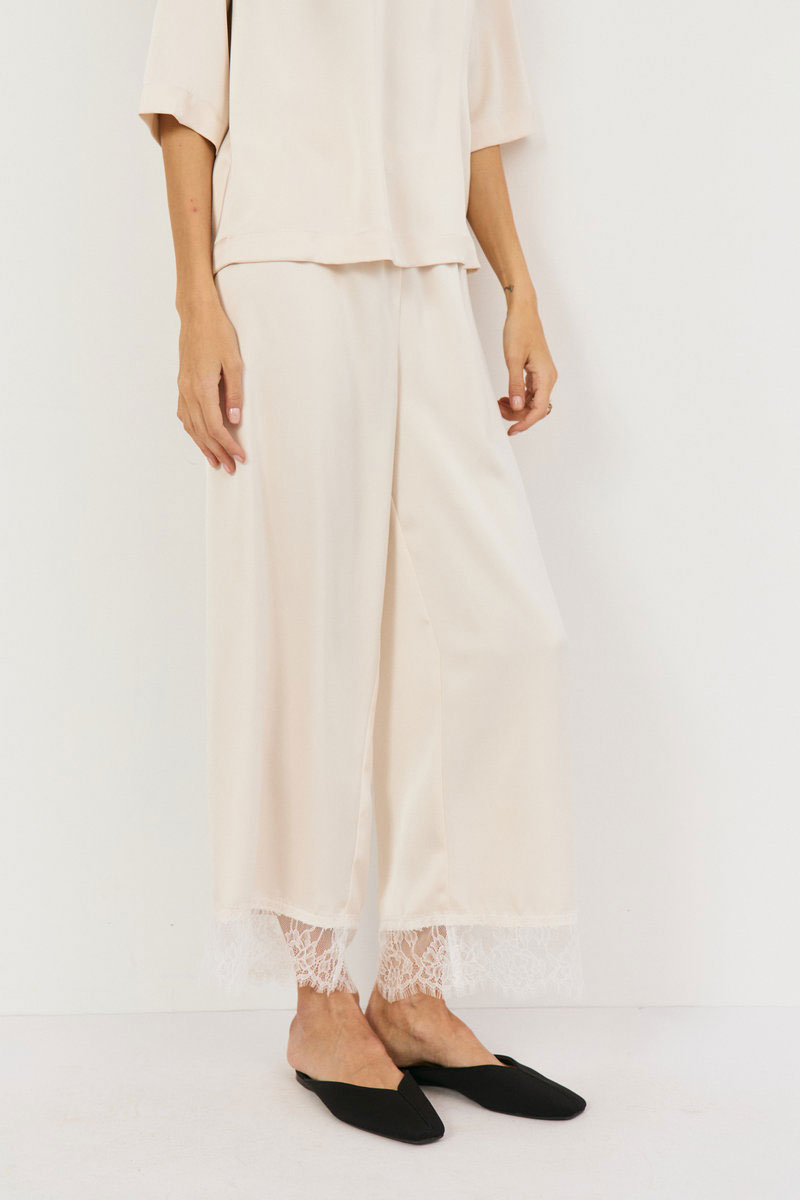 Комплект двухпредметный, состоит из топа и брюк. Прямые, укороченные брюки свободного кроя из атласной плотной ткани, талия на резинке , по низу отстроченные французским кружевом. Топ свободного кроя, выполнен из плотной атласной ткани, горловина округлая, на обтачке, сзади застежка на одну петлю-пуговицу. Рукав втачной, линия плеча спущена.