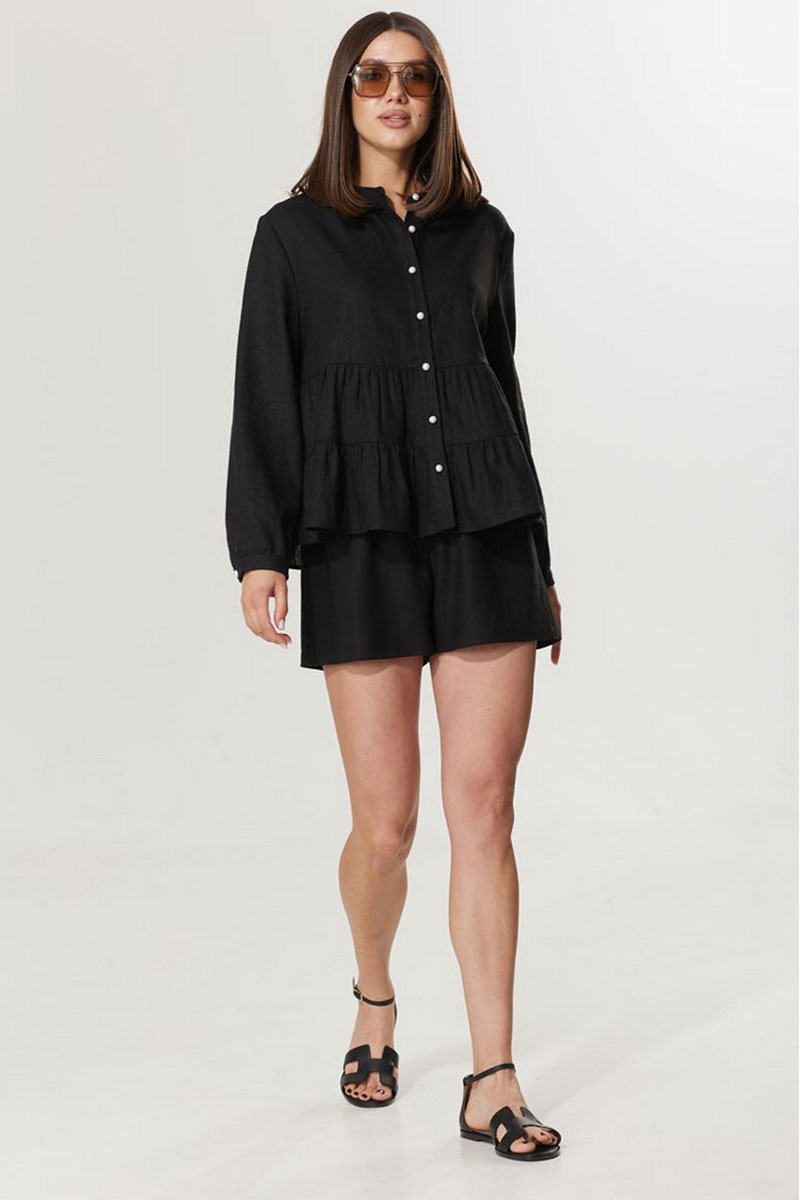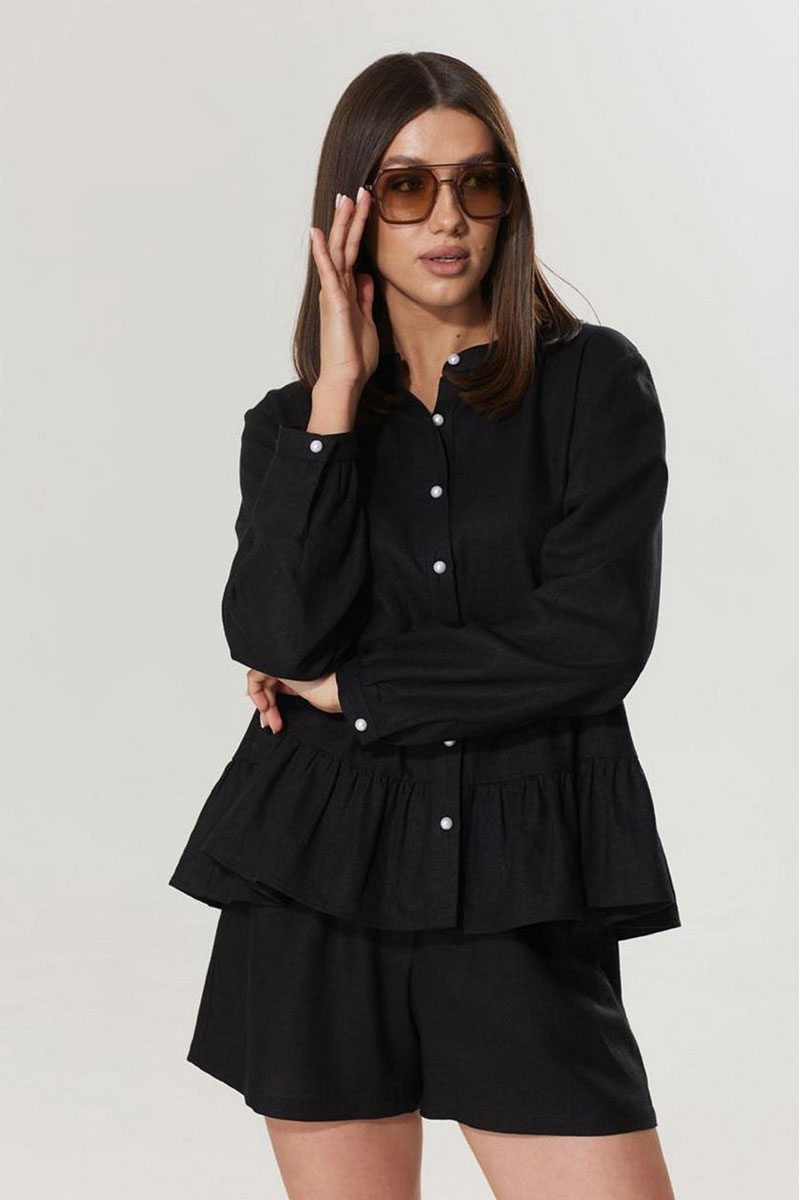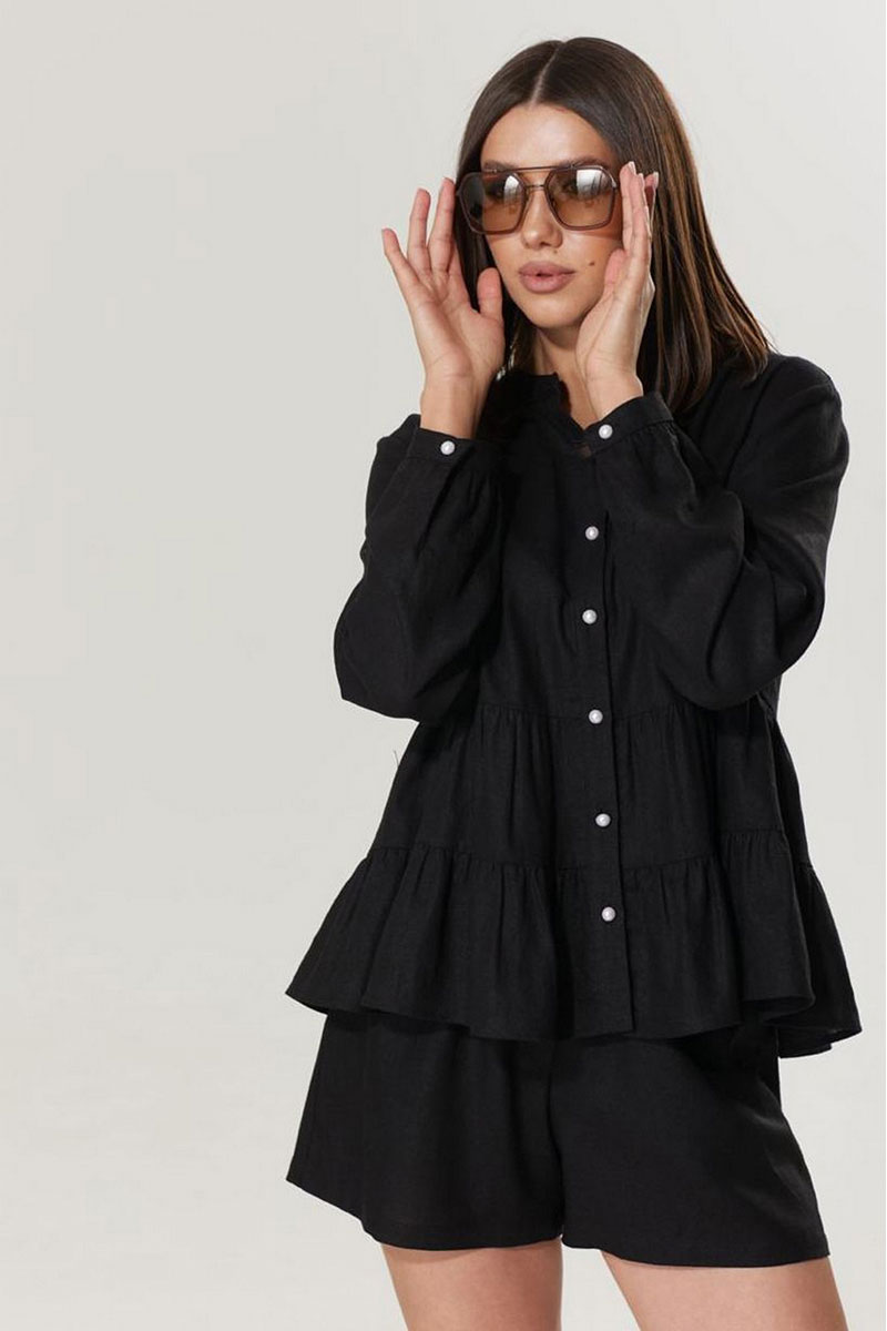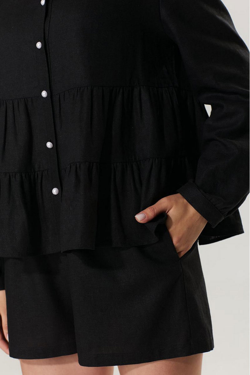 Летняя женская блузка из легкой льняной ткани с добавлением вискозы. Блуза свободная, А-образного силуэта, с тремя ярусами на сборке. Рукава втачные, длинные. Низ рукава присборен на