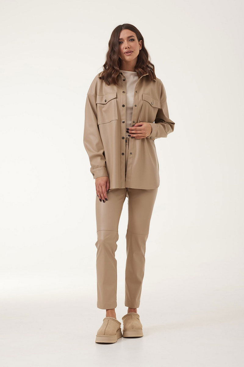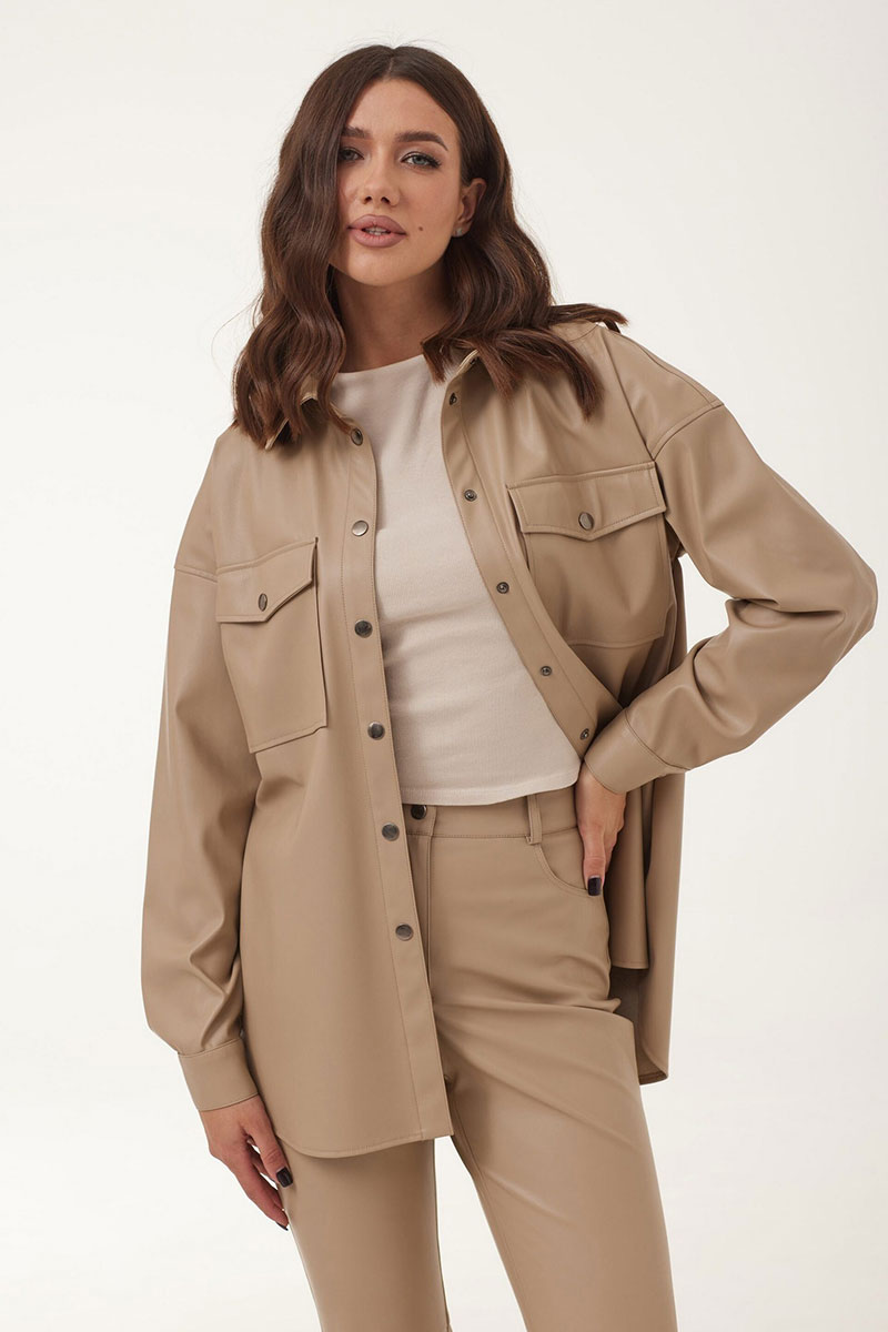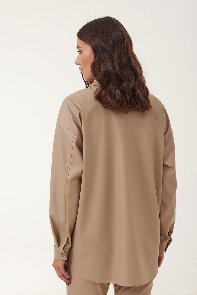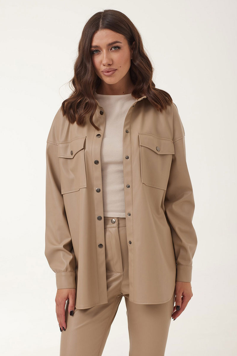 Рубашка женская прямого силуэта, выполнена из эко-кожи бежевого цвета. Вырез горловины округлый с отложным воротником. Застежка центральная на кнопки. По полочке на уровне груди