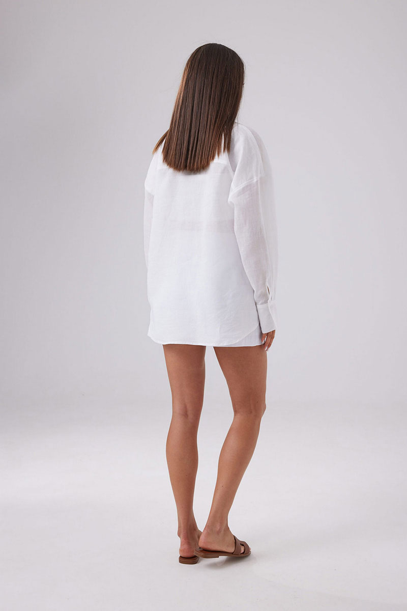 Рубашка женская свободного силуэта, выполнена из волокна крапивы белой. Вырез горловины округлый, воротник рубашечный. Застежка центральная на петли и пуговицы. Линия плеча расширена, рукав спущен. Рукава втачные одношовные, длинные, по низу рукава широкий манжет.