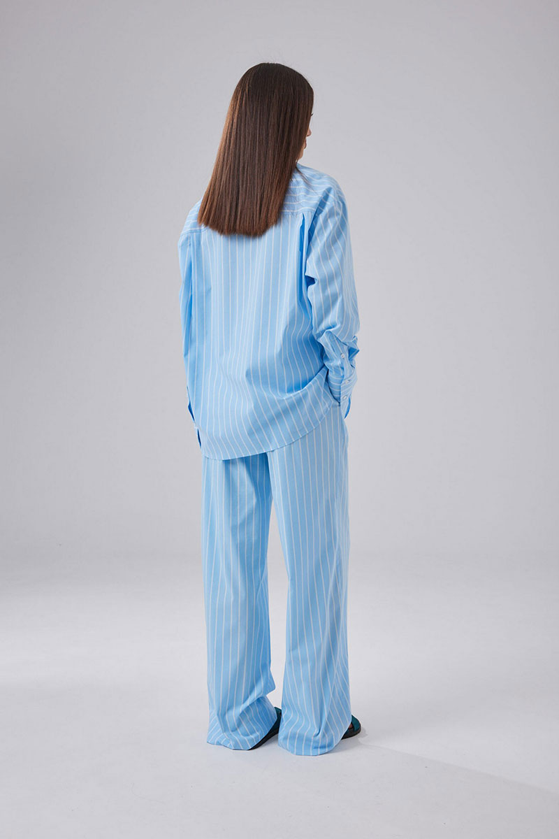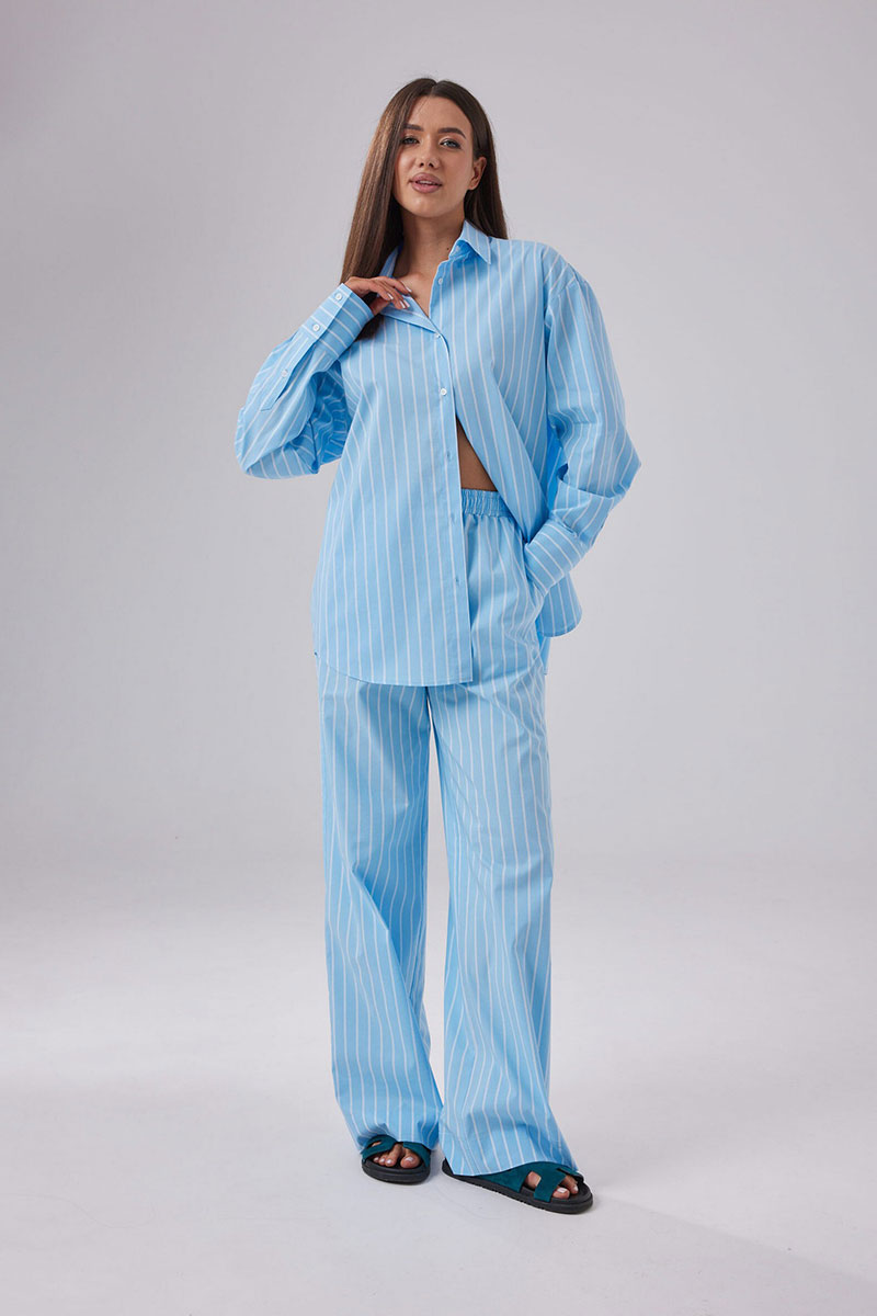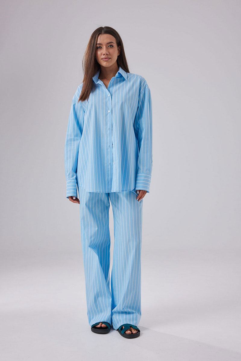Женская рубашка свободного силуэта, выполнена из хлопковой ткани голубого цвета в полоску. Горловина с классическим рубашечным воротником. Застежка центральная на петли и пуговицы.