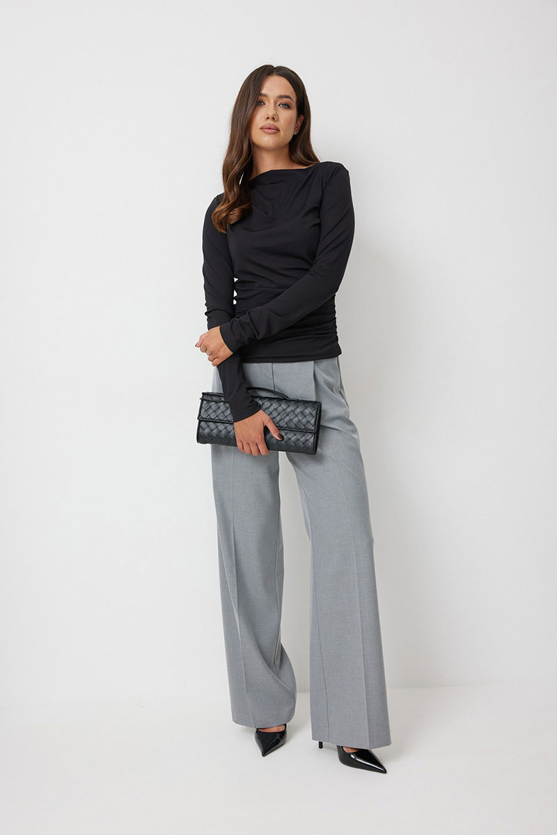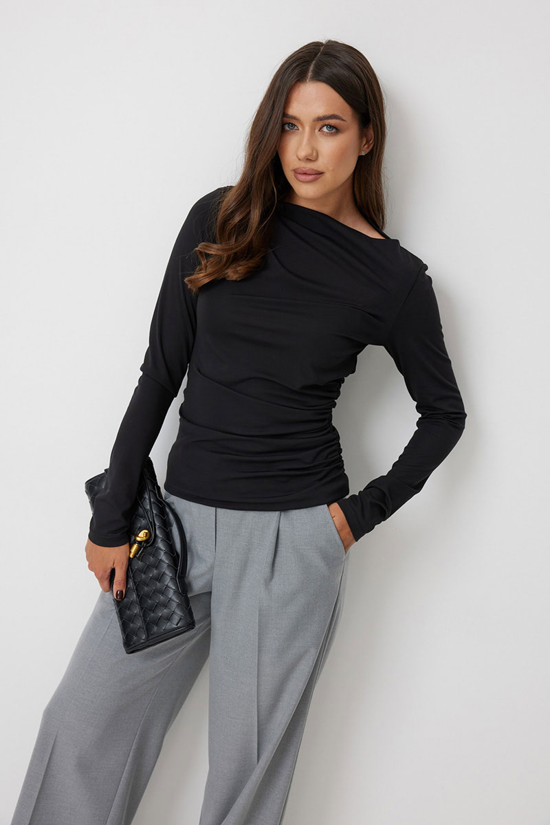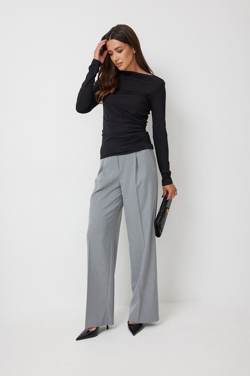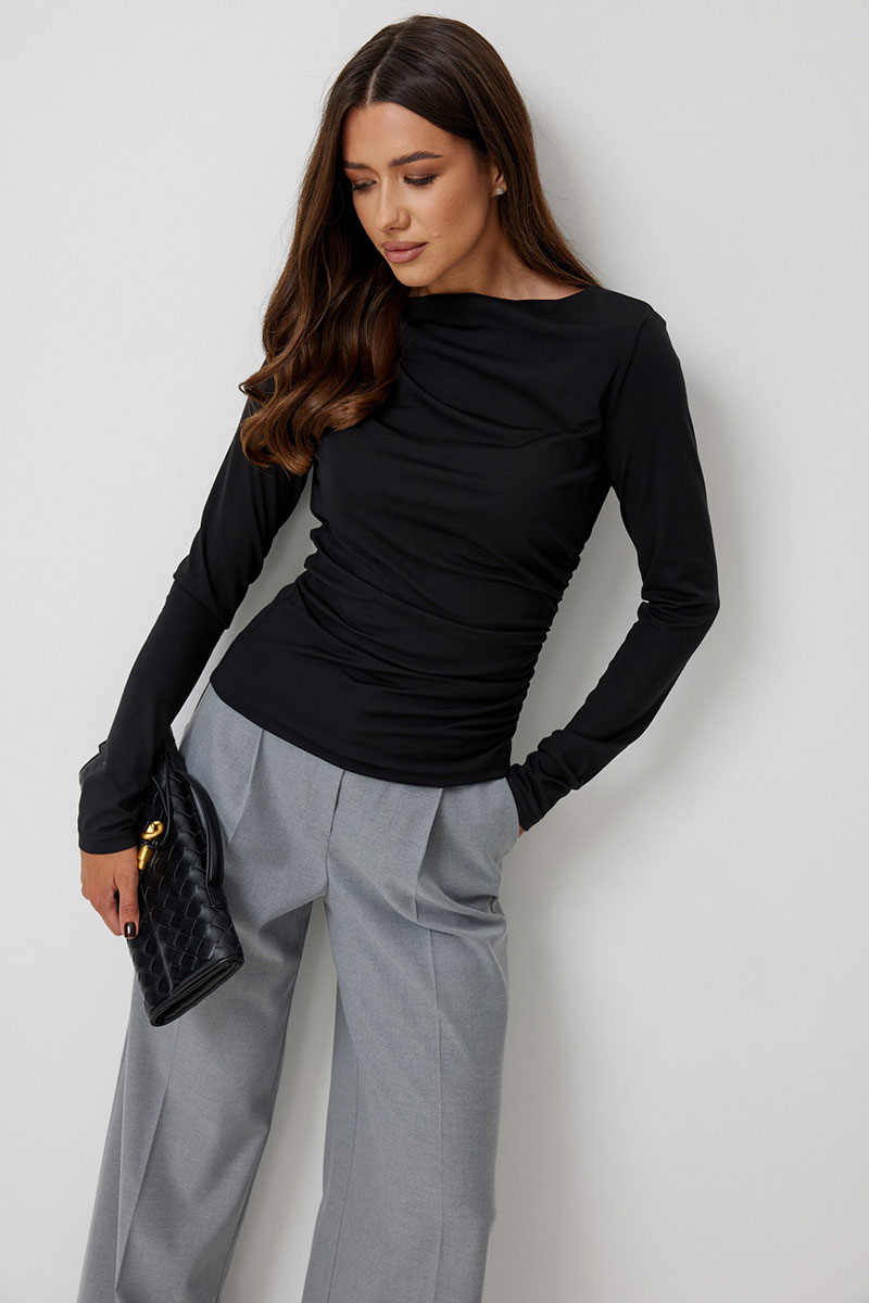 Джемпер женский прилегающего силуэта, выполнен из тонкого трикотажного полотна. По левому боковому шву джемпер присборен. Вырез горловины лодочкой. Рукава длинные, втачные одношовные. Спинка без среднего шва.