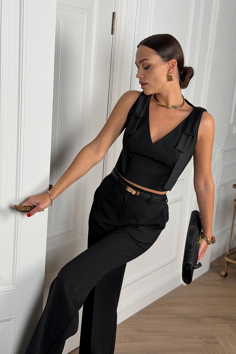 Женский укороченный топ — идеальный выбор для создания элегантного и нарядного образа. Выполнен из текстильной ткани на поливискозной подкладке. Вырез горловины V-образный. По плечевым швам декоративные детали из атласных лент. Топ без рукавов. Застежка на потайную молнию в среднем шве спинки. Этот топ станет роскошным дополнением к юбке или брюкам для любого праздничного мероприятия. На фото с брюками М380.