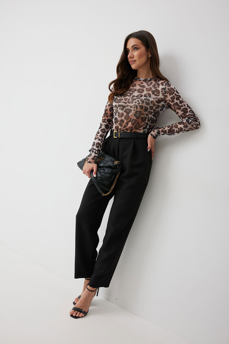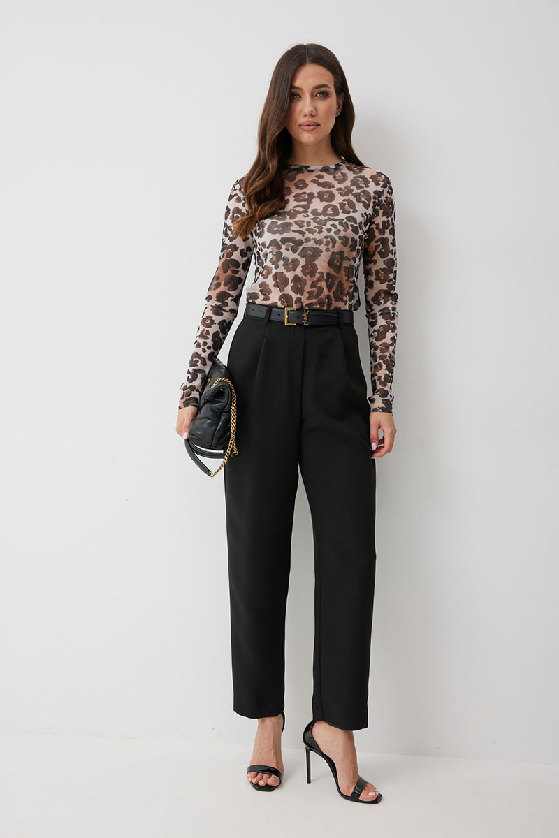 Джемпер прилегающего силуэта из прозрачной ткани-сетки с леопардовым принтом. Модель с классическим округлым вырезом горловины и длинными втачными рукавами. Носите джемпер как