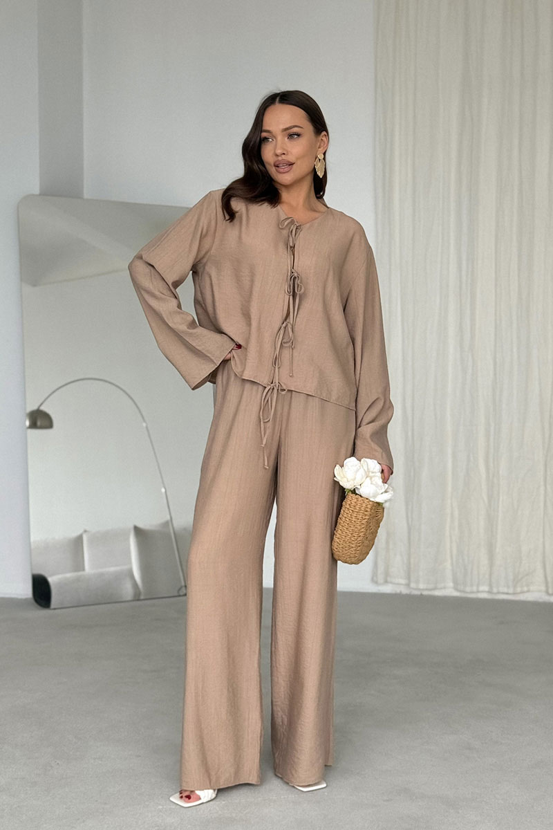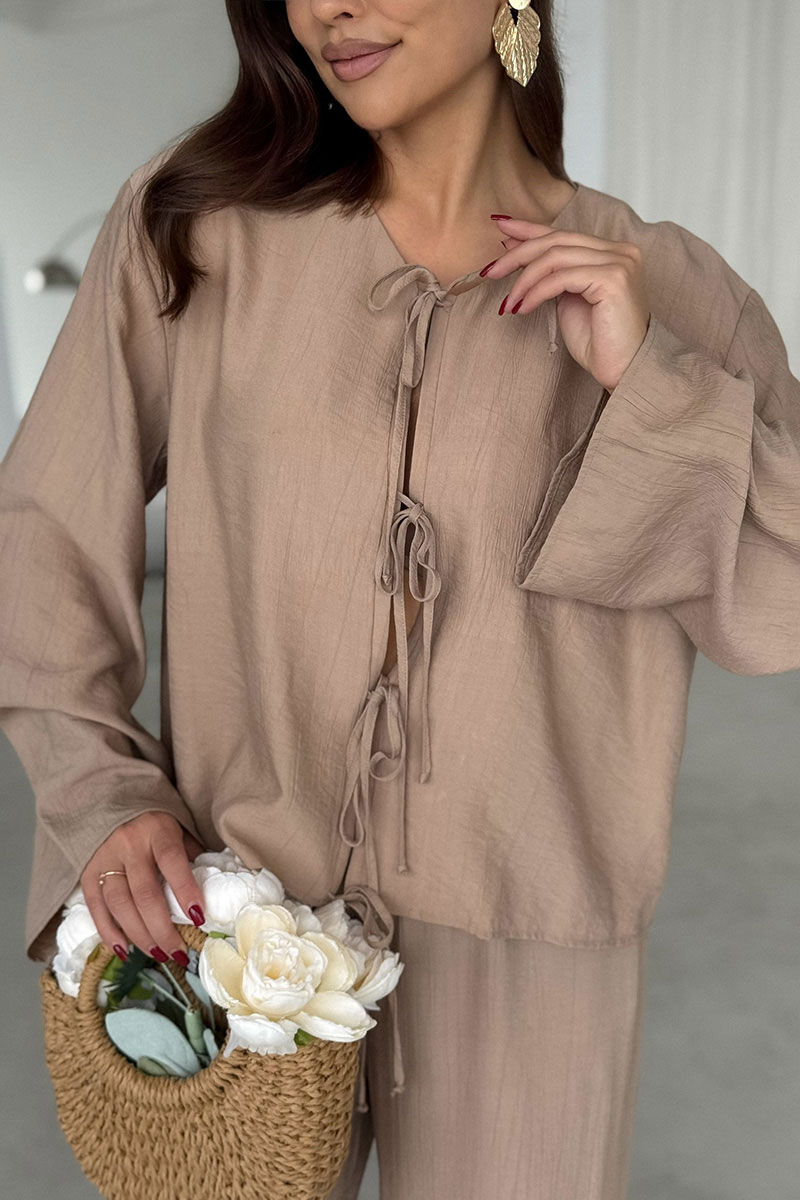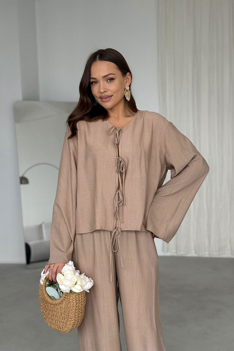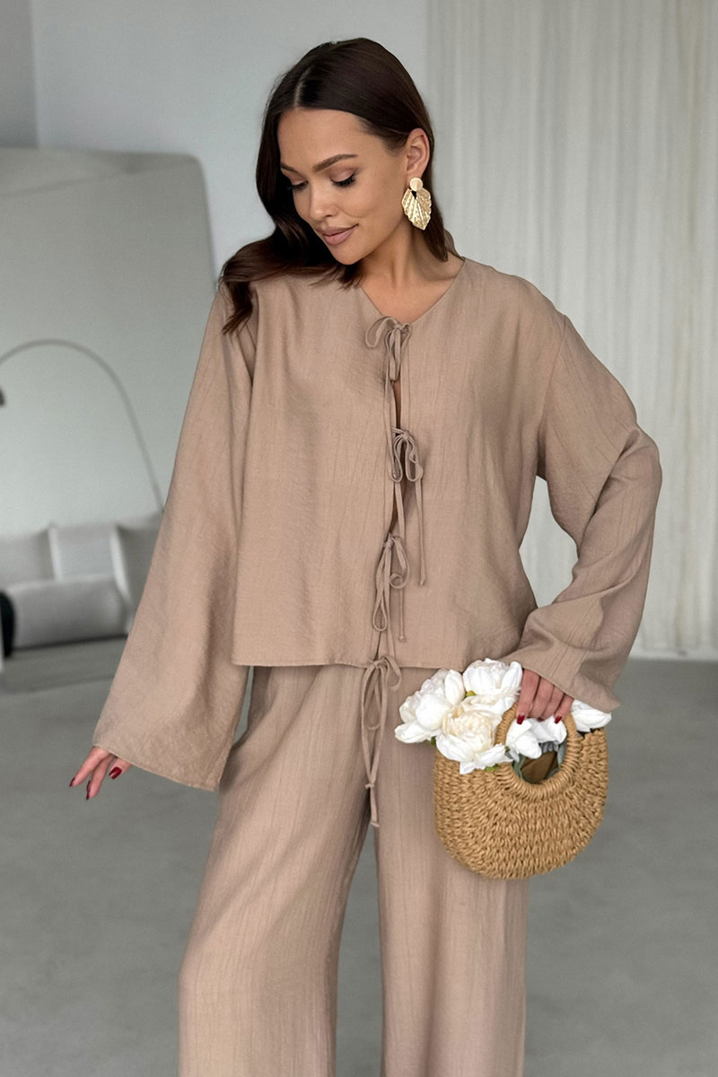 Свободный силуэт не сковывает движений и подходит для разных типов фигуры. Вырез горловины округлый, без воротника. Застежка центральная на завязках из основной ткани. Линия плеча