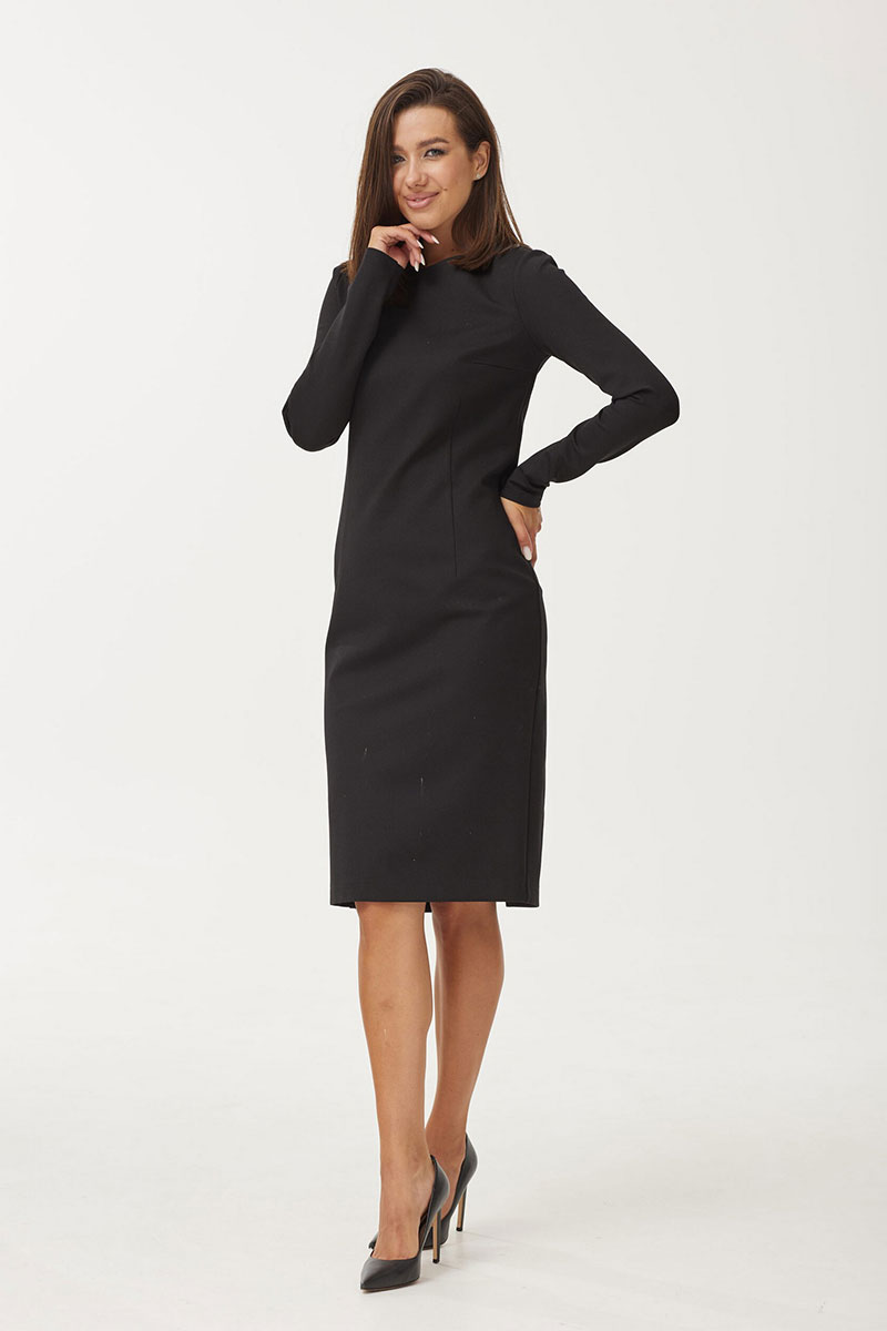 Платье женское прилегающего силуэта, длиной миди, выполнено из черного трикотажного полотна. Горловина округлая. По полочке талиевые вытачки. Рукава втачные одношовные, длинные. Спинка со средним швом, вверху которого застежка на потайную молнию. Внизу среднего шва разрез.