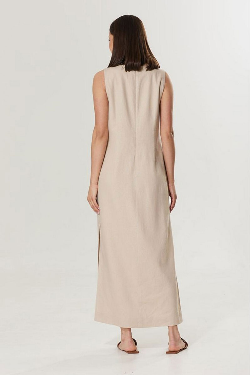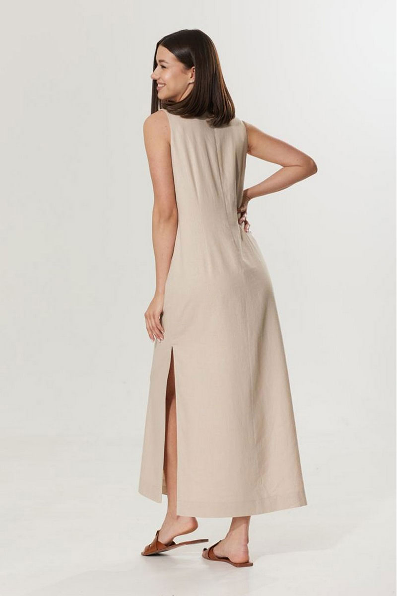 Летнее женское платье без рукавов из легкой льняной ткани с добавлением вискозы. Платье длины макси прямого силуэта, с двумя разрезами по боковым швам. Горловина V-образной формы с акцентной отстрочкой. Спинка со средним швом, с застежкой на потайную молнию. В боковых швах функциональные карманы. Платье на подкладке из хлопчатобумажной ткани.