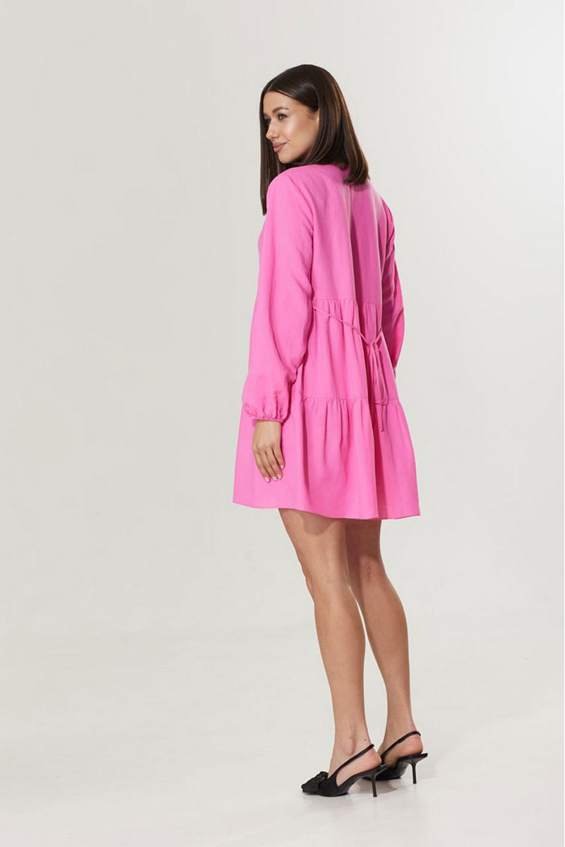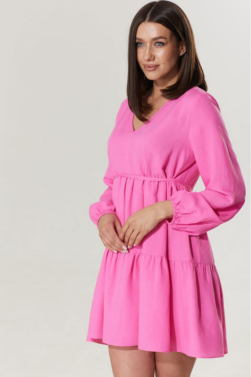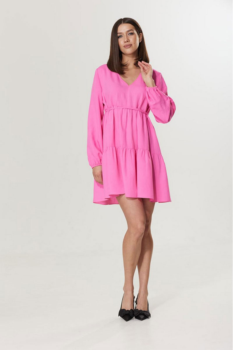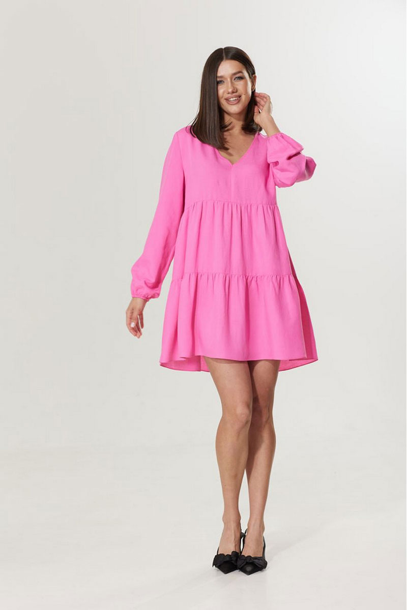 Романтичное летнее платье ярко-розового цвета из легкой вискозной ткани с добавлением льна. Платье длиной мини, свободное, с двумя ярусами на сборке. Горловина V- образной формы.