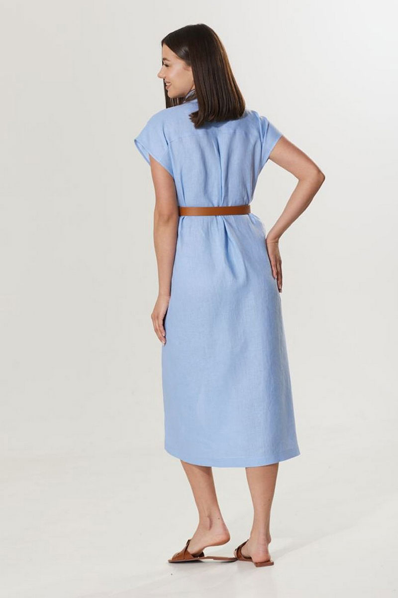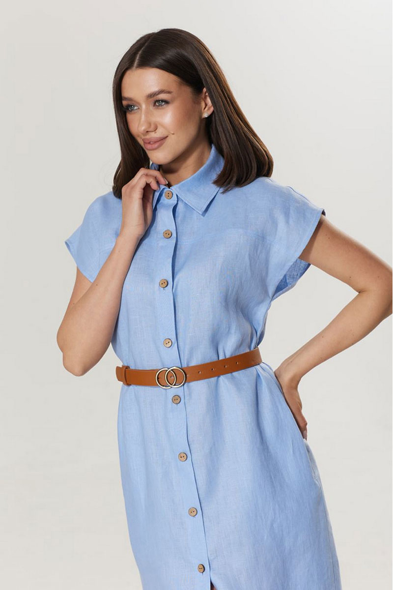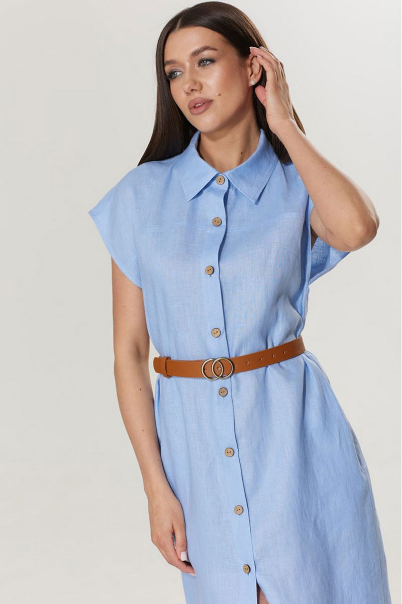 Женское летнее платье - рубашка, из легкой льняной ткани. Платье прямого силуэта. Застежка центральная на петли и пуговицы. Горловина округлая, с рубашечным воротником. Линия плеча спущена. В боковых швах функциональные карманы. Спинка с отрезной кокеткой и встречной складкой. Пояс в комплекте.