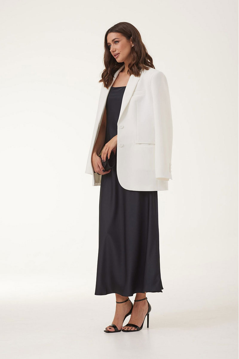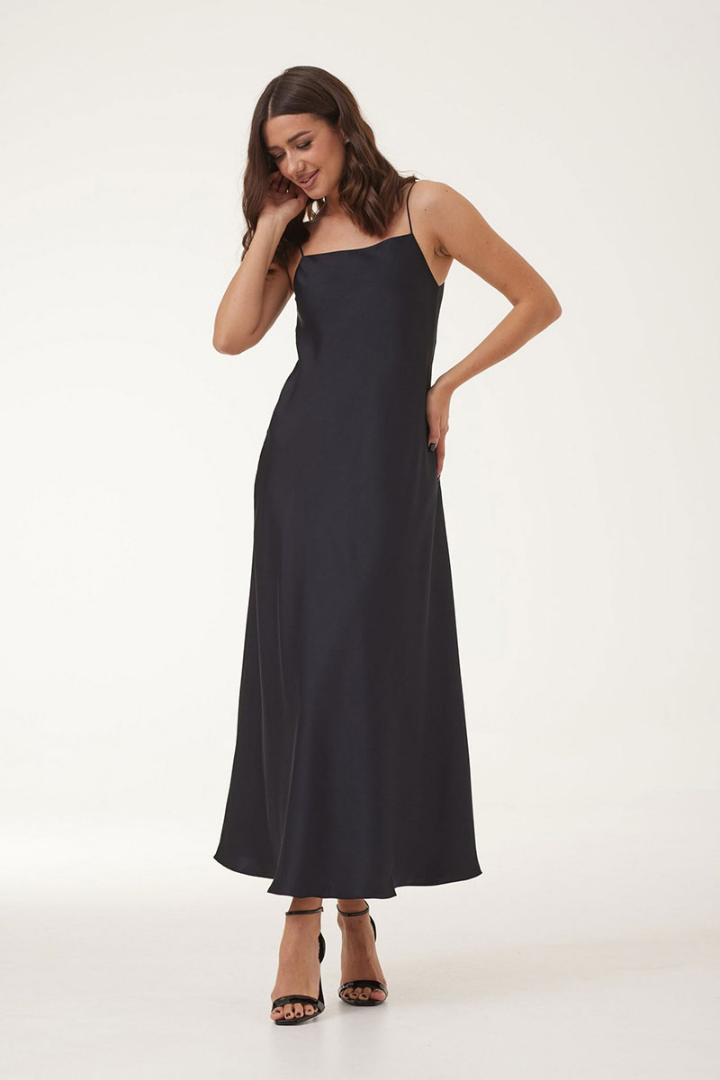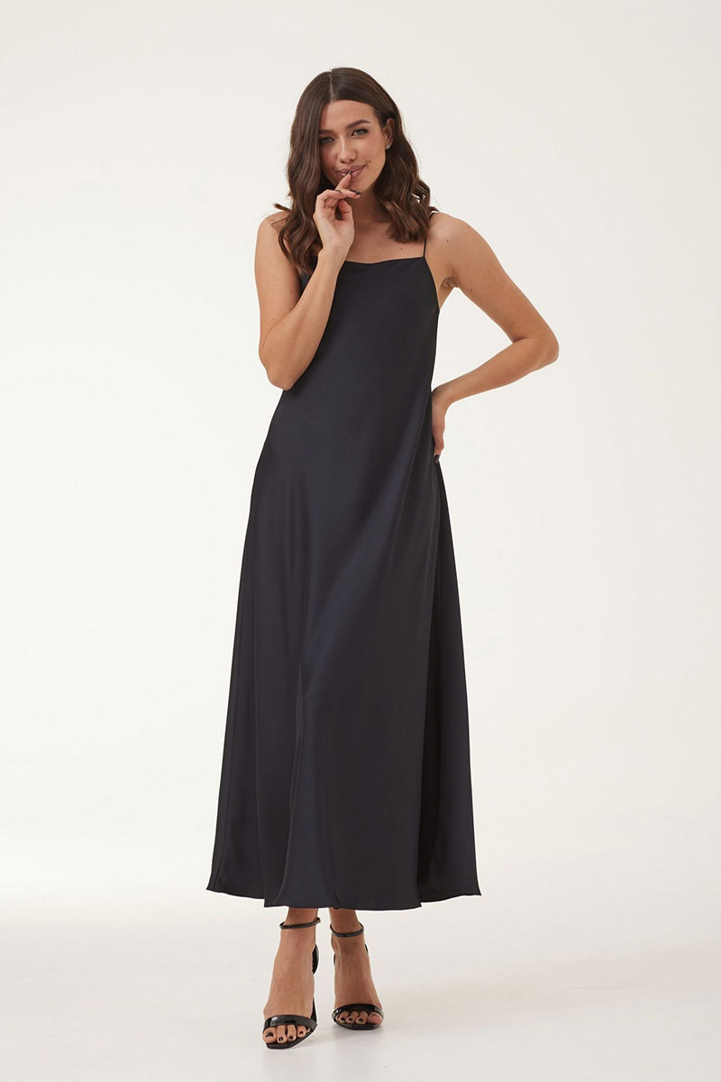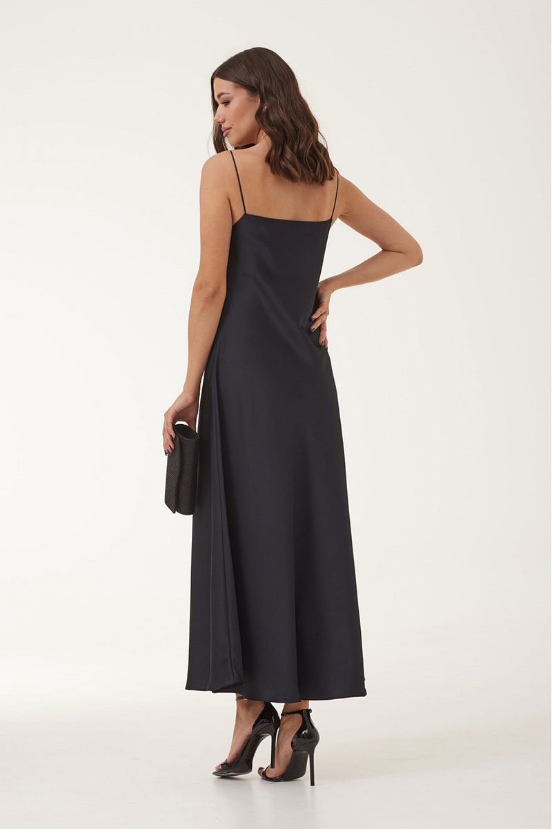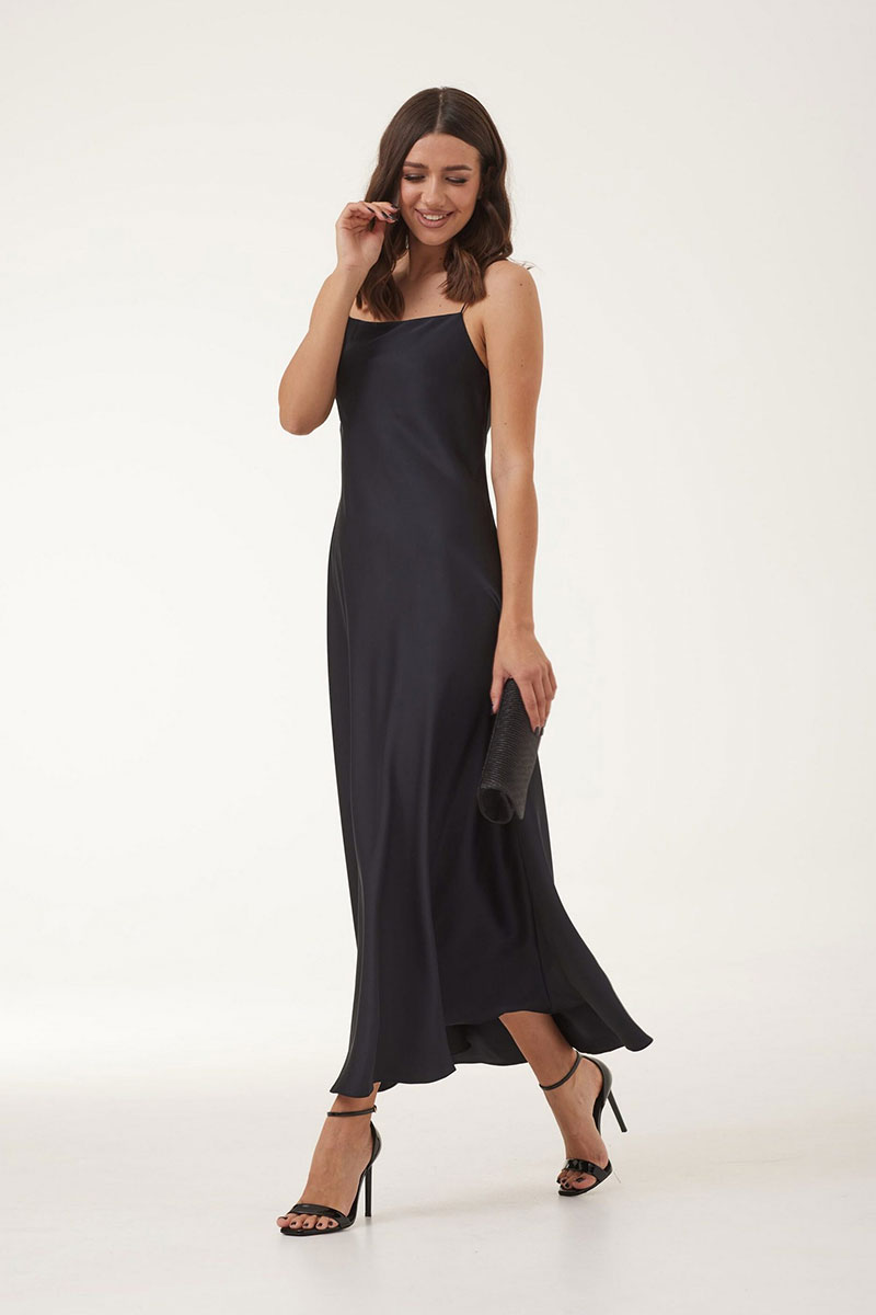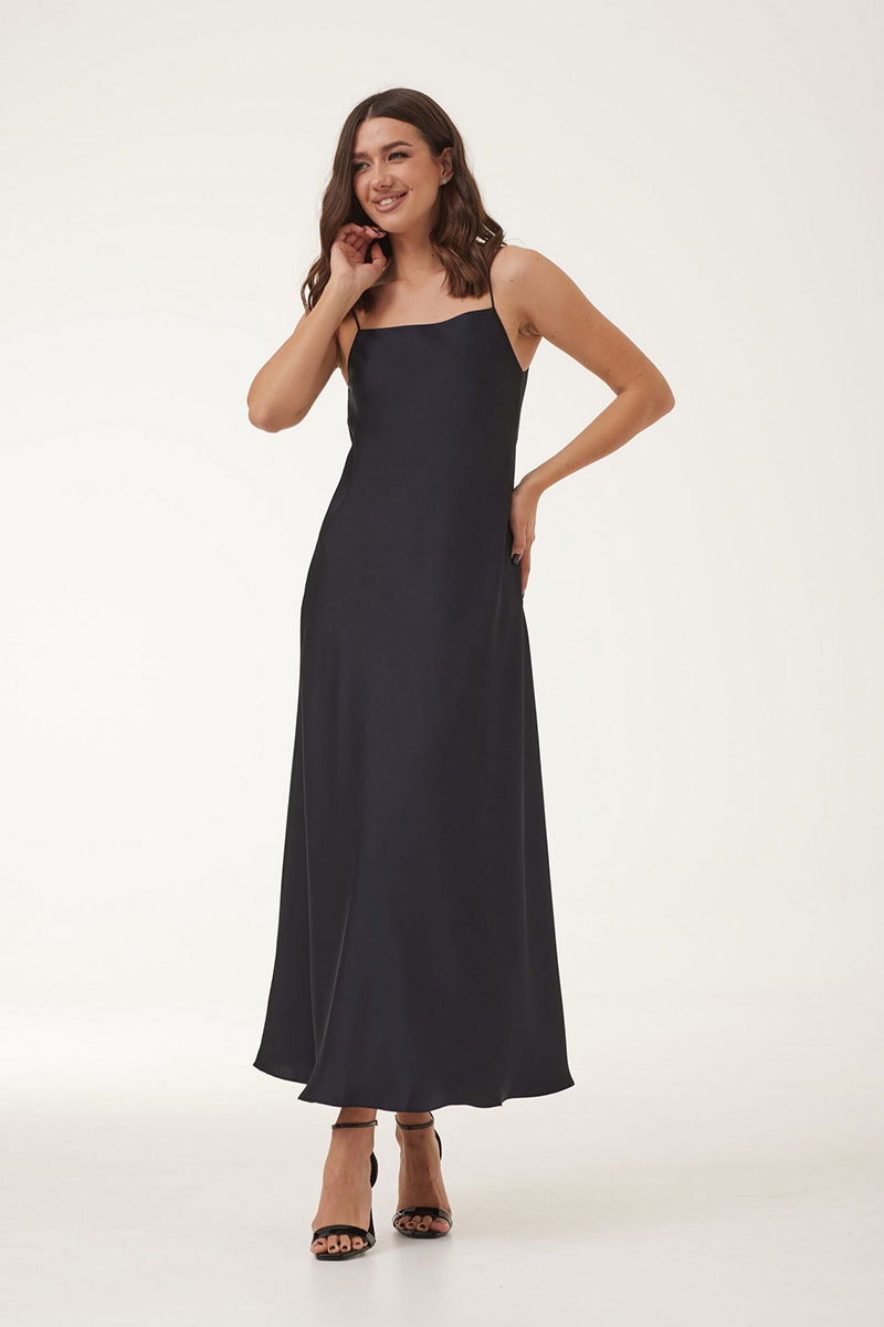 Платье женское полуприлегающего силуэта, длиной макси, выполнено из сатиновой ткани. Платье на нерегулируемых бретелях.