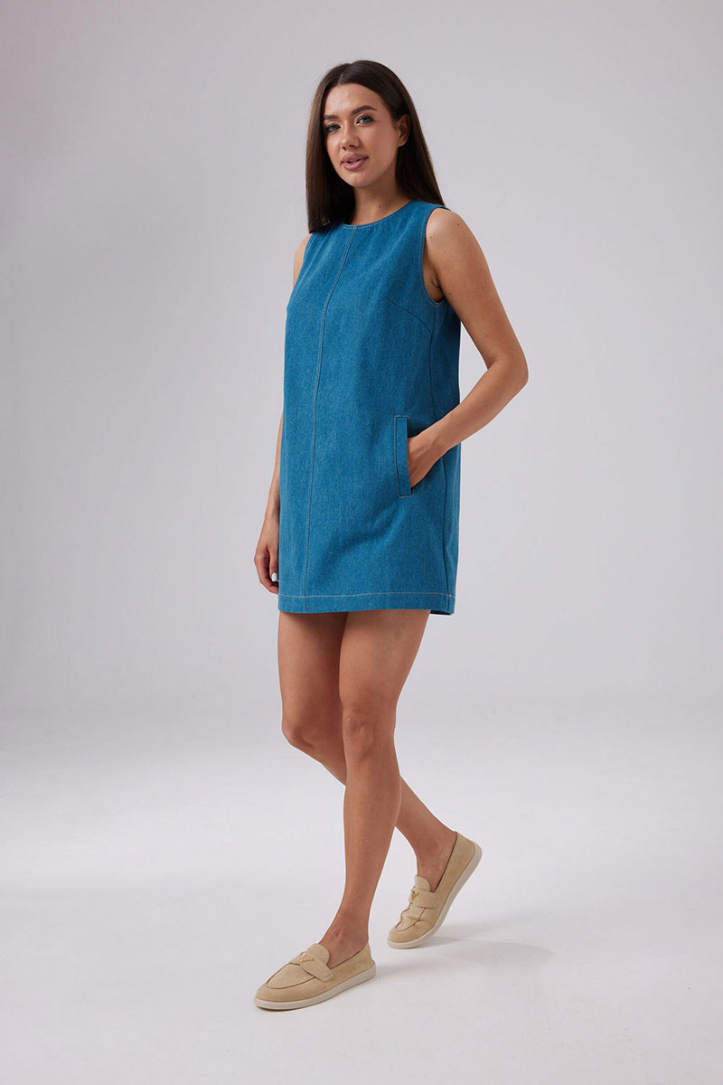 Женское платье А-образного силуэта длиной мини. Платье выполнено из джинсового полотна. Вырез горловины округлый. По полочке и спинке средний шов с декоративной отстрочкой. Без рукавов. Застежка по спинке в среднем шве на потайную тесьму-молнию. По полочке на уровне бедер прорезные карманы.