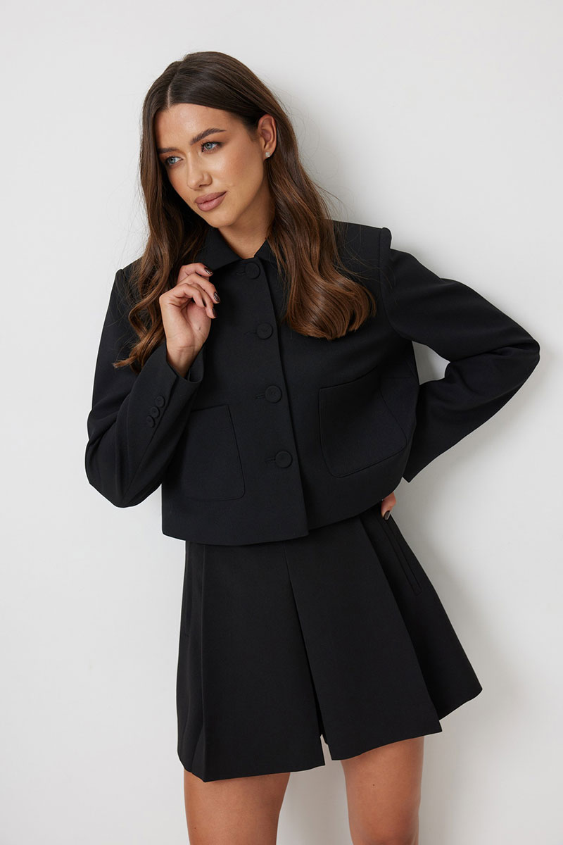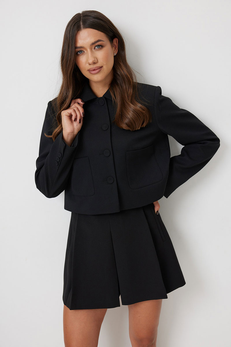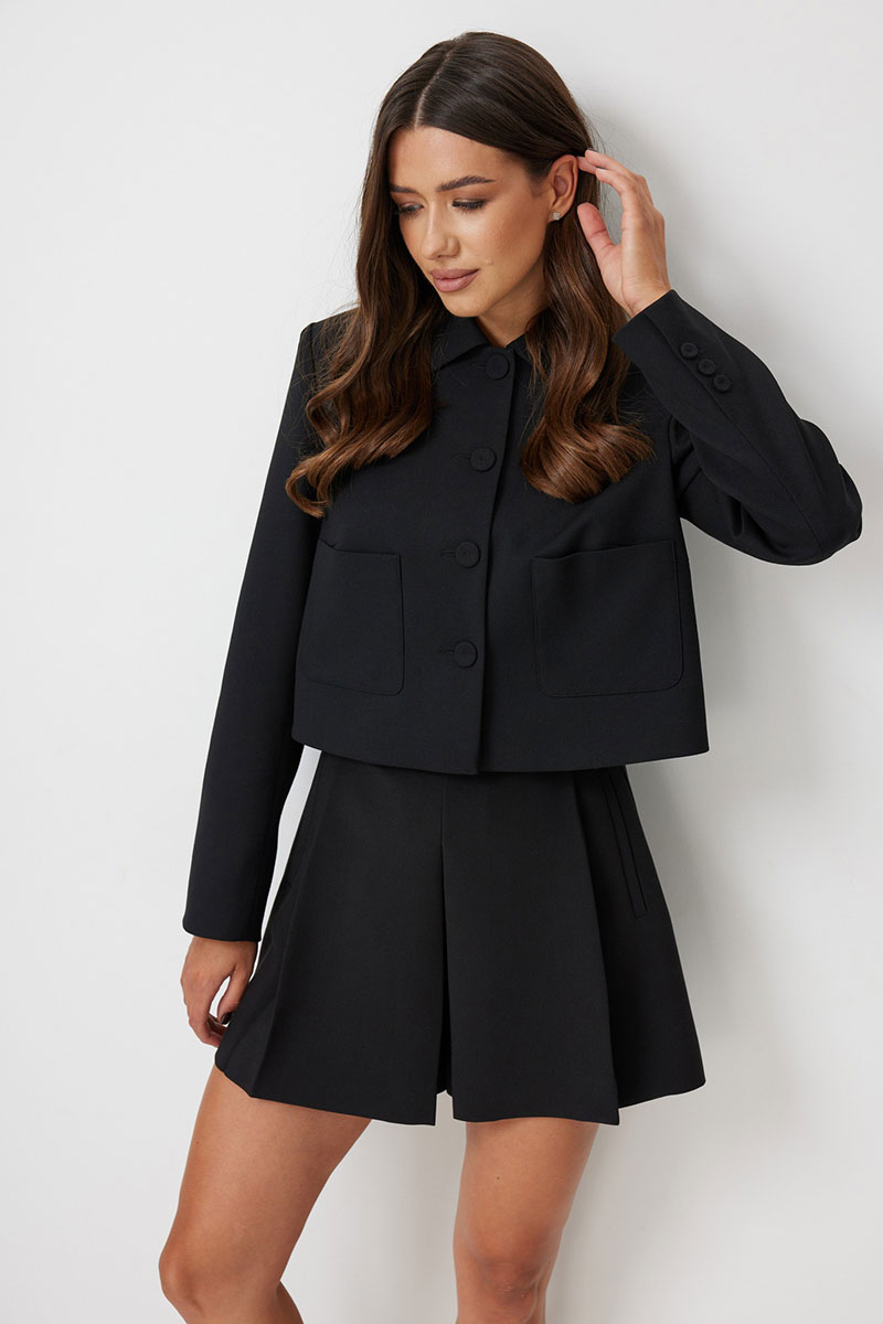 Юбка-шорты А-образного силуэта, выполнены из костюмной ткани черного цвета. Пояс притачной со шлевками, застегивающийся на петлю и пуговицу. Закрытая застежка на молнии. По переднему