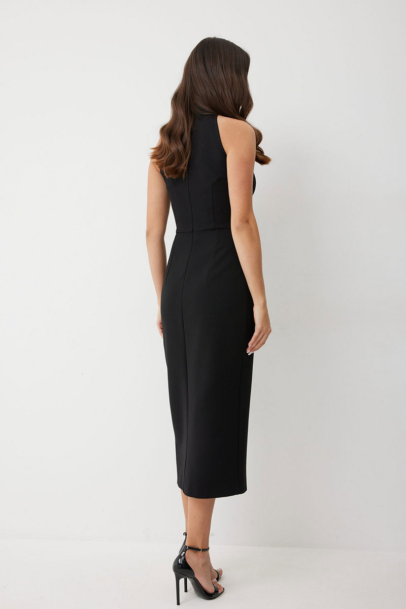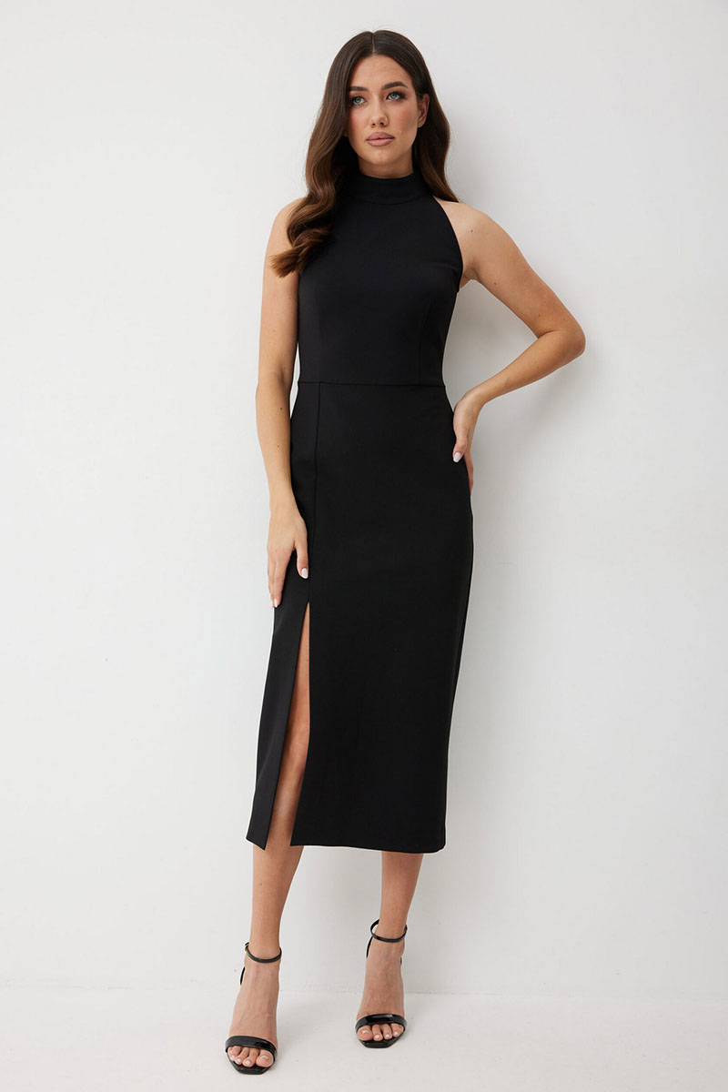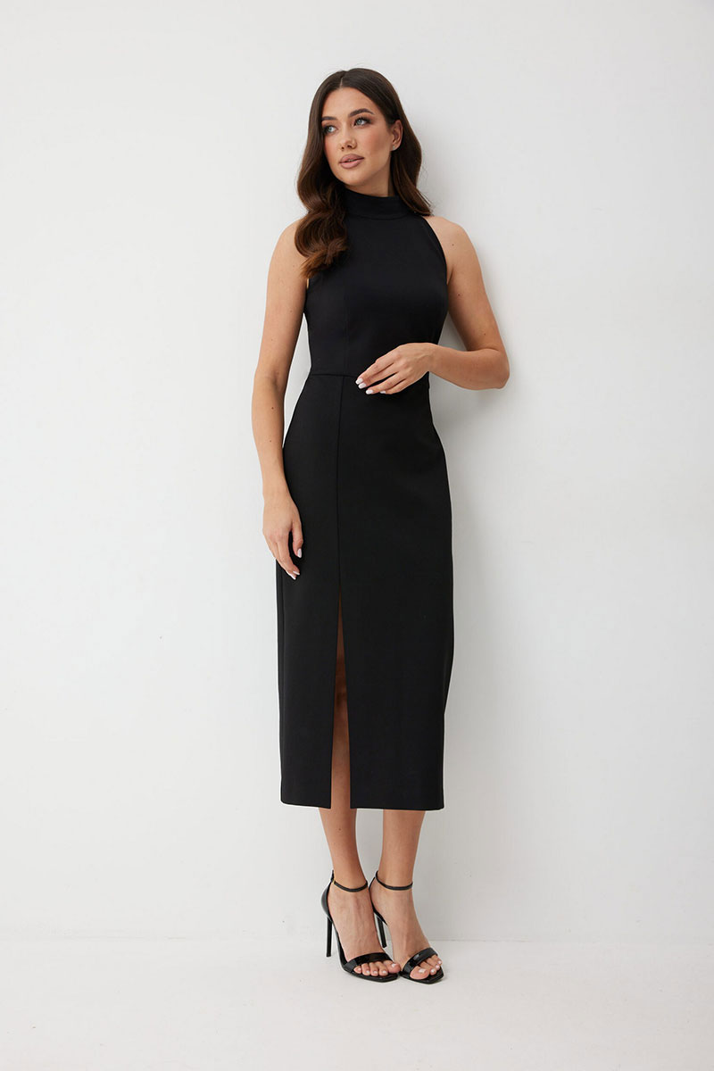 Трикотажное платье которое легко переходит из повседневной жизни в нарядный вечерний образ. Платье прилегающего силуэта, отрезное по линии талии. Выполнено из плотной, хорошо тянущейся трикотажной ткани, которая обеспечивает идеальную посадку по фигуре. Воротник-стойка и американская пройма без рукавов визуально вытягивают силуэт. По переду юбки платья на правой части расположен шов, переходящий в разрез. По спинке застежка на потайную молнию вверху среднего шва. Это платье идеально сочетается с жакетом для работы или яркими аксессуарами для праздника.