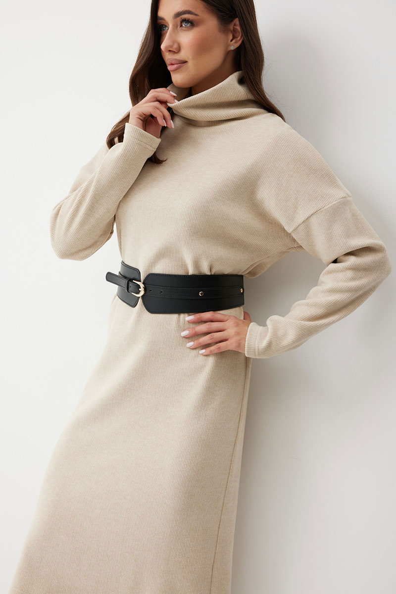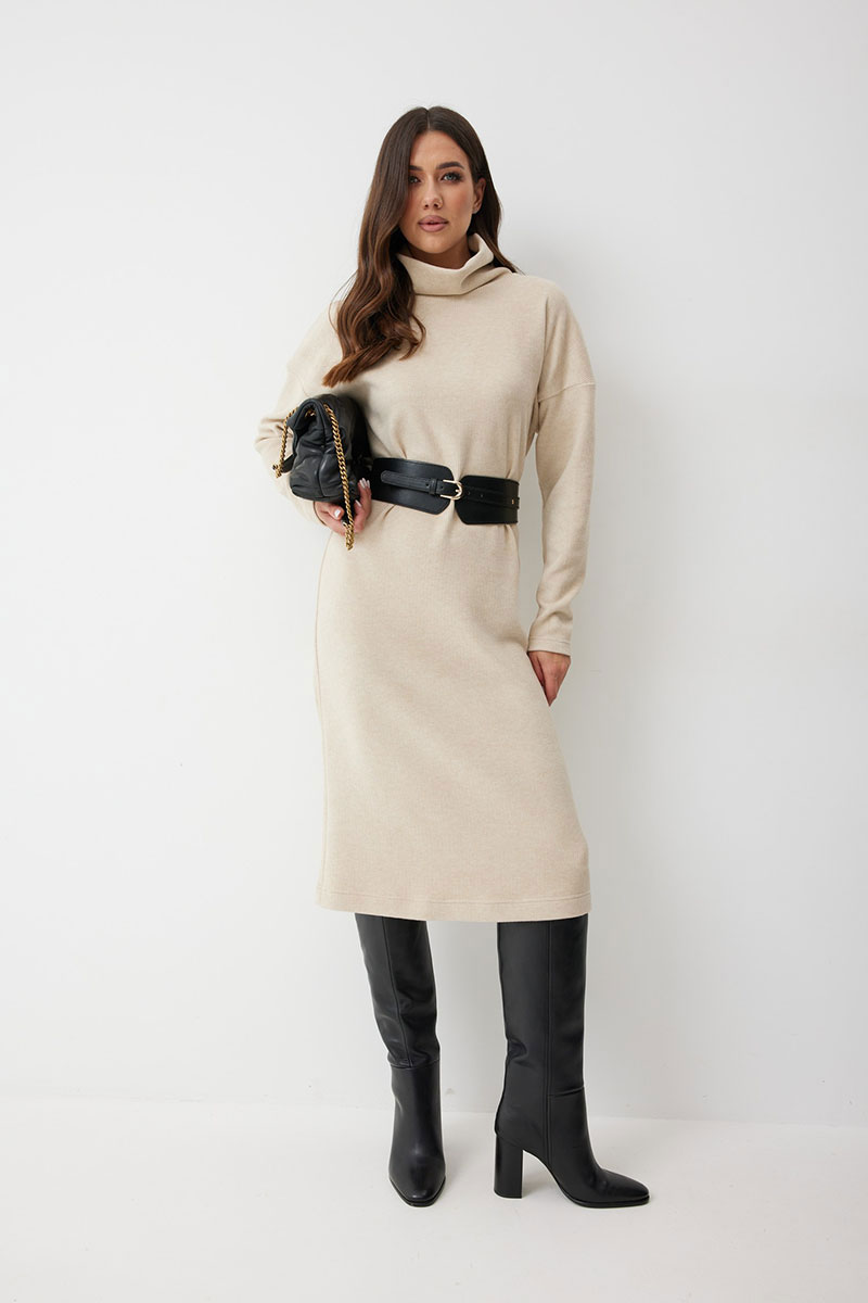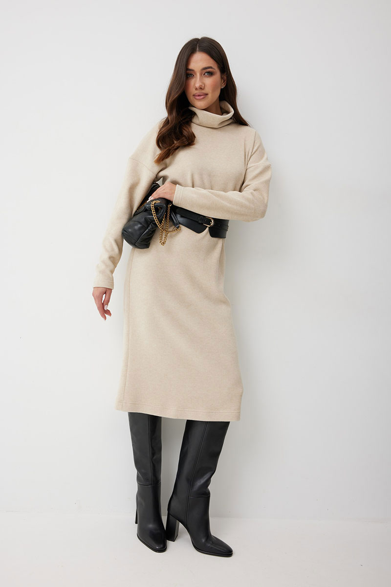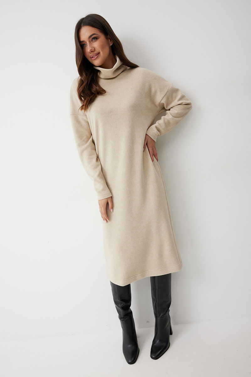 добавляет фактурности и мягкости. Горловина с высокой воротником - стойкой (15 см), который выглядит стильно и дарит дополнительное тепло. Благодаря прямому силуэту, платье