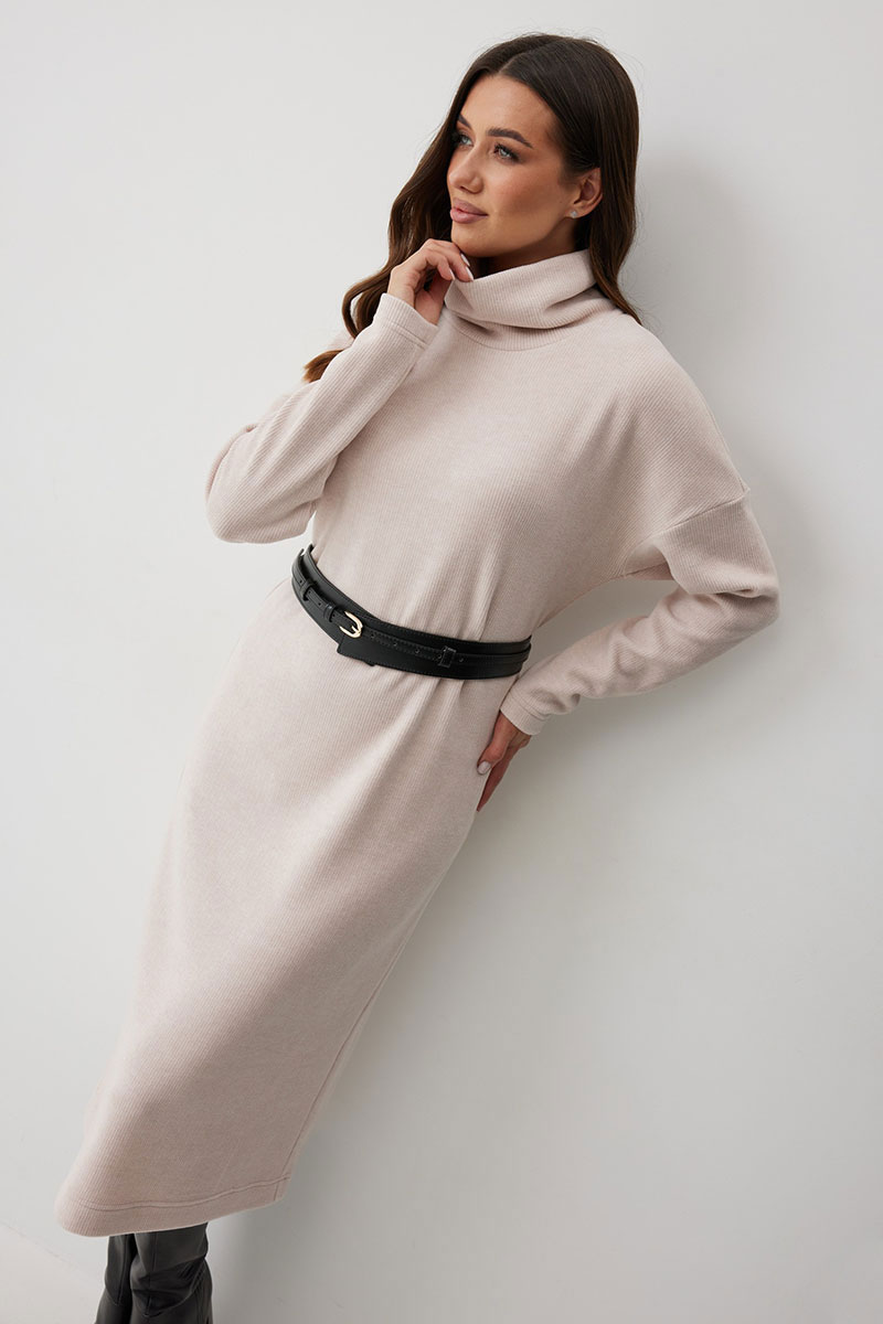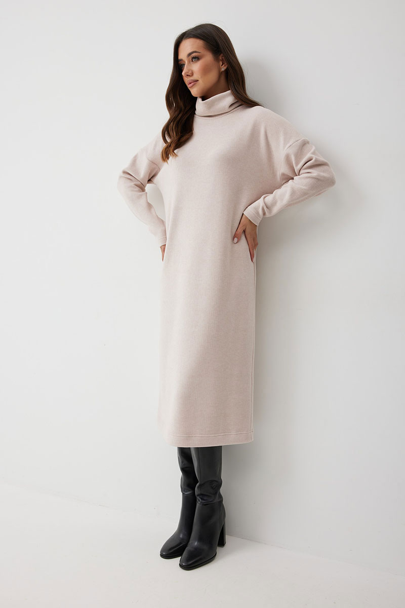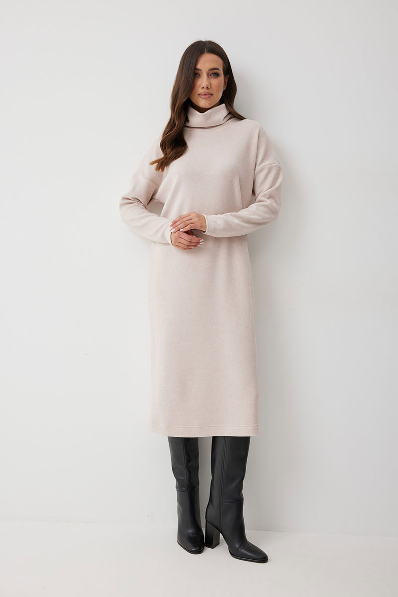 добавляет фактурности и мягкости. Горловина с высокой воротником - стойкой (15 см), который выглядит стильно и дарит дополнительное тепло. Благодаря прямому силуэту, платье