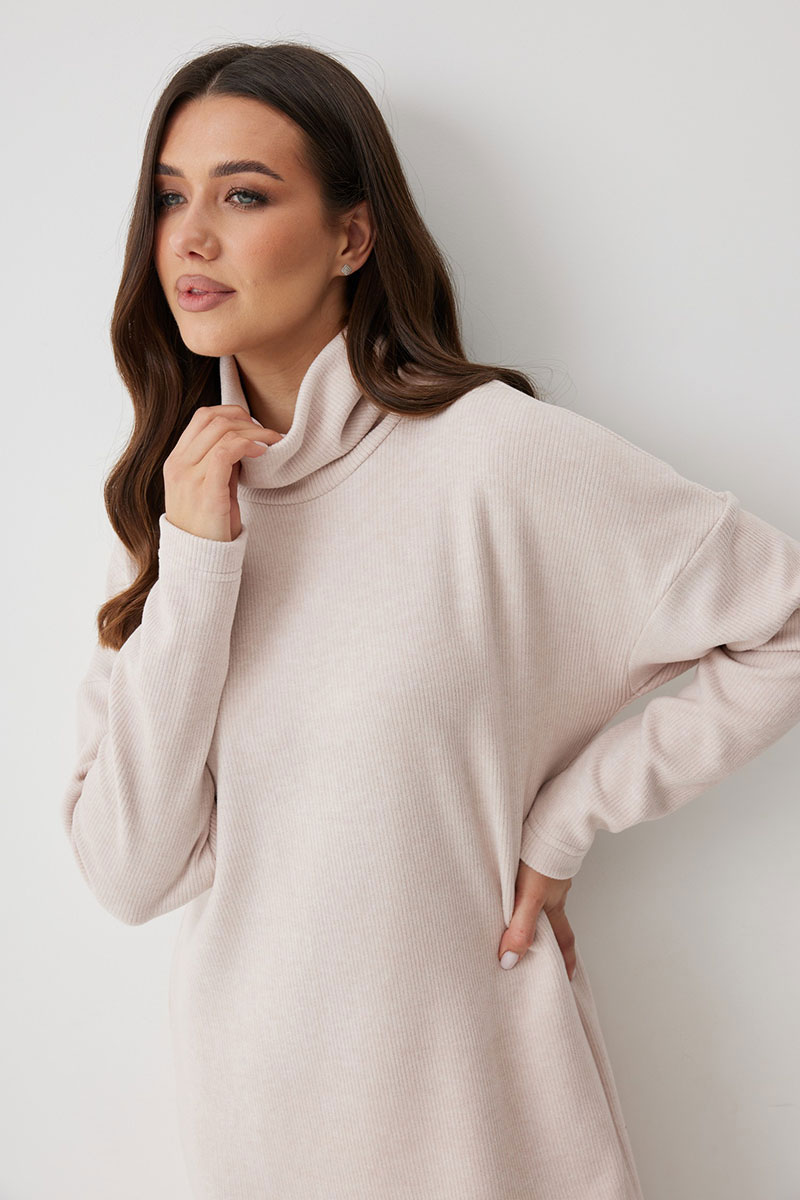 обеспечивает свободную и универсальную посадку. Спущенная линия плеча и длинный рукав, чуть зауженный к низу, создают расслабленный и уютный объем. Это платье станет незаменимой