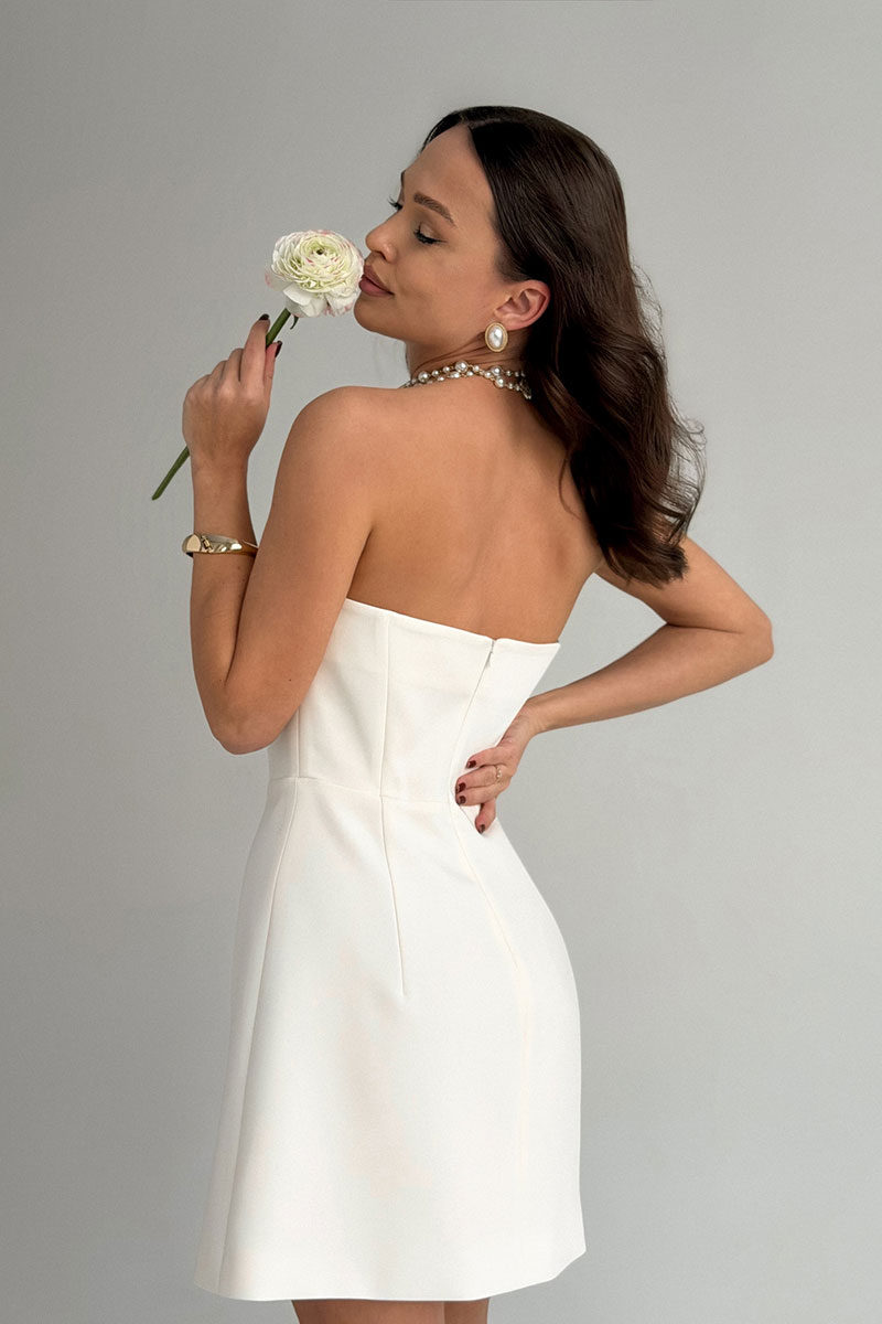 Женское платье-бандо длиной мини — идеальный выбор для создания эффектного и запоминающегося нарядного образа. Это платье полностью открывает плечи и ключицы — лучший способ подчеркнуть изящество и хрупкость фигуры. Выполнено из текстильной ткани с поливискозной подкладкой. Платье отрезное по линии талии. Верх прилегающий, корсетного типа. Юбка платья силуэта трапеция, слегка расширена к низу. Застежка на потайную молнию по спинке. В этом платье вы будете выглядеть неотразимо на любом торжественном мероприятии. Платье-бандо идеально комбинируется с кружевной юбкой М385 или шифоновой юбкой М368 для создания ультрамодного многослойного образа.
