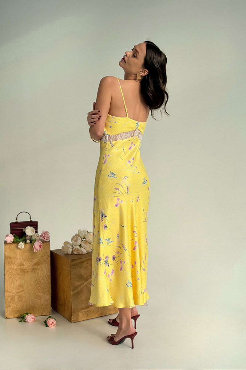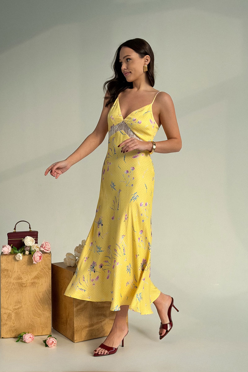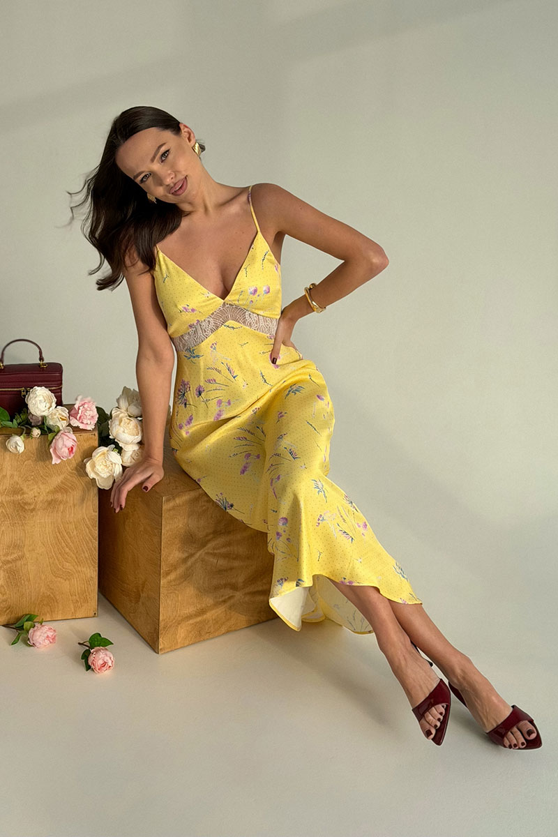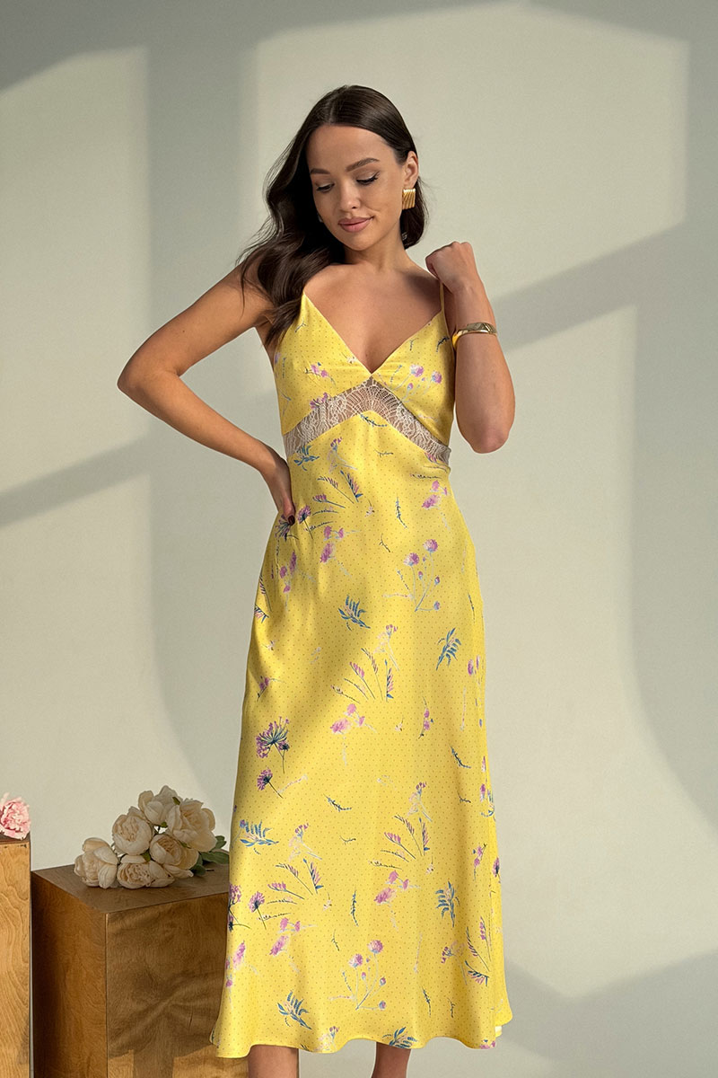 Изящное платье-комбинация длиной миди — воплощение летнего очарования и элегантности. Модель прилегающего силуэта в верхней части, с расширяющейся юбкой. Платье на тонких регулируемых бретелях с глубоким V-образным вырезом. Ниже линии груди декоративная вставка из кружева. Это платье станет изюминкой вашего гардероба: сочетайте его с минималистичными аксессуарами и босоножками на каблуке для создания утончённого образа или дополните стильной сумкой и сандалиями для более расслабленного лука.