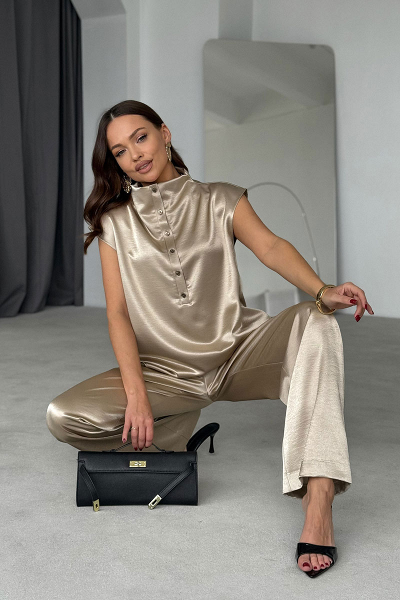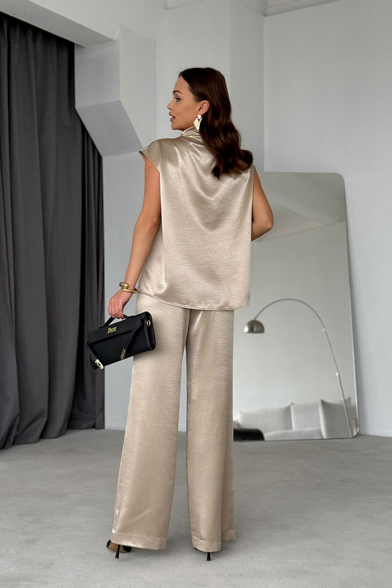 Женские брюки прямого силуэта — стильный и комфортный выбор для повседневных образов. Модель выполнена из ткани с блеском. Верх брюк на резинке. В боковых швах функциональные карманы. Низ брюк с широкой подгибкой. Эти брюки идеально подойдут для создания как расслабленных повседневных луков, так и более нарядных сочетаний.