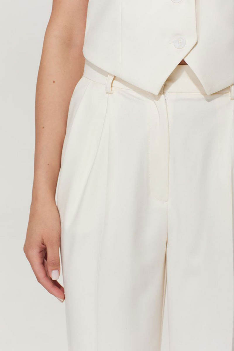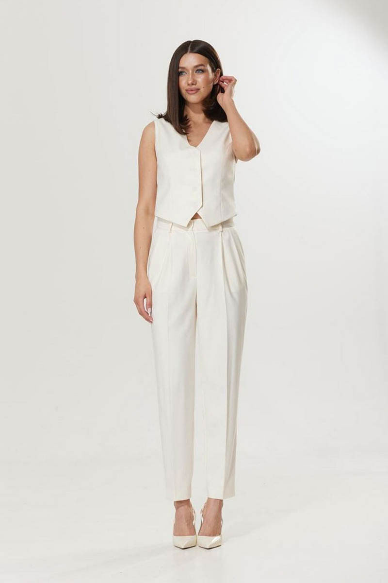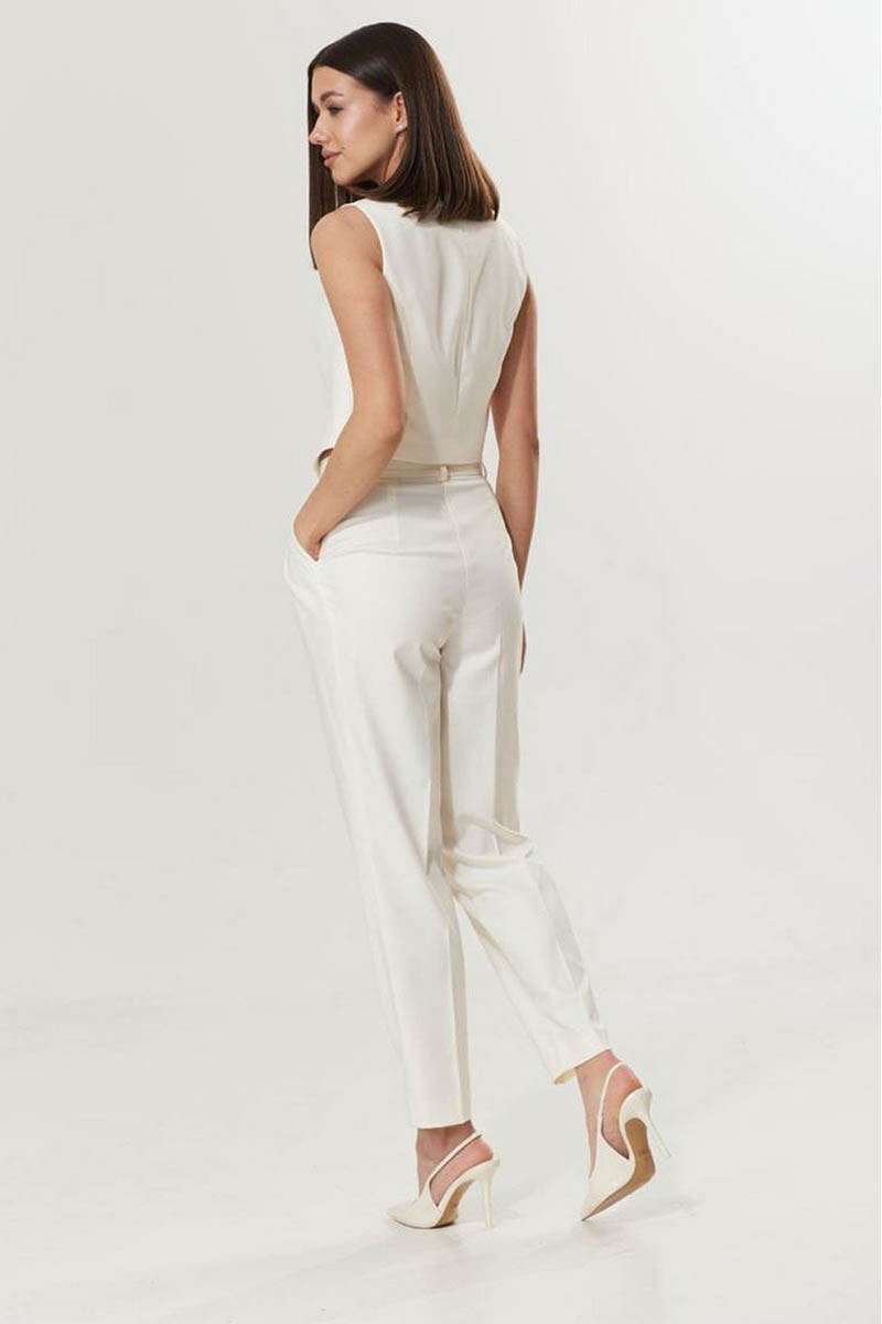 Пояс притачной с застежкой на петлю и пуговицу. Застежка гульфик на молнию. В боковых подрезах по переду функциональные карманы. По передним полотнищам заложены складки.