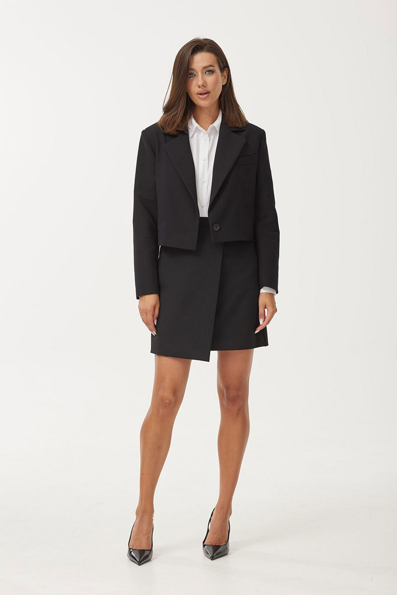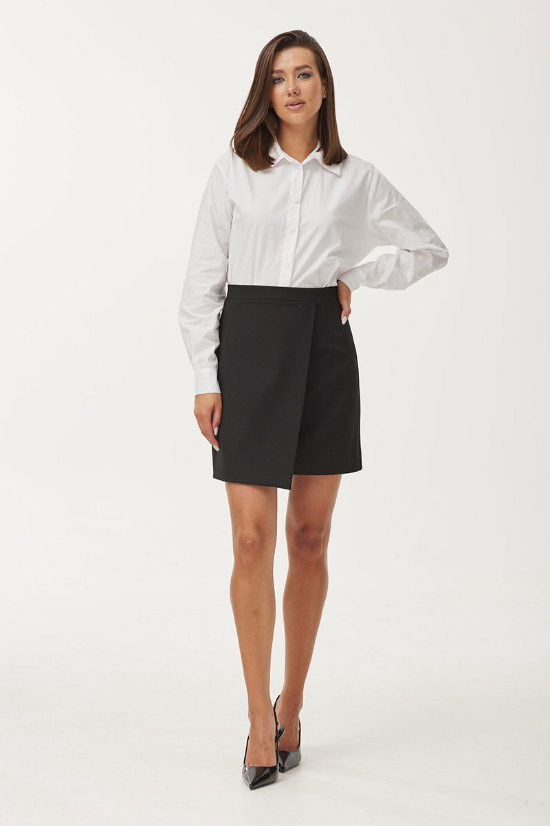 Юбка женская полуприлегающего силуэта, выполнена из костюмной ткани черного цвета. Перед юбки с имитацией застежки на запах. Застежка на потайную молнию в среднем шве сзади. Пояс