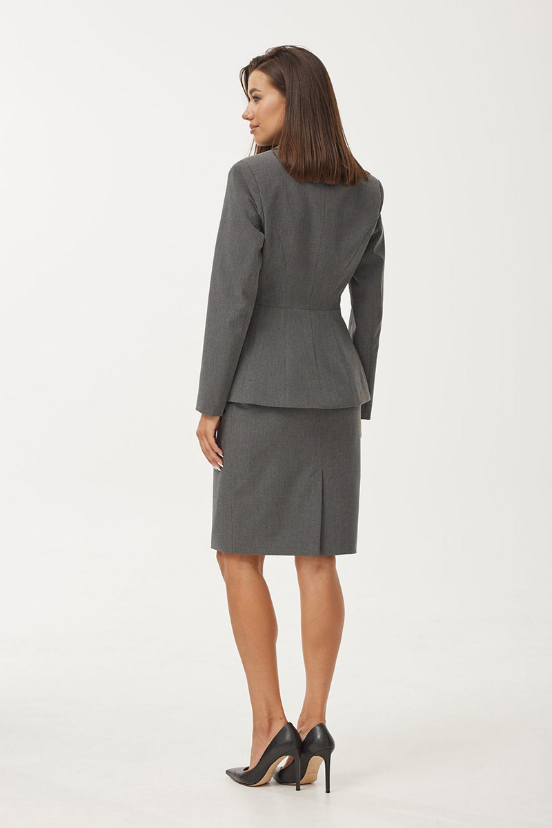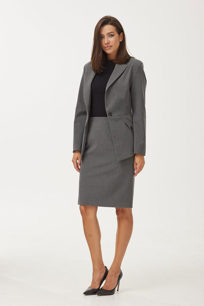 Юбка женская полуприлегающего силуэта, длиной до колена, выполнена из костюмной ткани. Посадка на талии, без пояса. По передним и задним половинкам вытачки. Заднее полотнище со
