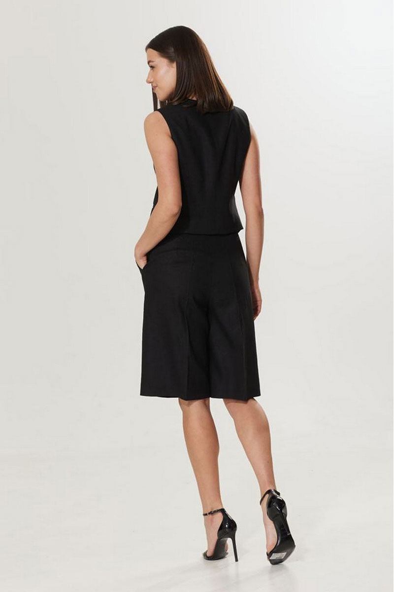 Шорты прямого силуэта, длиной до колена. Пояс притачной с застежкой на петлю и пуговицу. Застежка на молнию в гульфике. В боковых подрезах по переду функциональные карманы.