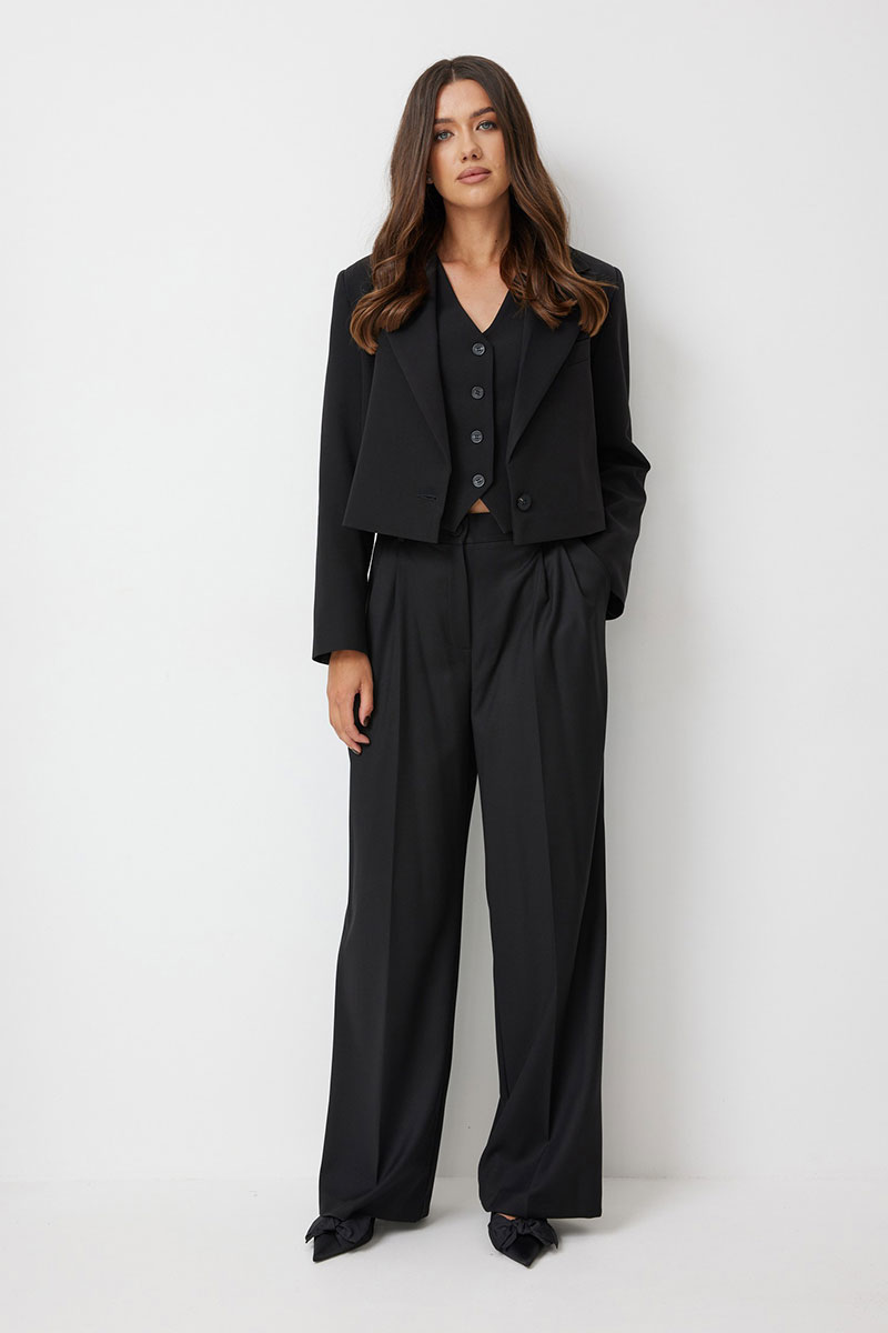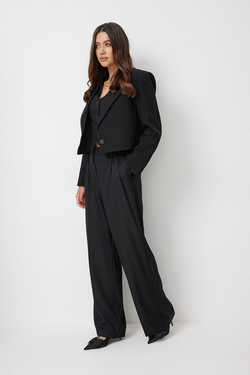 Брюки женские, широкие прямые, с высокой посадкой. Выполнены из костюмной ткани черного цвета. В боковых подрезах по переду функциональные карманы. Пояс притачной со шлевками,