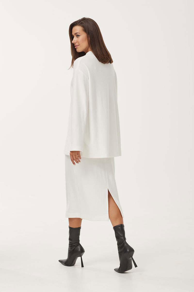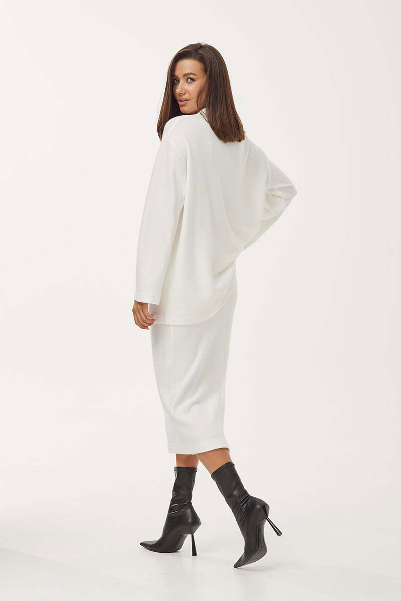 Юбка прямого силуэта, длиной миди, выполнена из мягкого трикотажного полотна. Пояс с резинкой шириной 4 см. По заднему полотнищу средний шов, внизу которого оформлен