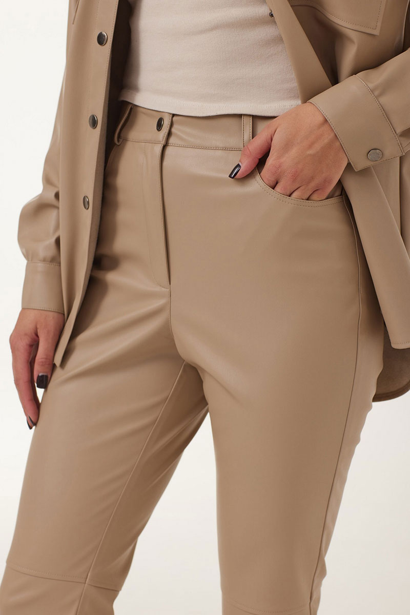 Брюки женские, зауженные к низу, выполнены из мягкой экокожи бежевого цвета. По переду подрез выше колена. В боковых подрезах по переду карманы. Пояс притачной, со шлевками,