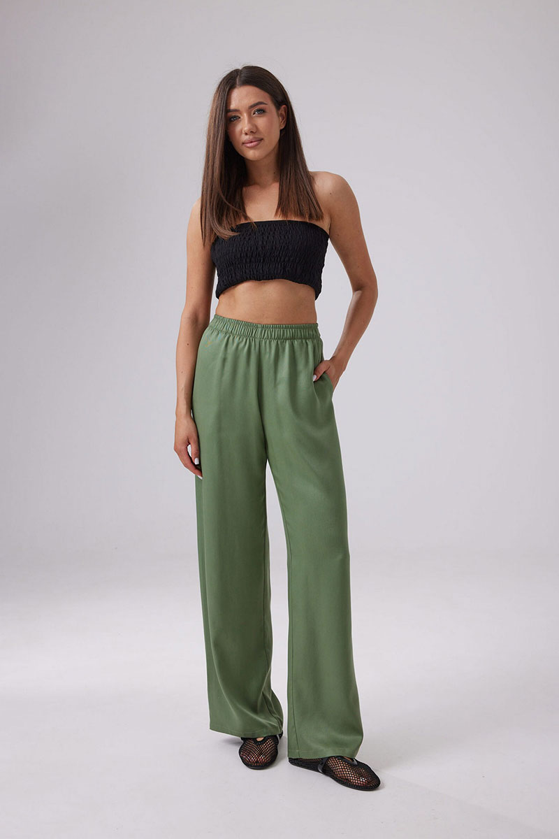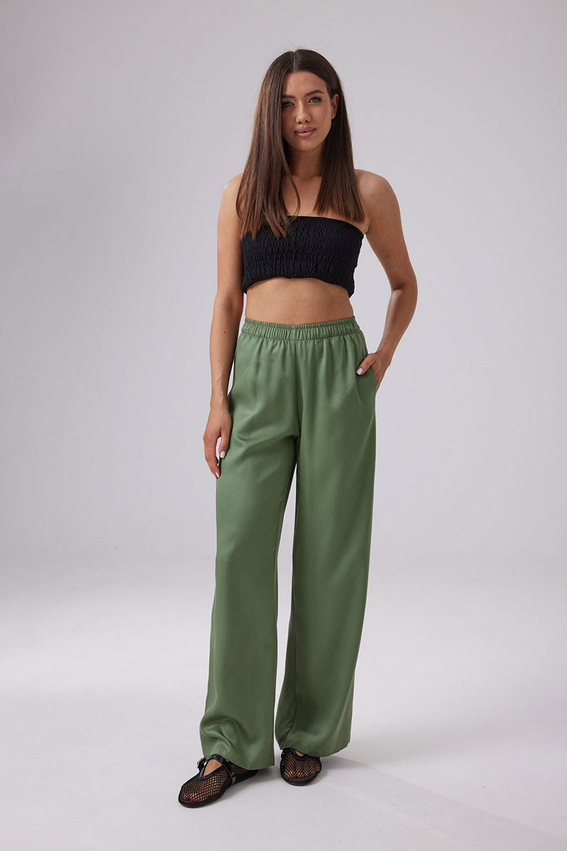 Брюки прямого кроя. Пояс на широкой эластичной резинке. В боковых швах функциональные карманы.