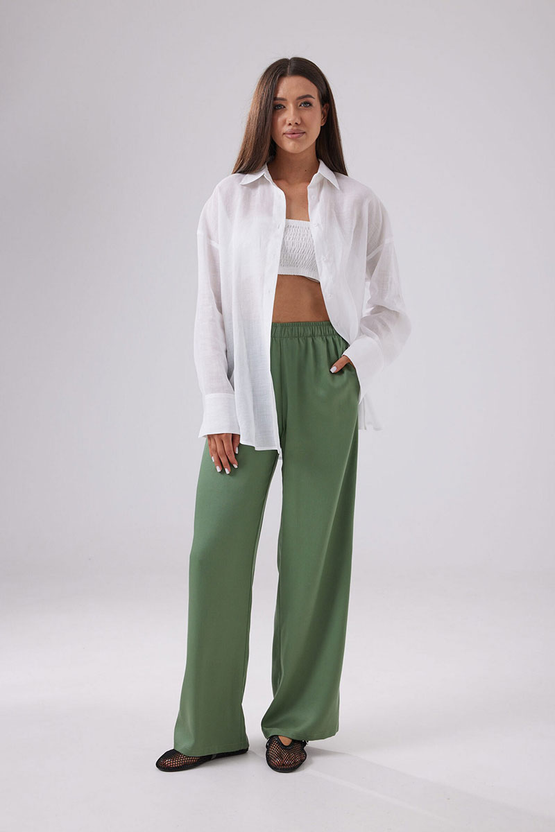 Летние женские брюки из струящегося вискозного полотна — это образец утончённого комфорта и лёгкости, созданный для жарких дней. Модель прямого кроя дарит ощущение свободы движений и