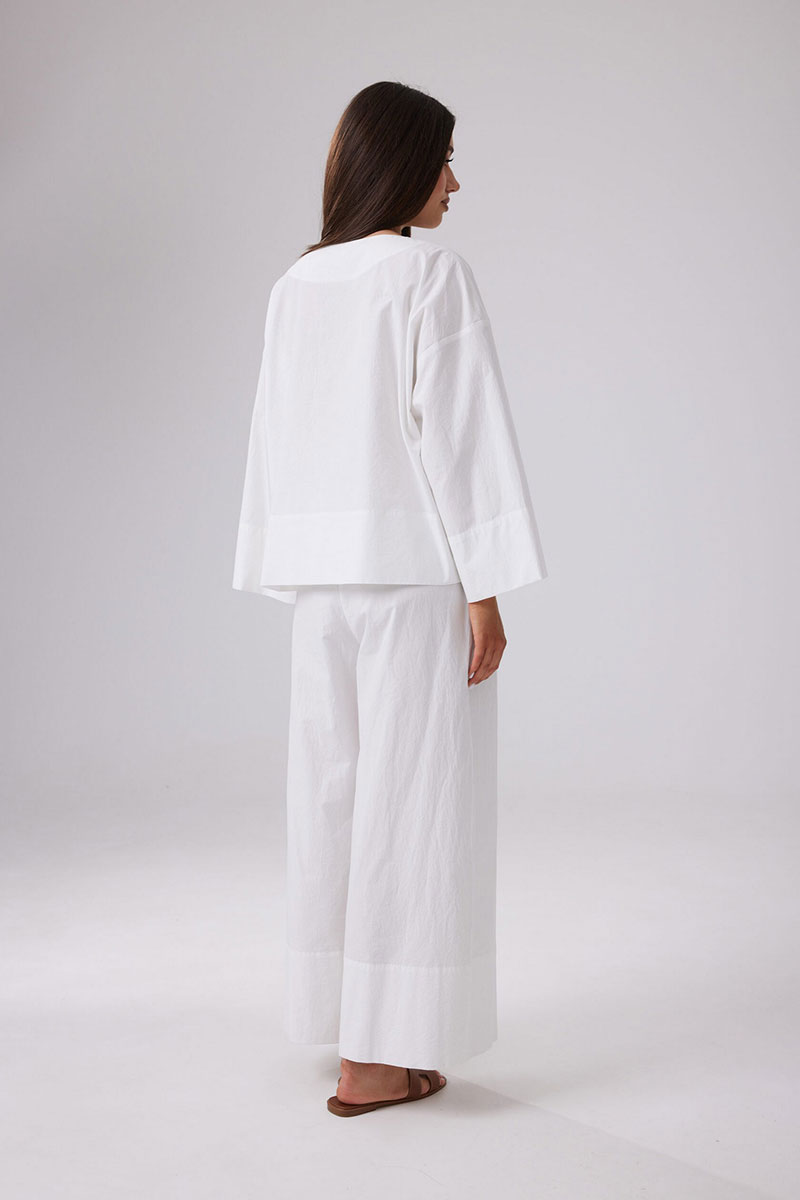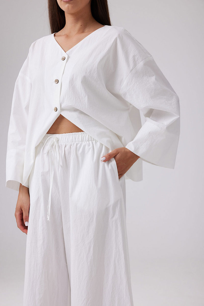 Легкие летние брюки свободного силуэта из хлопковой ткани с эффектом мятости. Пояс на эластичной резинке шириной 4 см, с продетым декоративным шнурком. По низу широкая подгибка. В