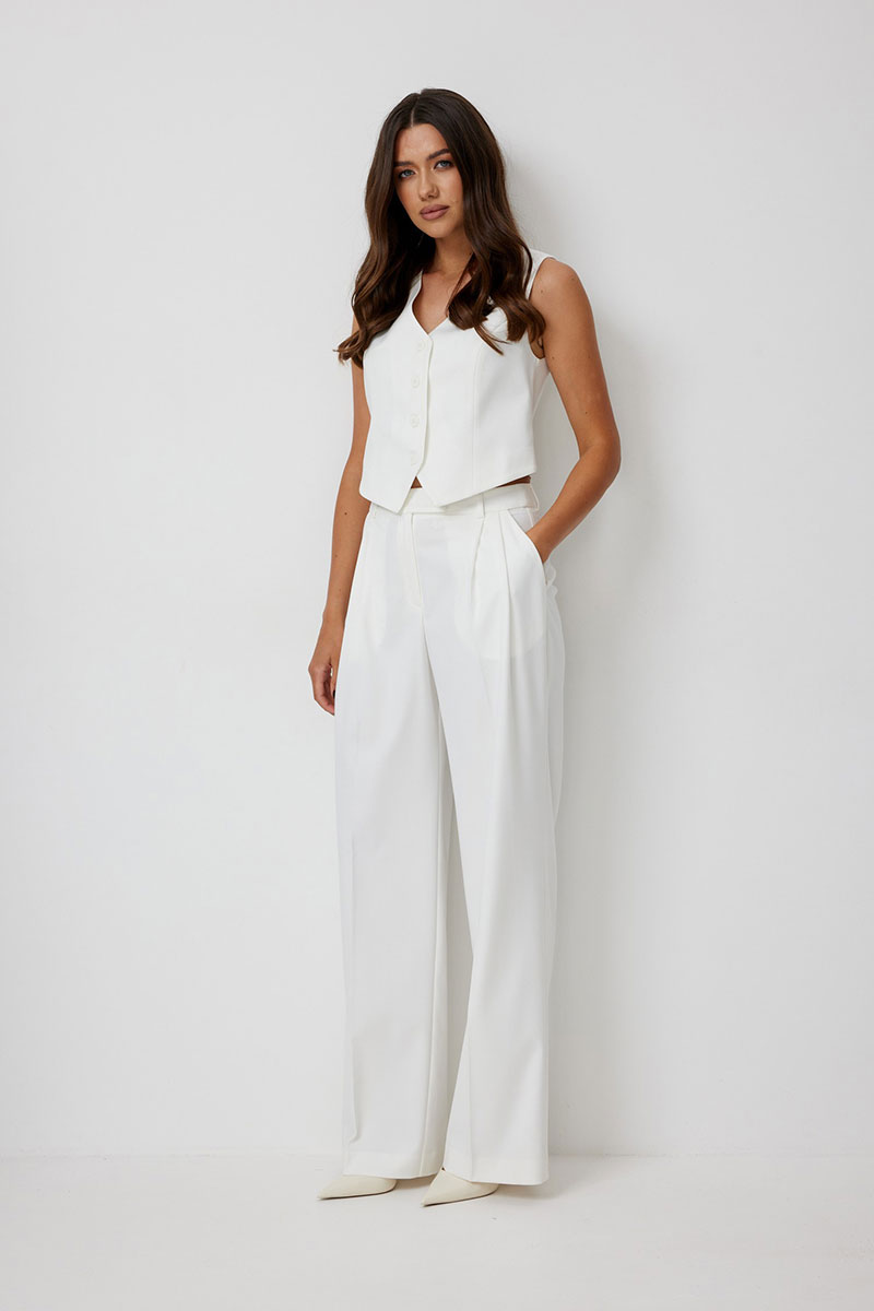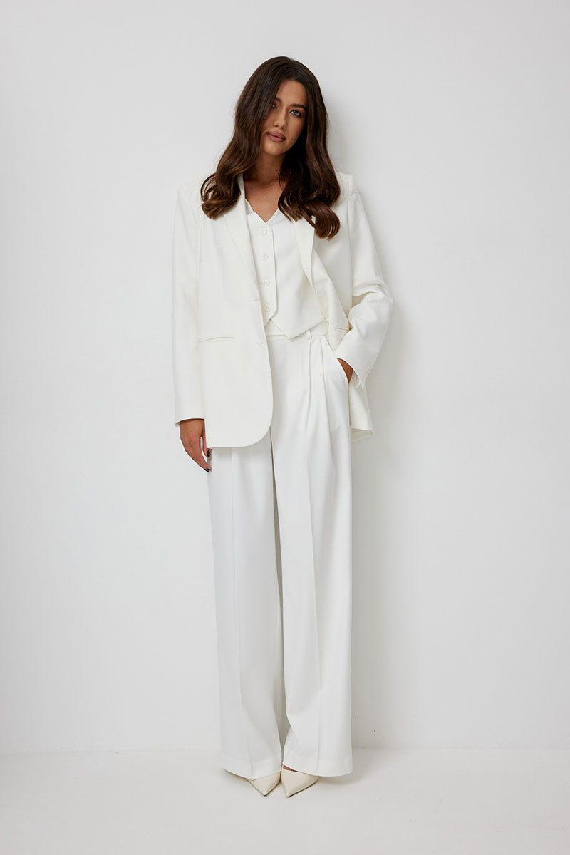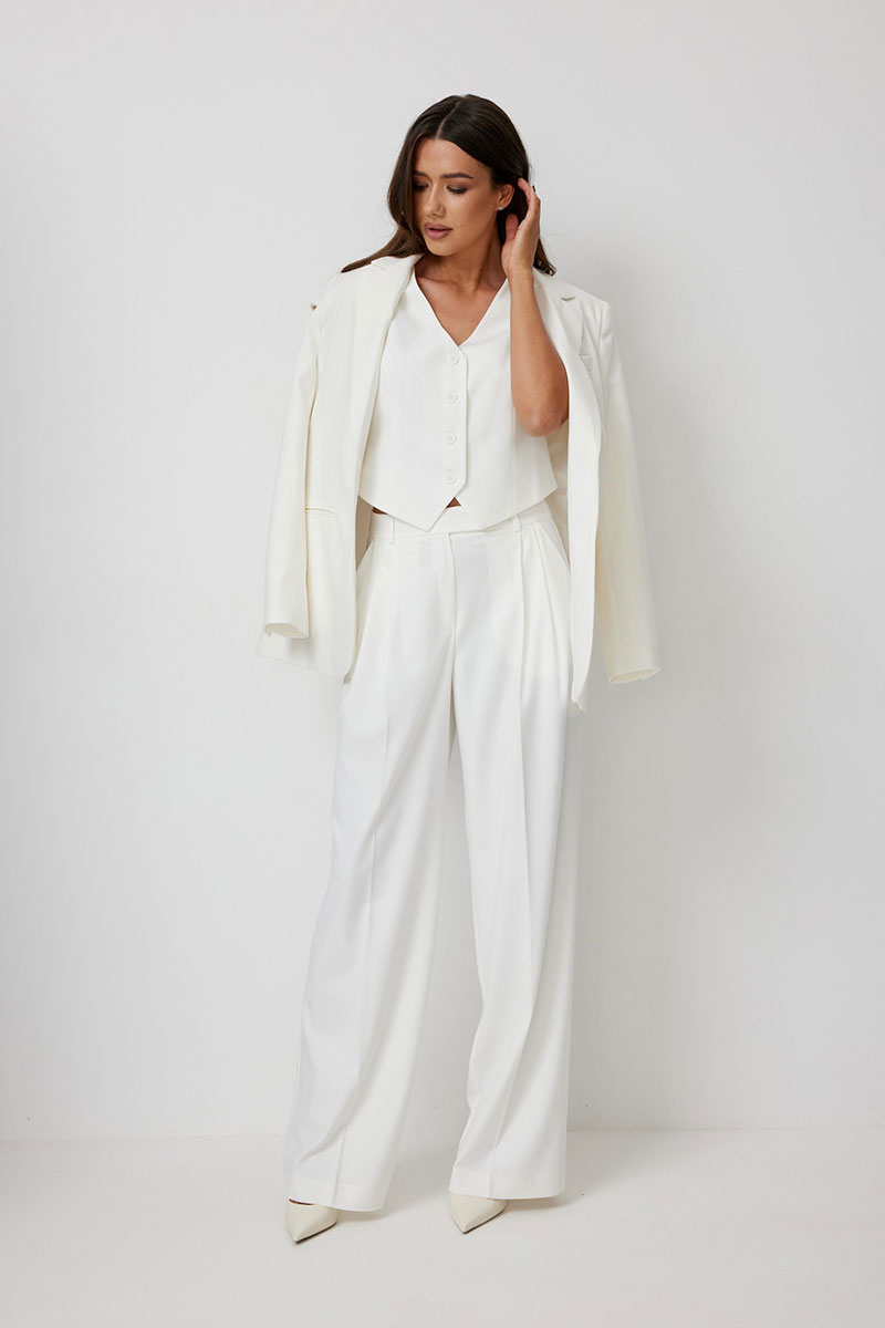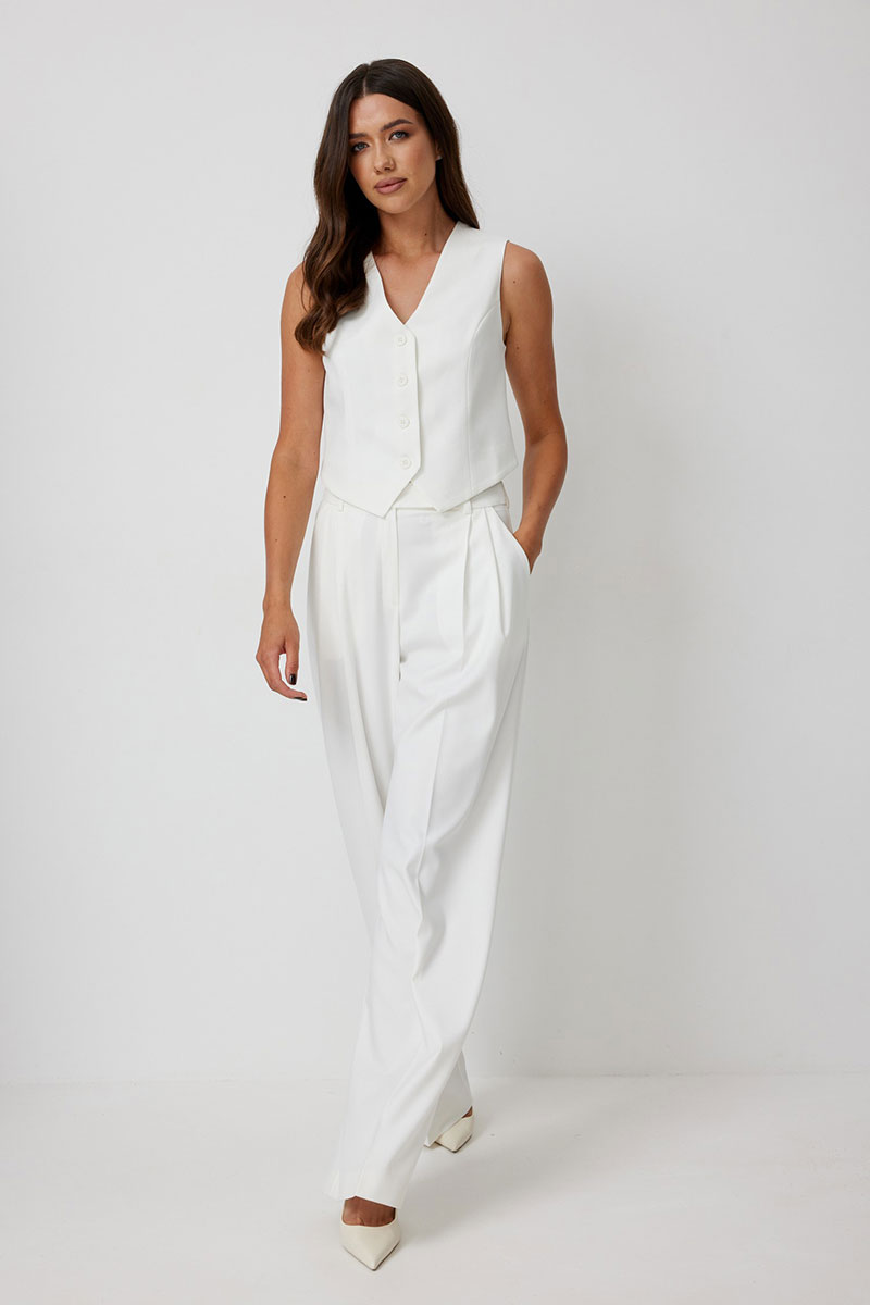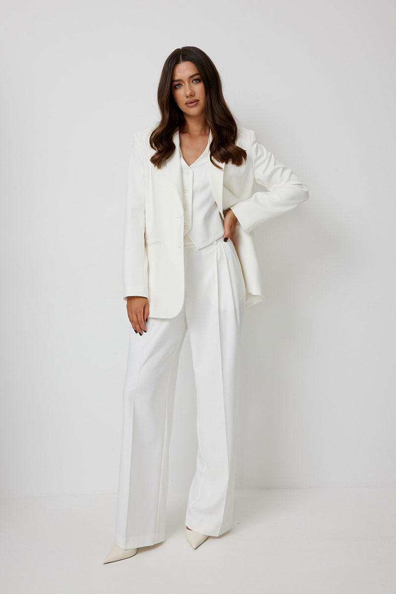 Брюки женские, широкие прямые, с высокой посадкой. Выполнены из костюмной ткани молочного цвета. В боковых швах функциональные карманы. Пояс притачной со шлевками, застегивается на