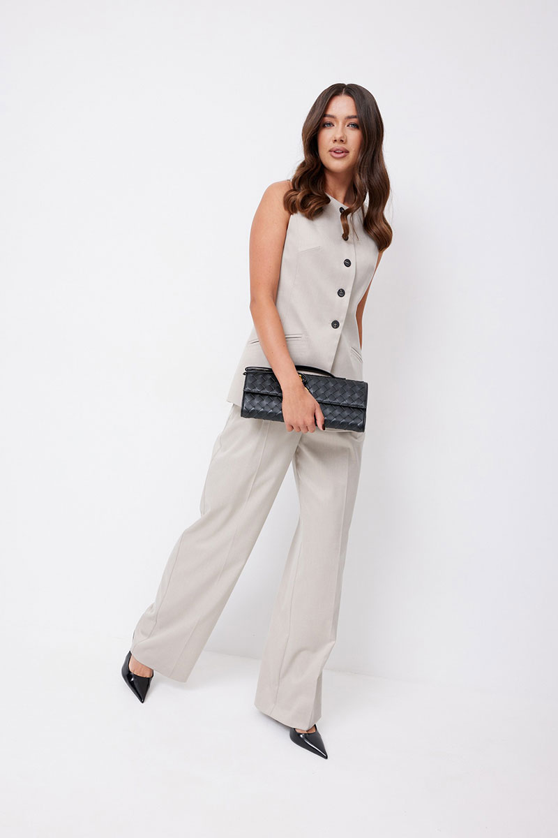 Брюки женские, прямые, с высокой посадкой. Выполнены из костюмной ткани бежевого цвета. В боковых подрезах по переду функциональные карманы. Пояс притачной со шлевками, застегивается