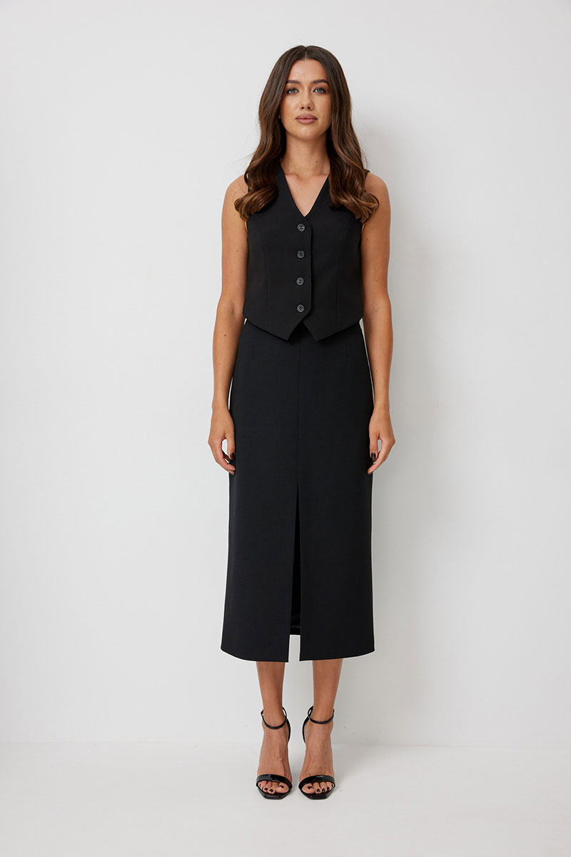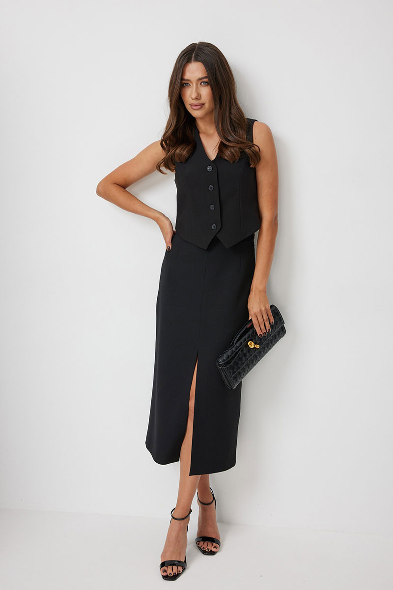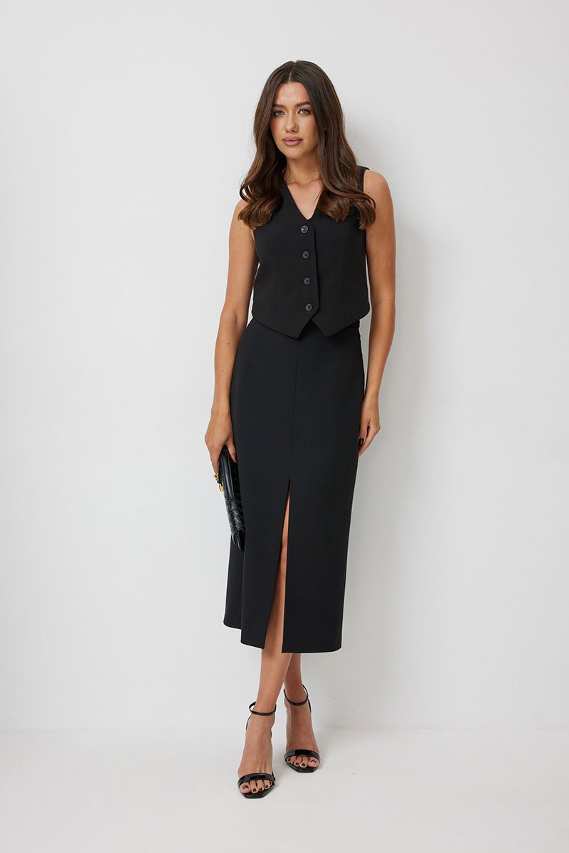 Юбка женская полуприлегающего силуэта длины миди с посадкой на талии, выполнена из костюмной ткани черного цвета. Юбка на подкладке. По переднему полотнищу средний шов, заканчивающийся высоким разрезом, длиной 44 см. Застежка на потайную молнию в среднем шве переда.