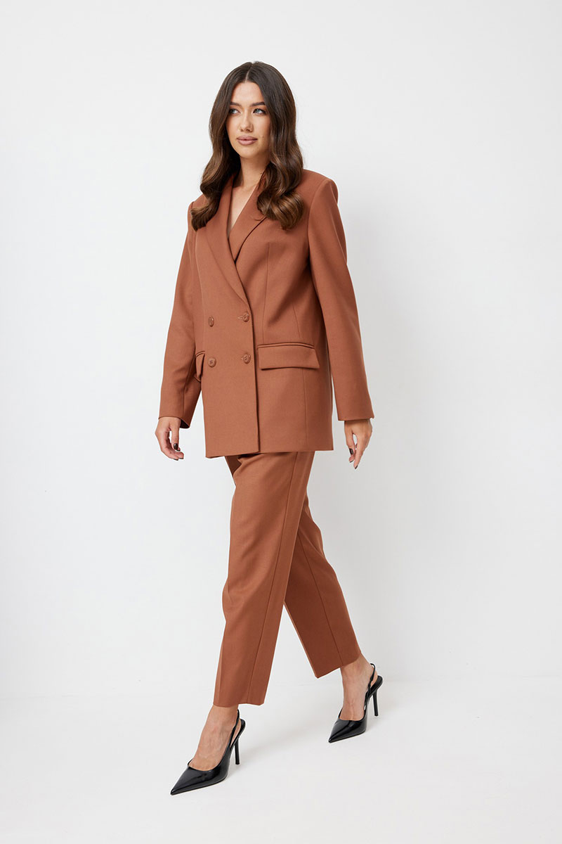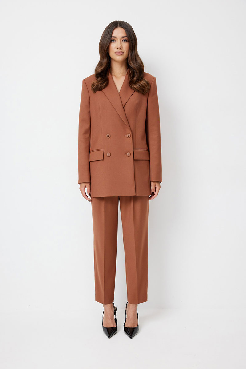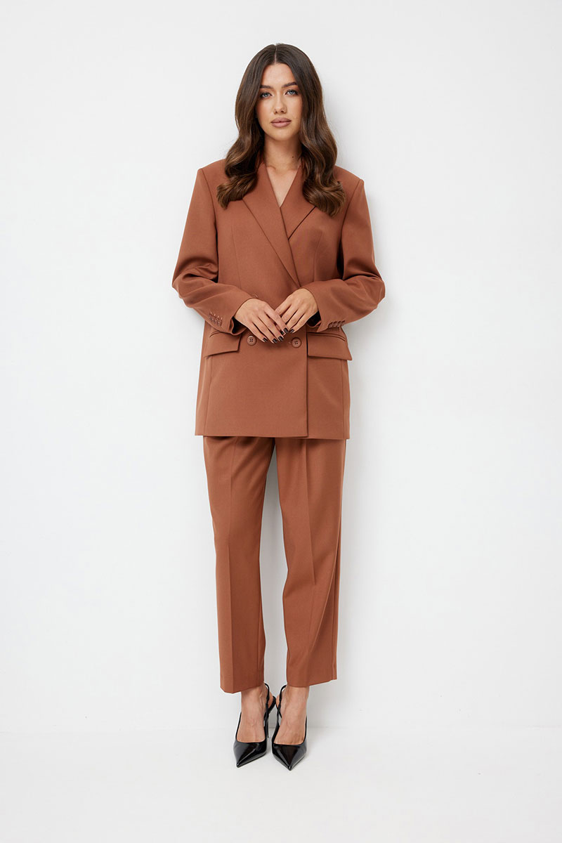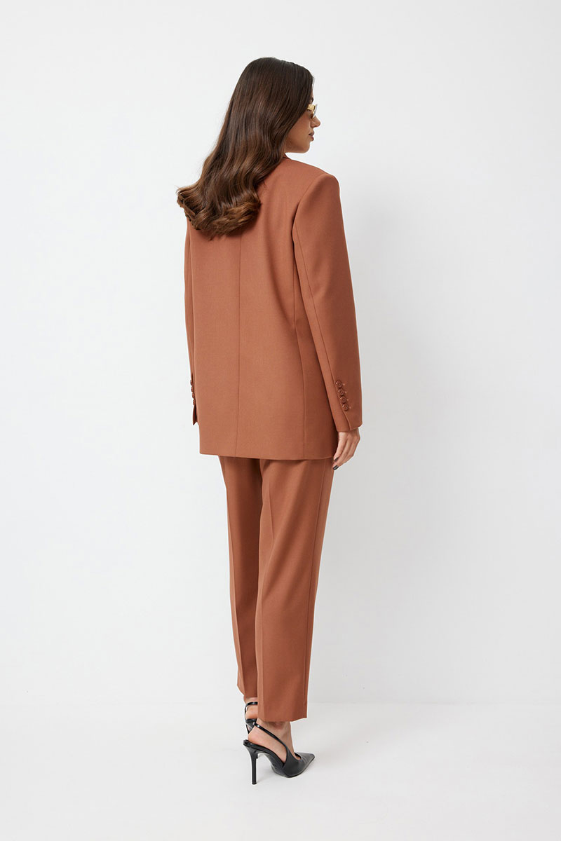 Брюки женские, зауженные к низу, выполнены из костюмной ткани. Пояс притачной с застежкой на петлю и пуговицу. Застежка на тесьму-молнию. По передним полотнищам заложены