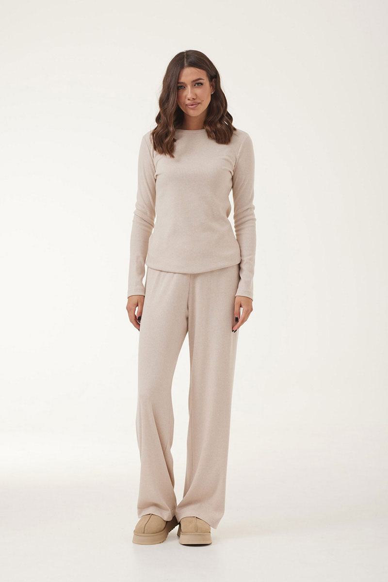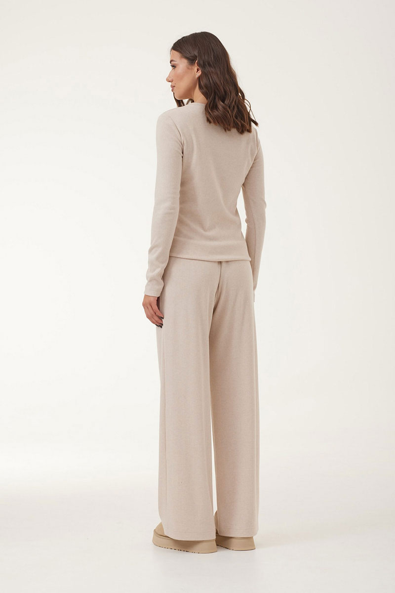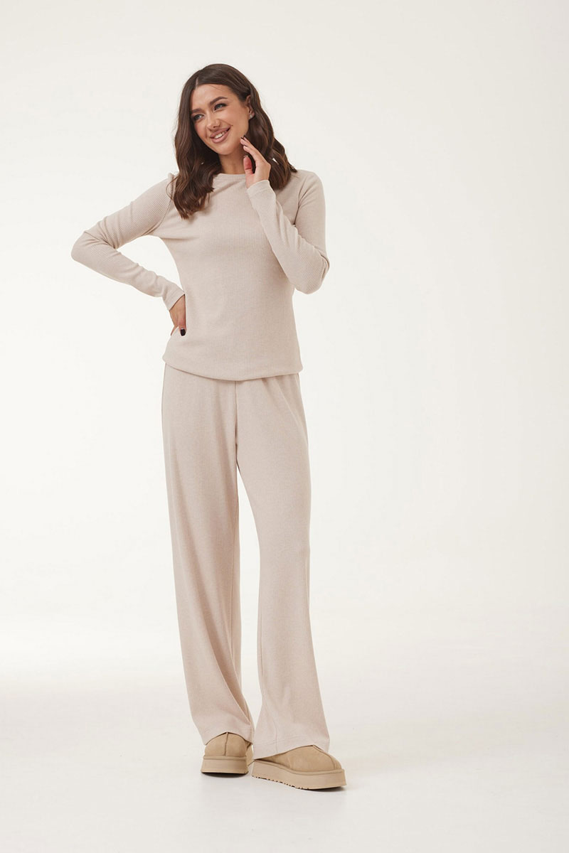 Комплект женский двухпредметный, выполнен из мягкого трикотажного полотна бежевого цвета. Комплект состоит из джемпера и брюк.