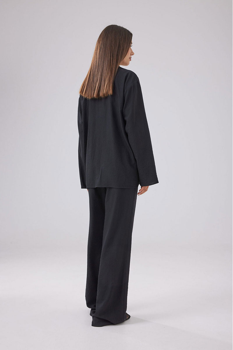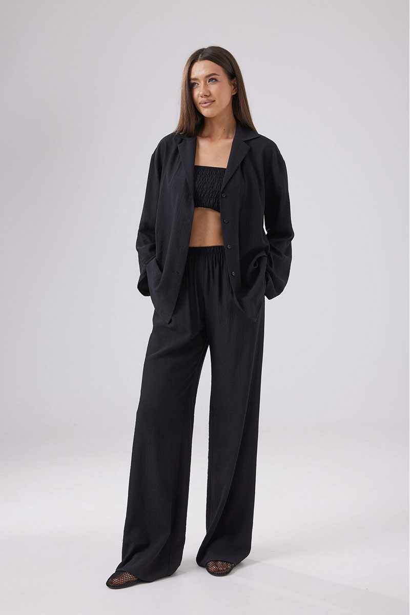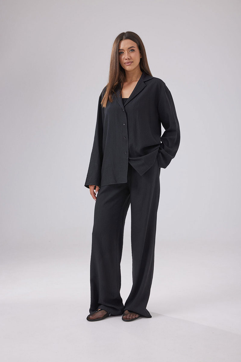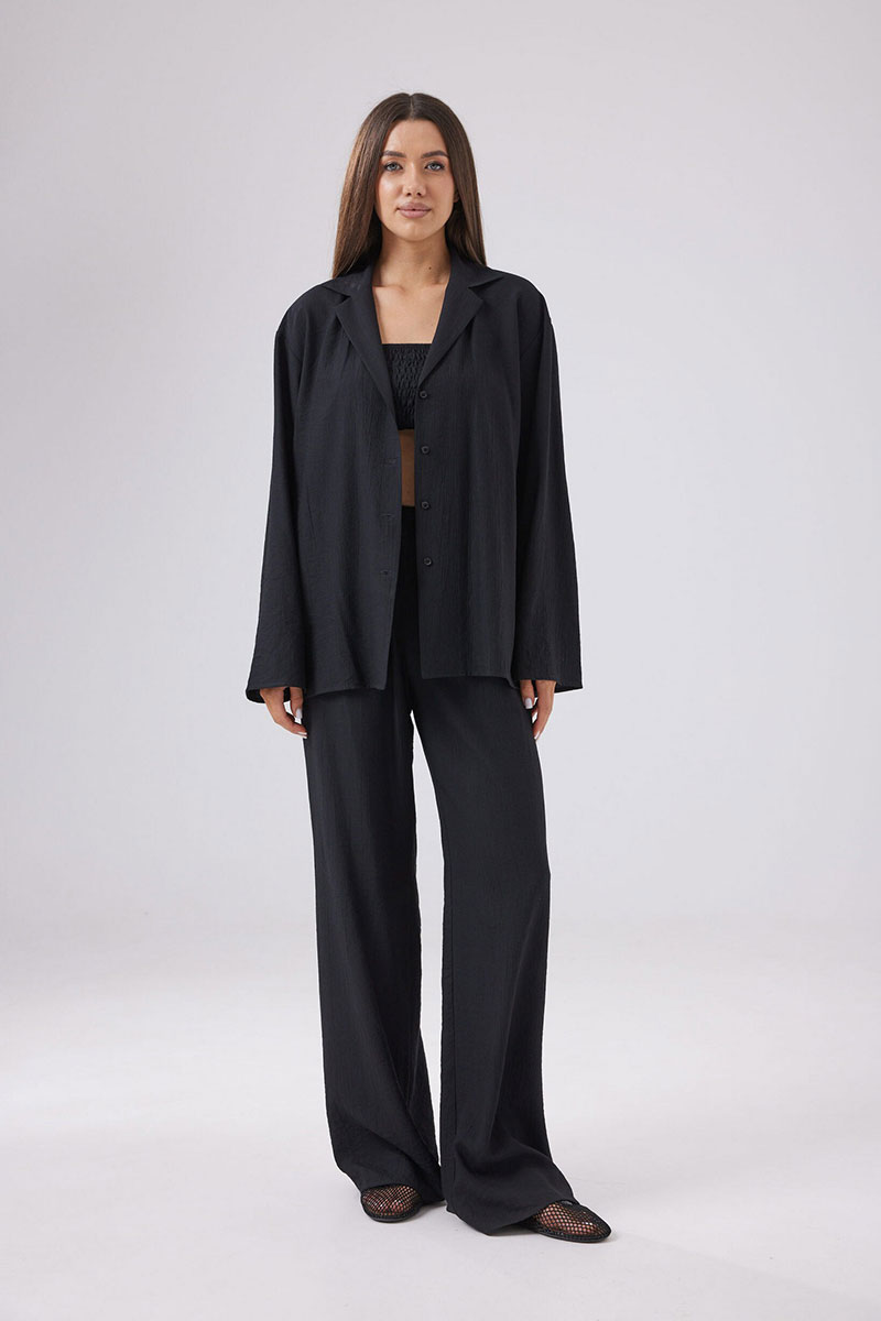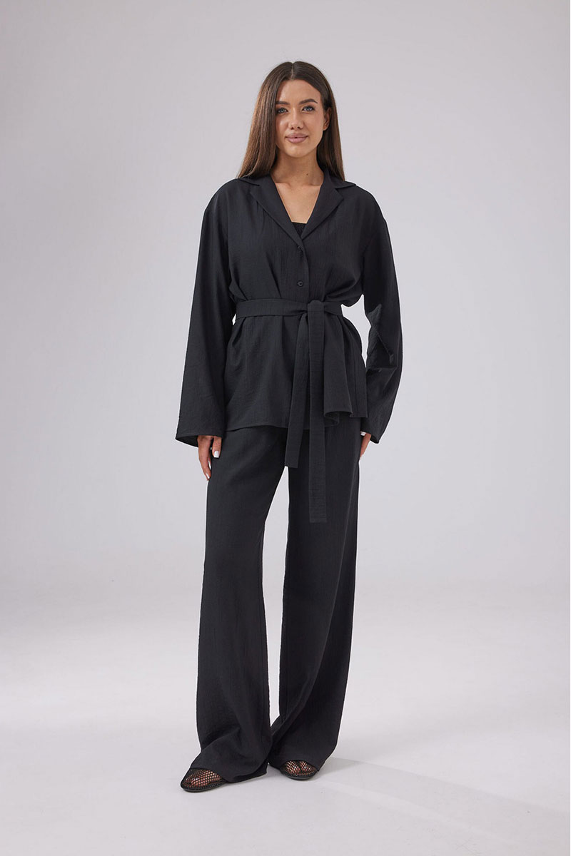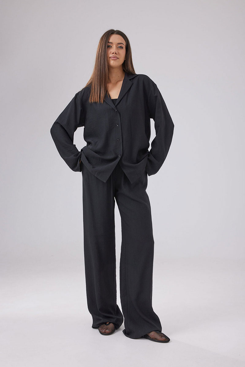 Летний женский комплект из вискозной ткани с эффектом мятости. В комплект входят блуза и брюки.