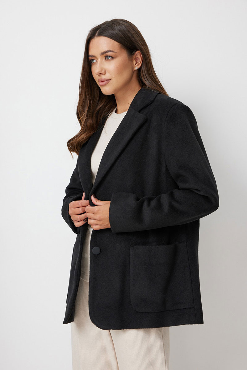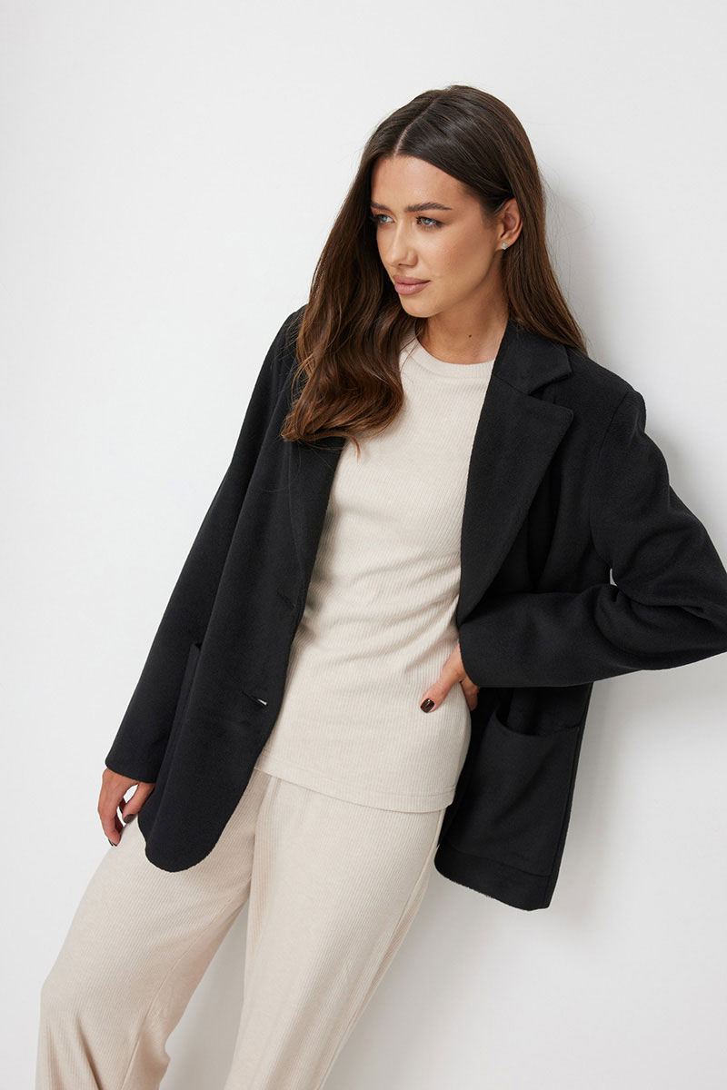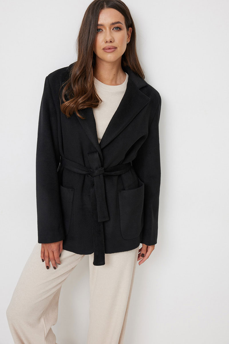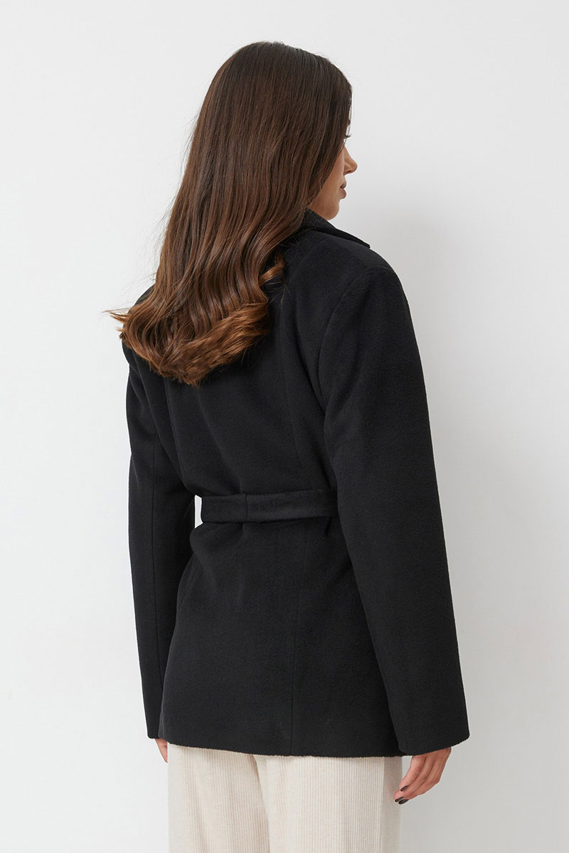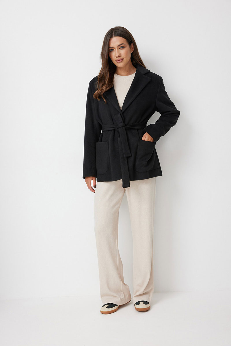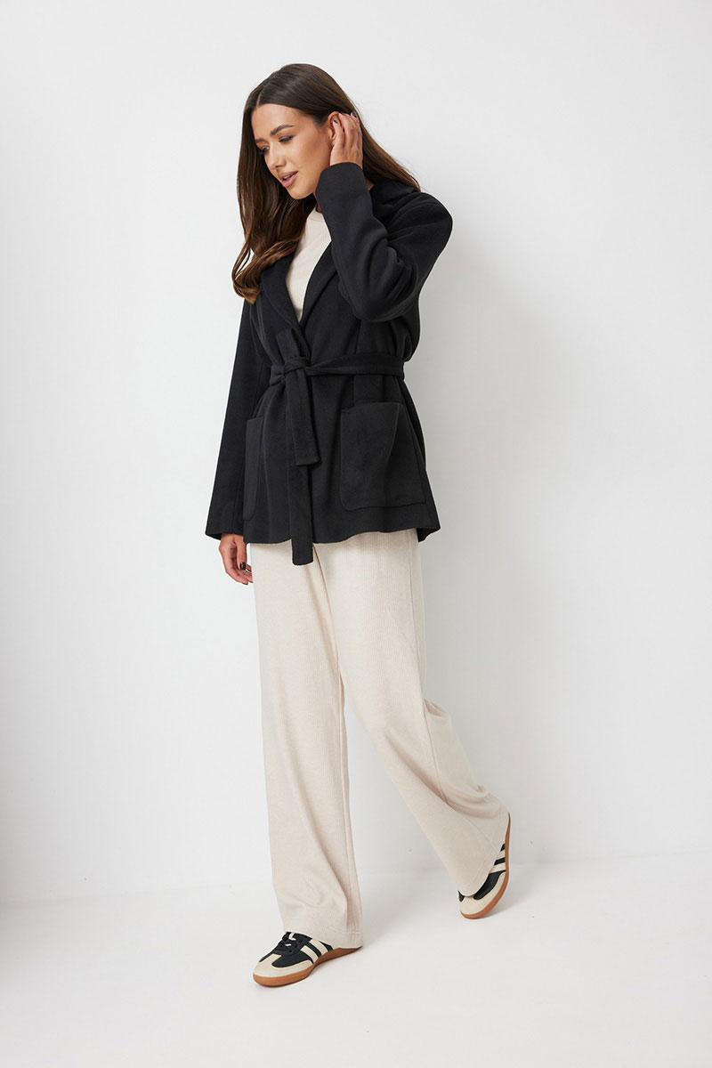 Жакет женский прямого силуэта, выполненный из ворсовой ткани. Жакет свободный. Застежка однобортная на две петли и пуговицы. Воротник пиджачный с лацканами. По полочке накладные карманы. Рукава втачные длинные, с широкой подгибкой, которая позволяет подвернуть рукав. Прилагается съемный пояс из основной ткани. Жакет на подкладке.