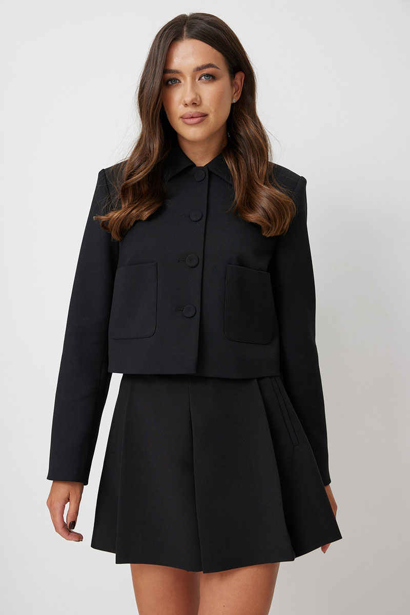 Жакет женский выполнен из костюмной ткани черного цвета. Жакет прямого силуэта, укороченный, на подкладке. Вырез горловины округлый, с отложным воротником. Застежка центральная на