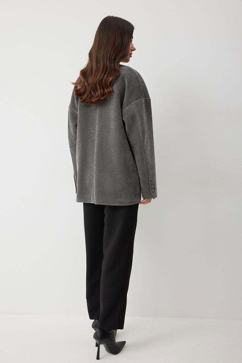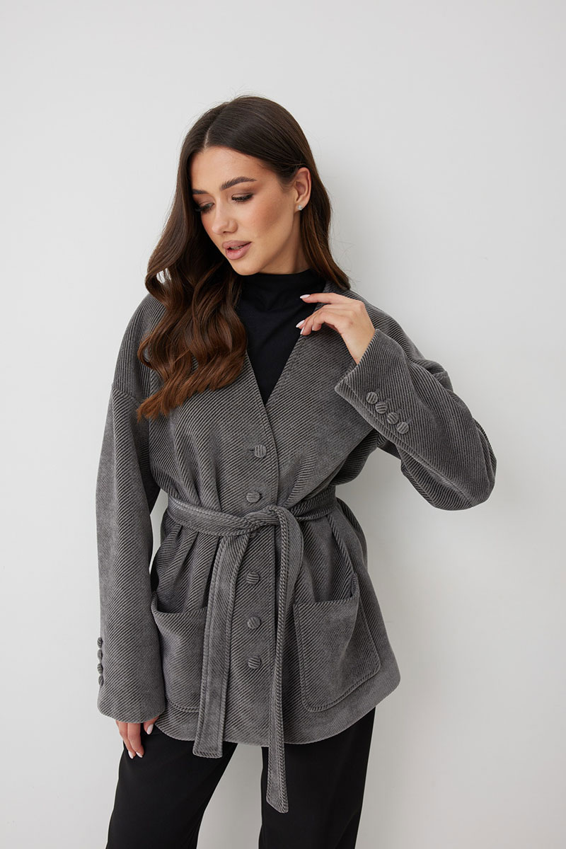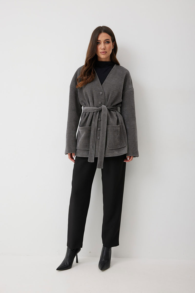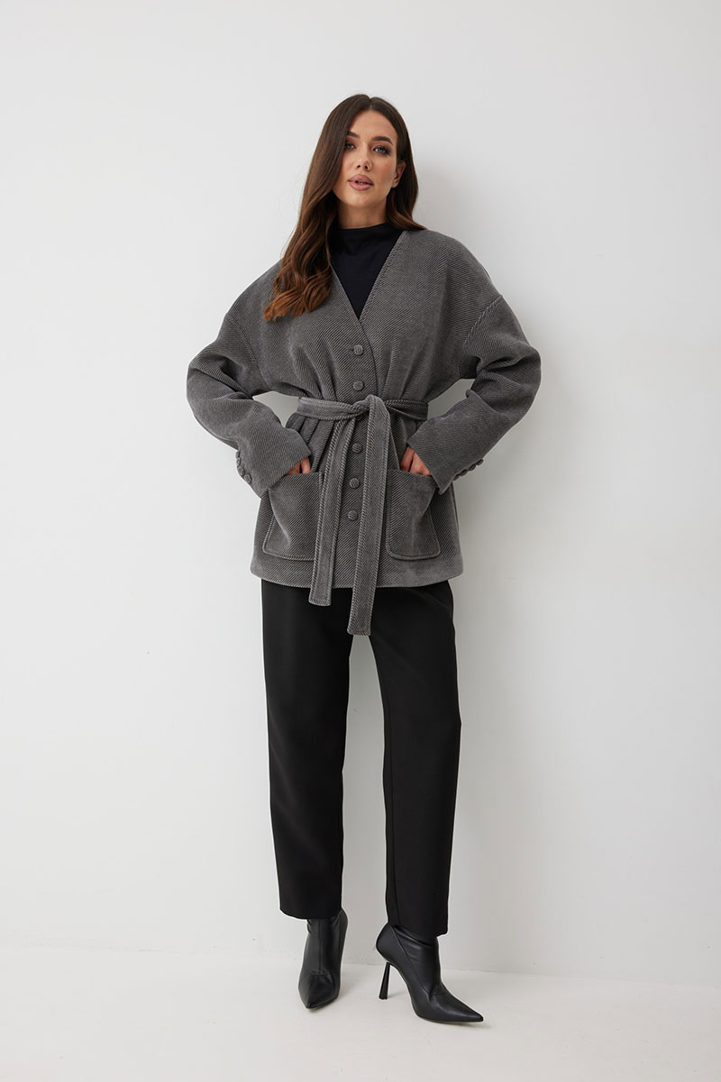 шовные со шлицей на пуговицах снизу. Спинка прямая со средним швом. В комплекте идет пояс из основной ткани, который позволяет моментально изменить образ: носите кардиган свободно или